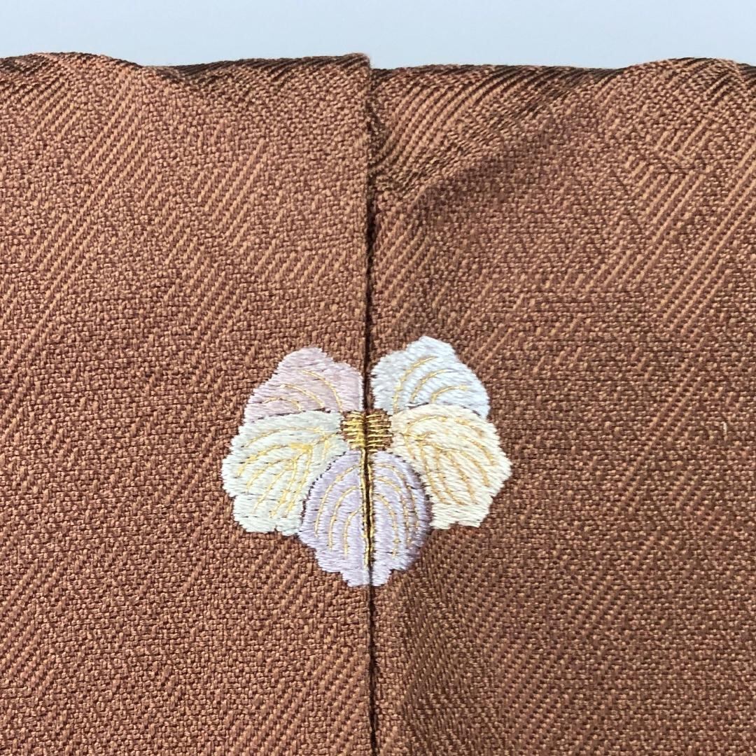 紫紺、蘇芳の染料が使われた深蘇芳色の品のあるお色味、松立涌紋の地模様、縫い紋にも手がかけられた上質で素敵なお品でございます。