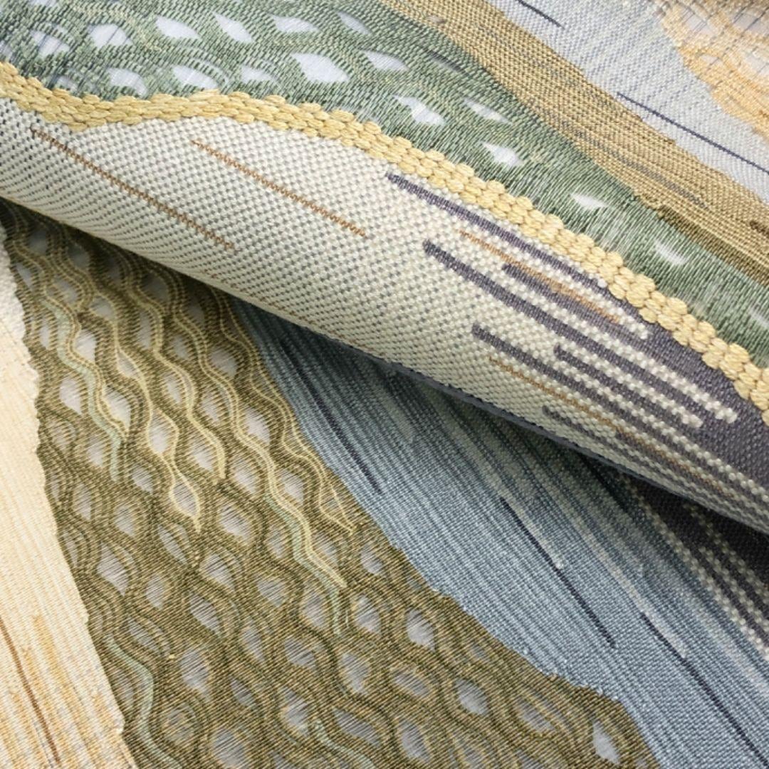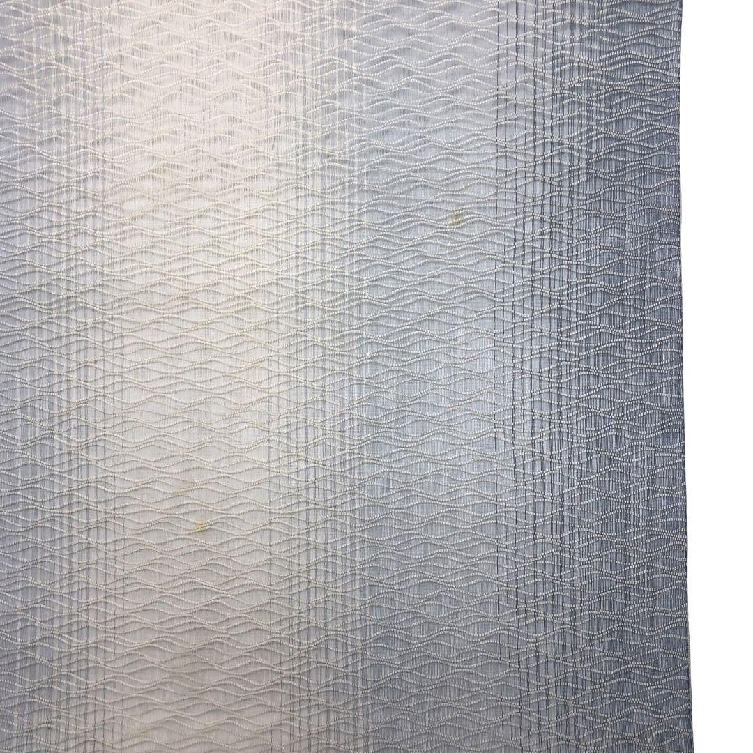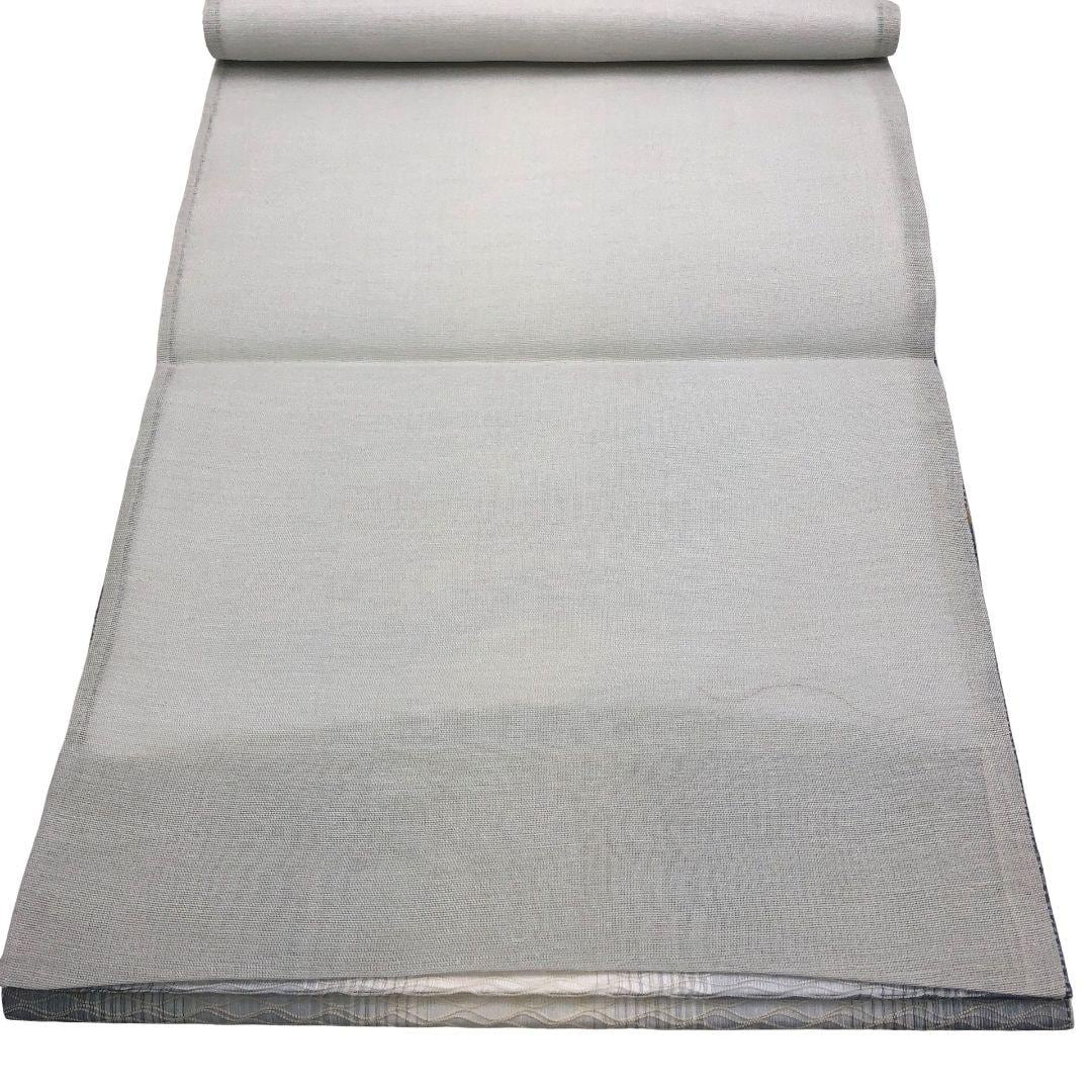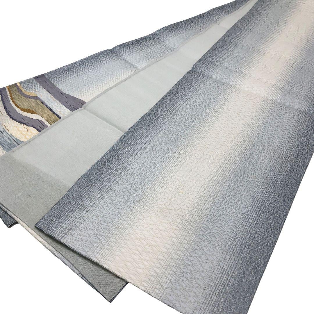 空色鼠色ベースの淡い色彩の透け感のある織模様がデザインされた素敵な柄行のお品でございます。