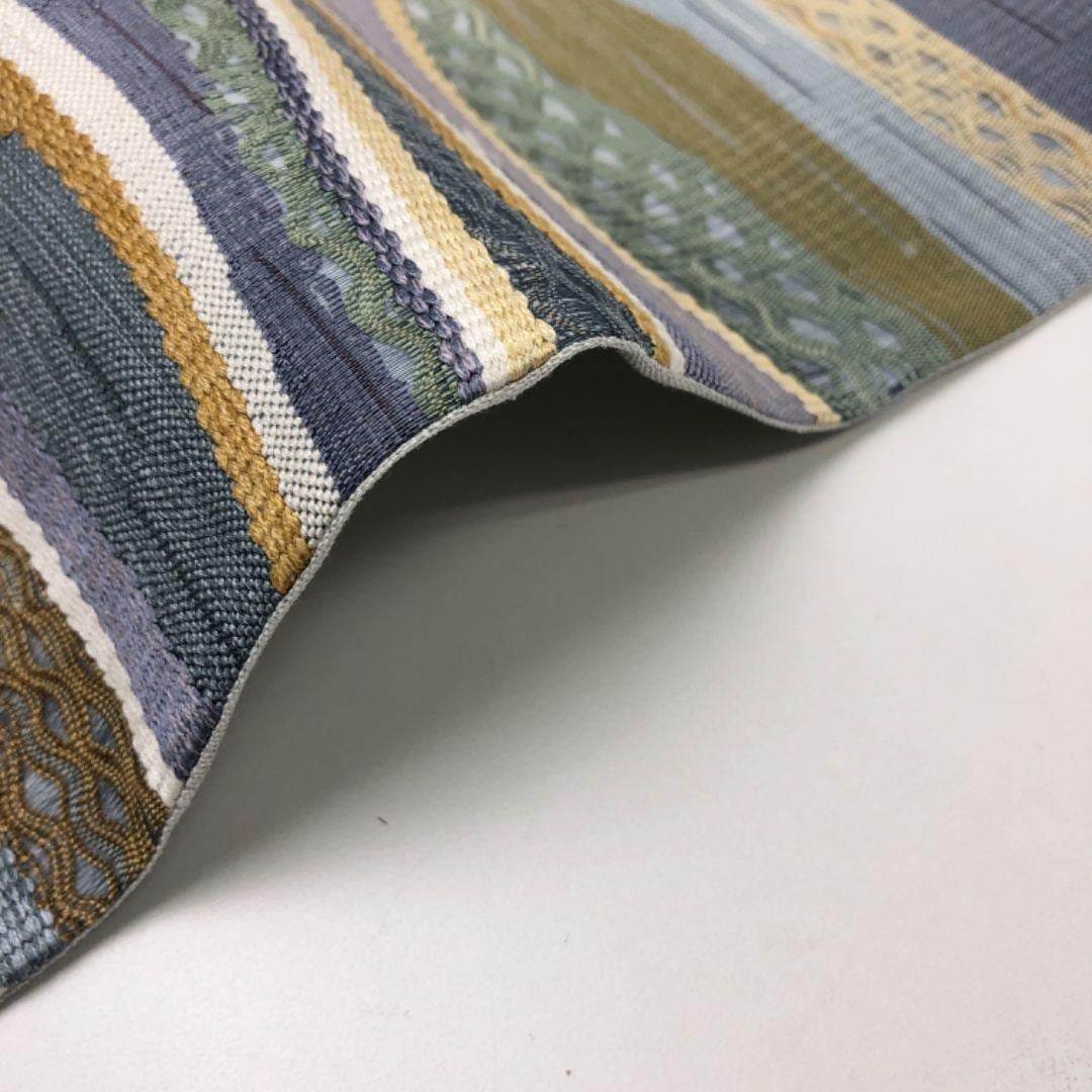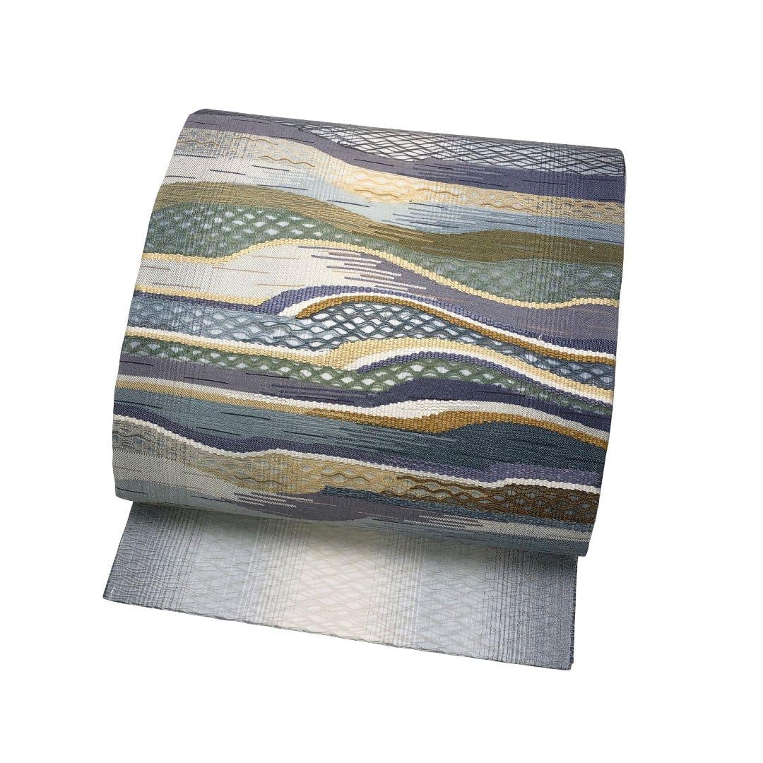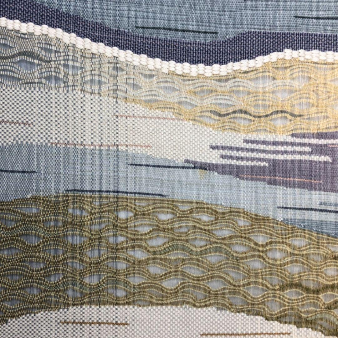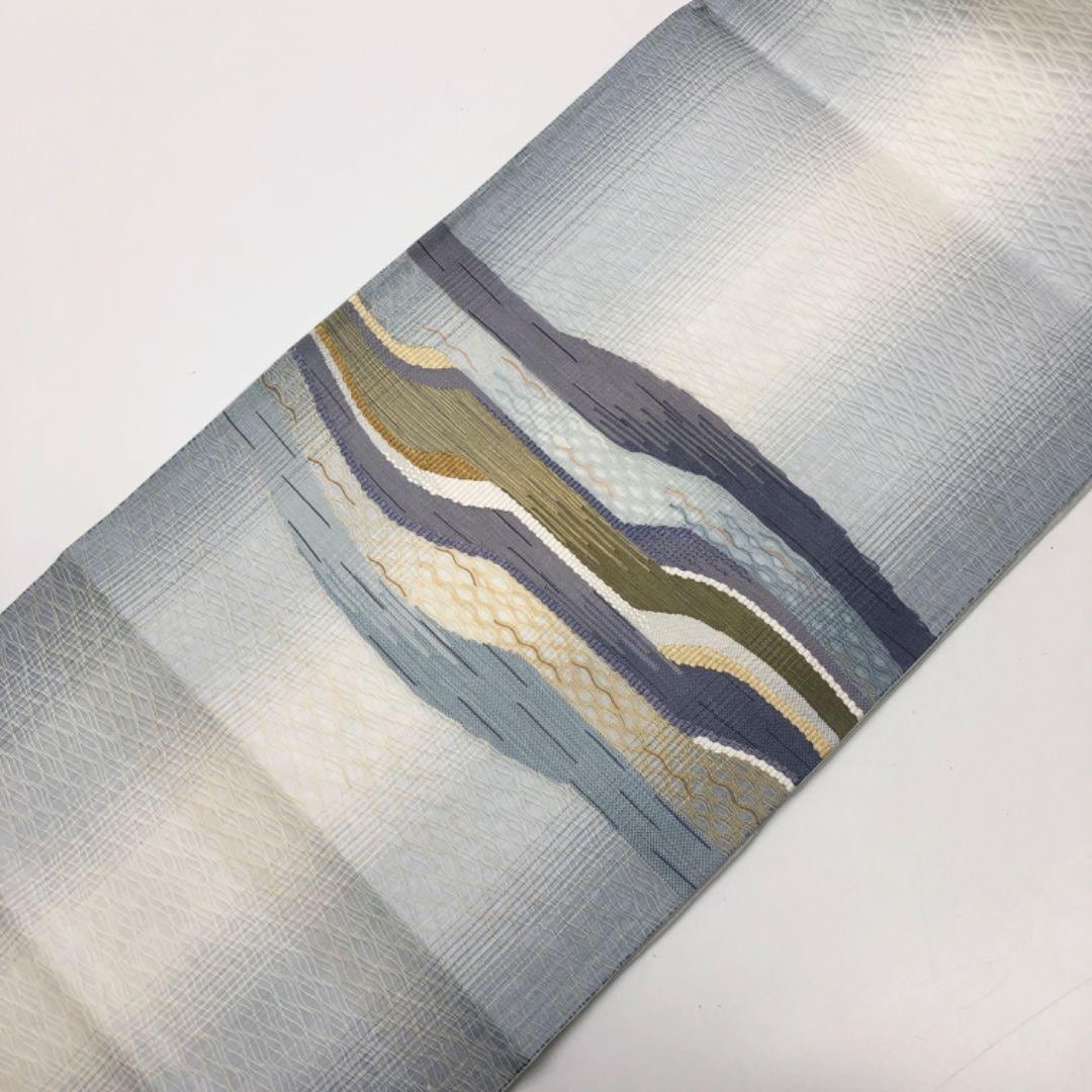 空色鼠色ベースの淡い色彩の透け感のある織模様がデザインされた素敵な柄行のお品でございます。