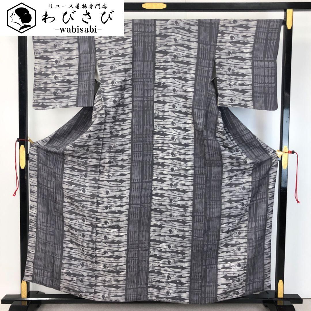 小紋 縦縞模様 モダンな抽象柄 燻銀色 縮緬 ガード加工 K-4748 着物 きもの kimono 和服 和装 中古 リサイクル着物 【送料無料】