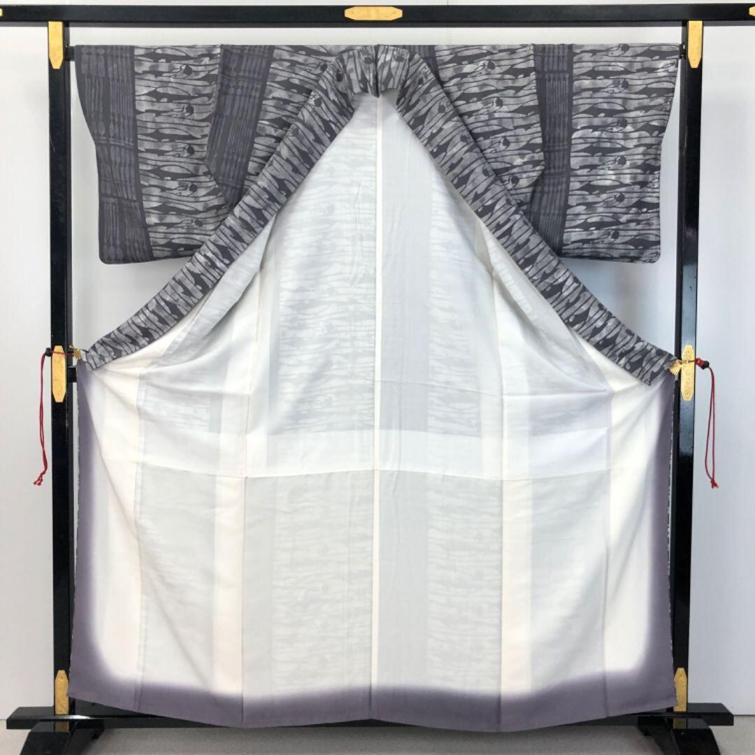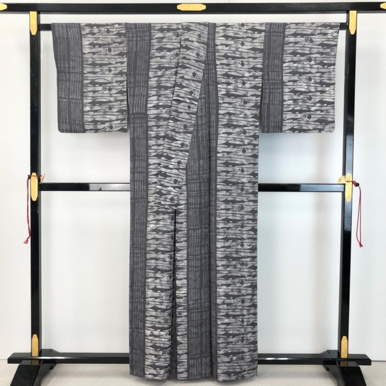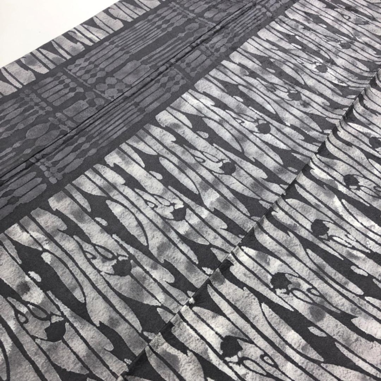 燻銀色の落ち着いたお色味に縦縞模様、モダンな抽象柄がデザインされた素敵なお品でございます。