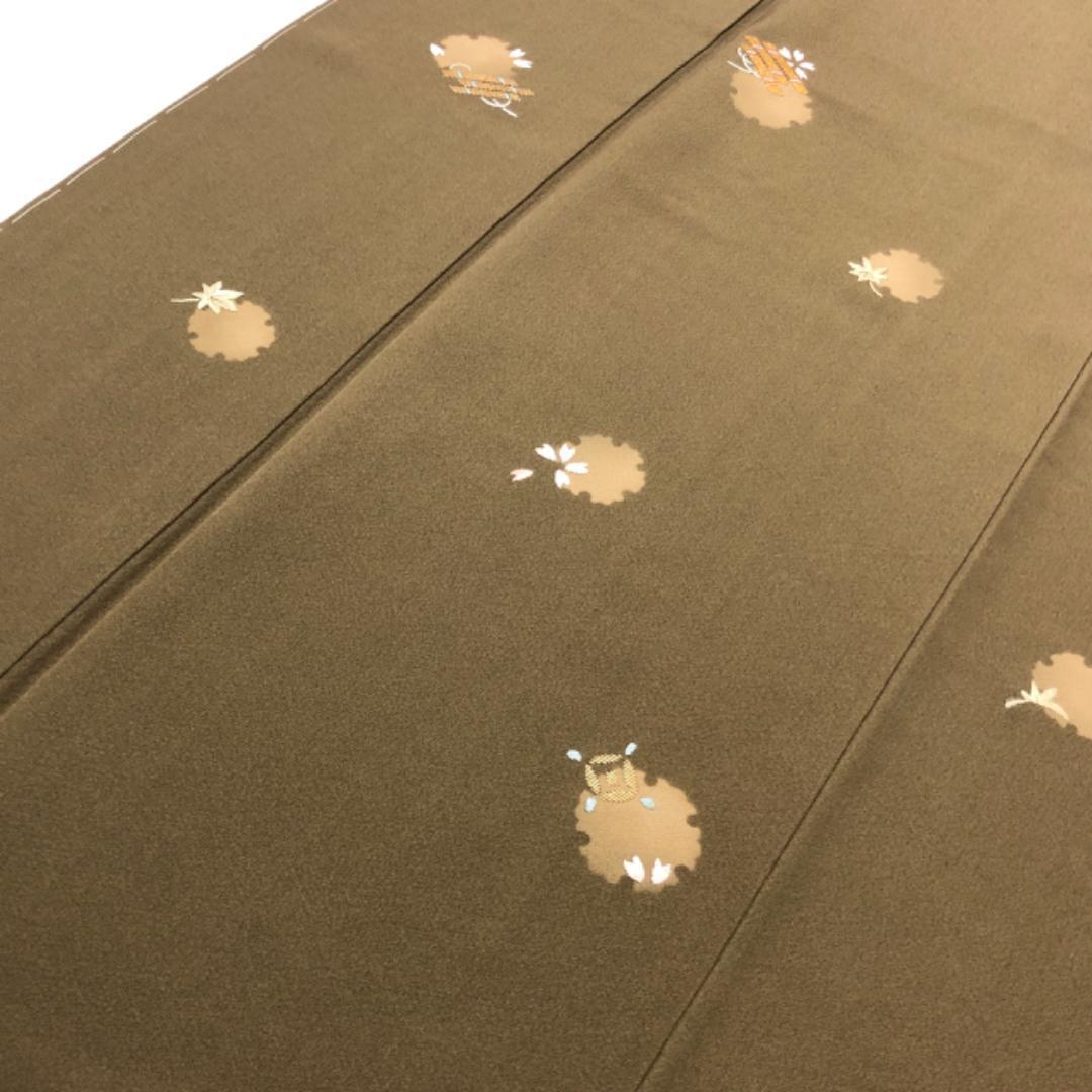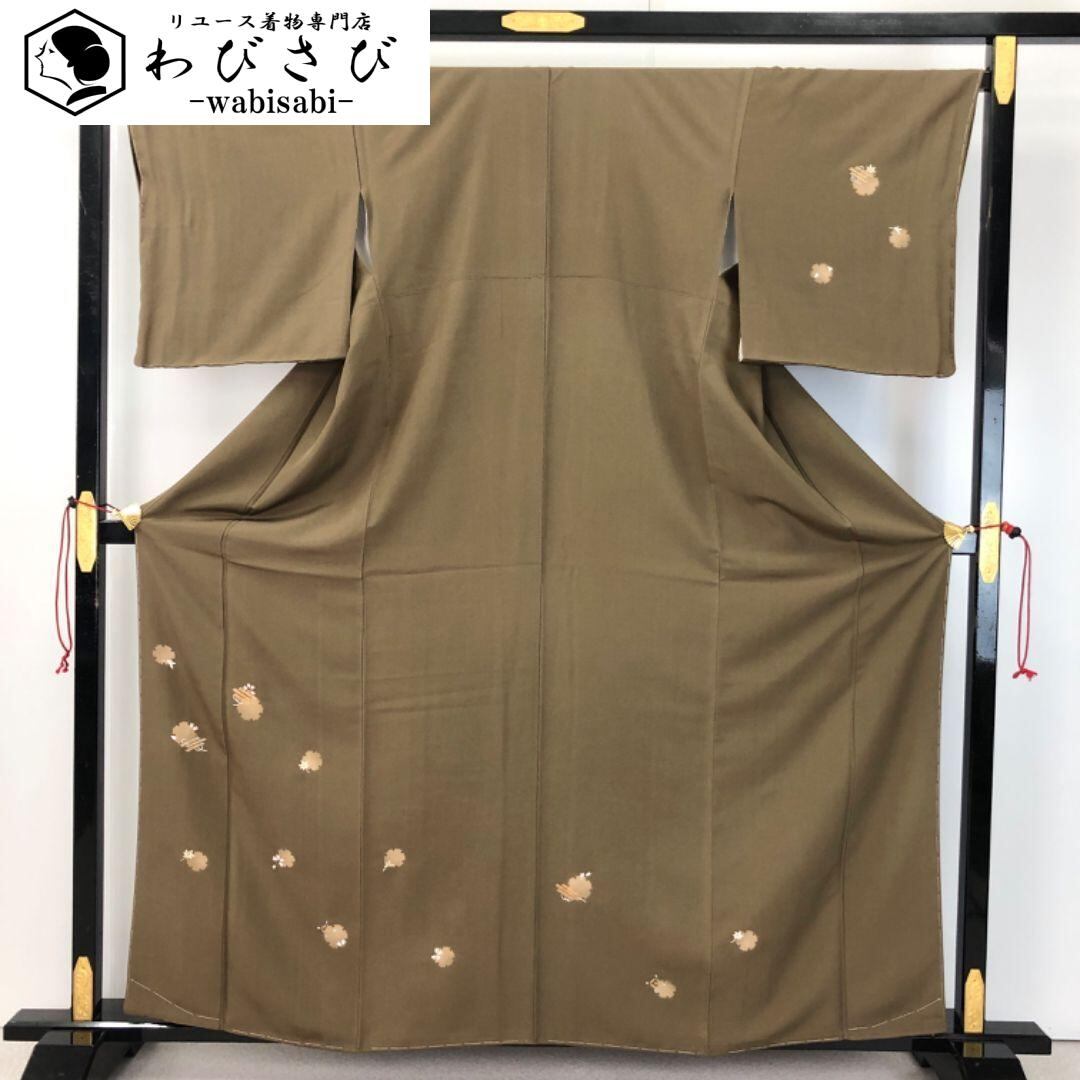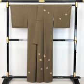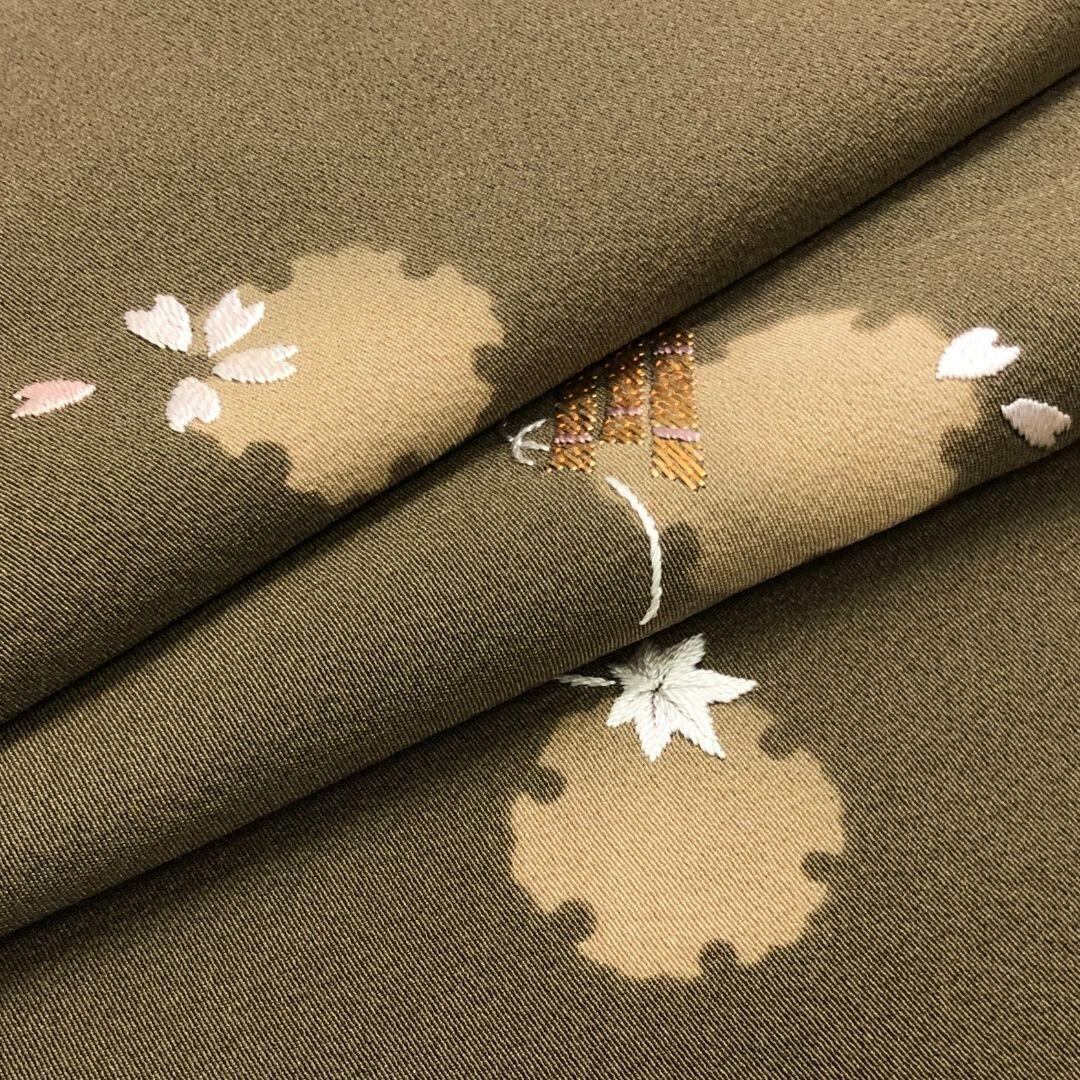 路考茶色の落ち着いたお色味、一部刺繍が使われた雪輪に花模様などの柄裄がデザインされた素敵なお品でございます。