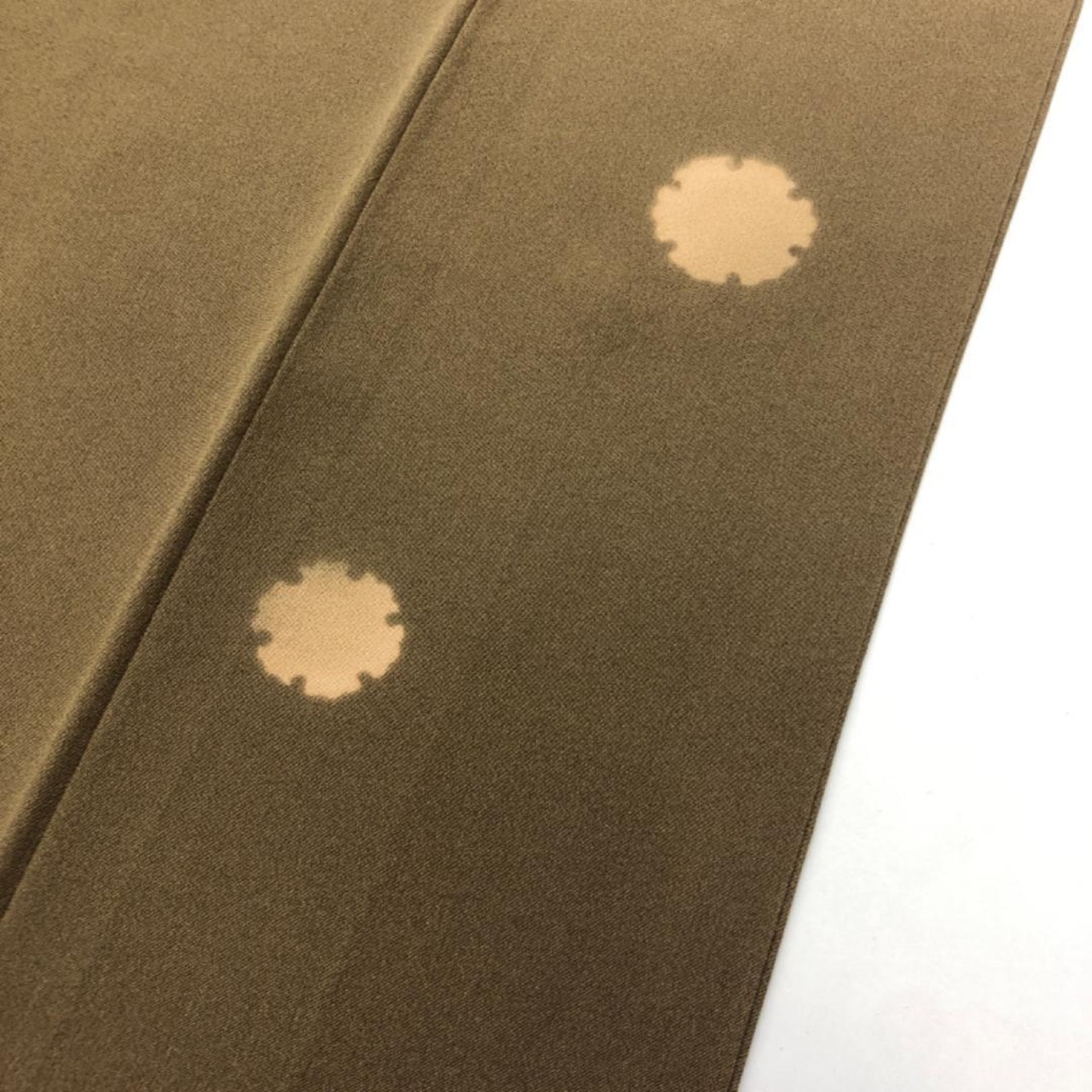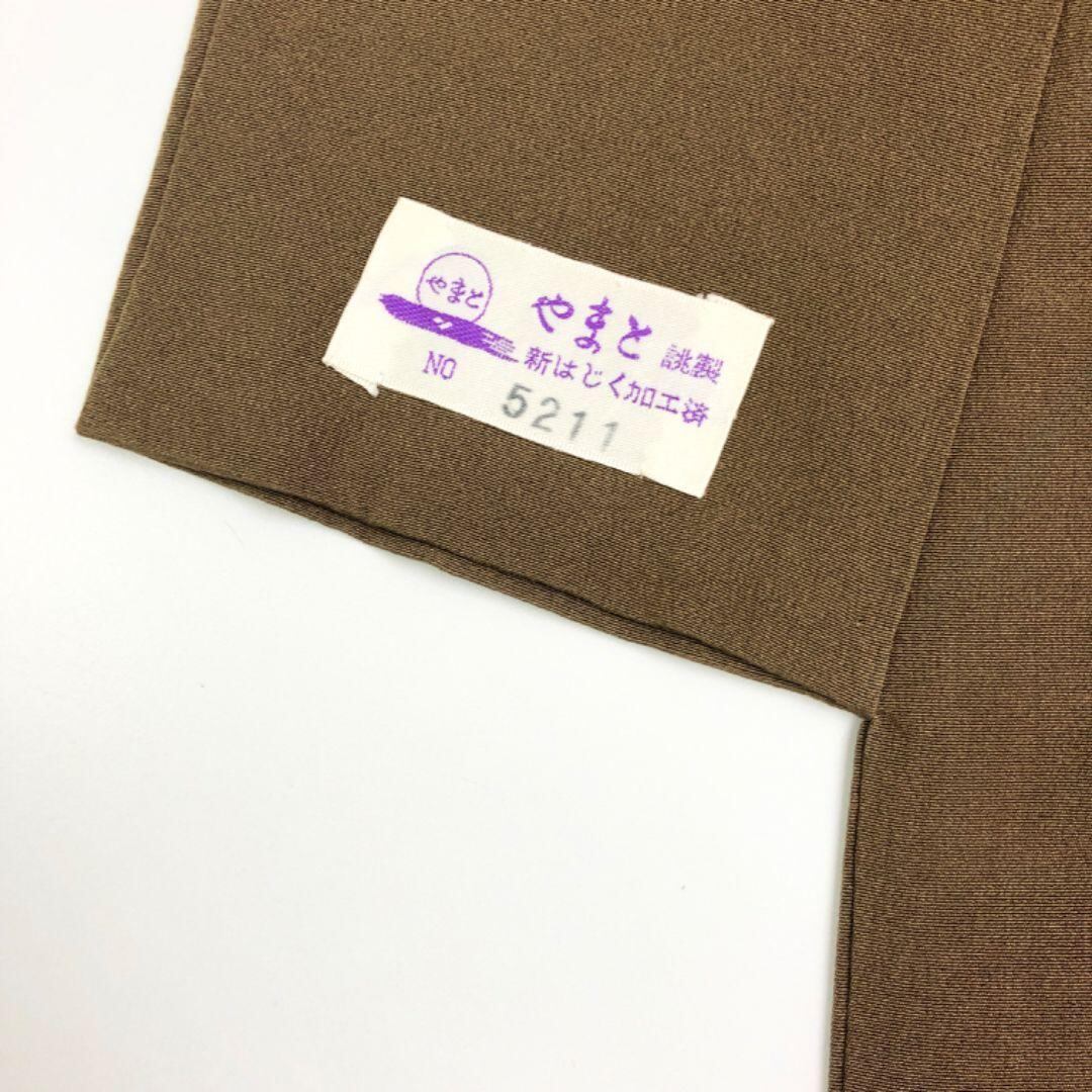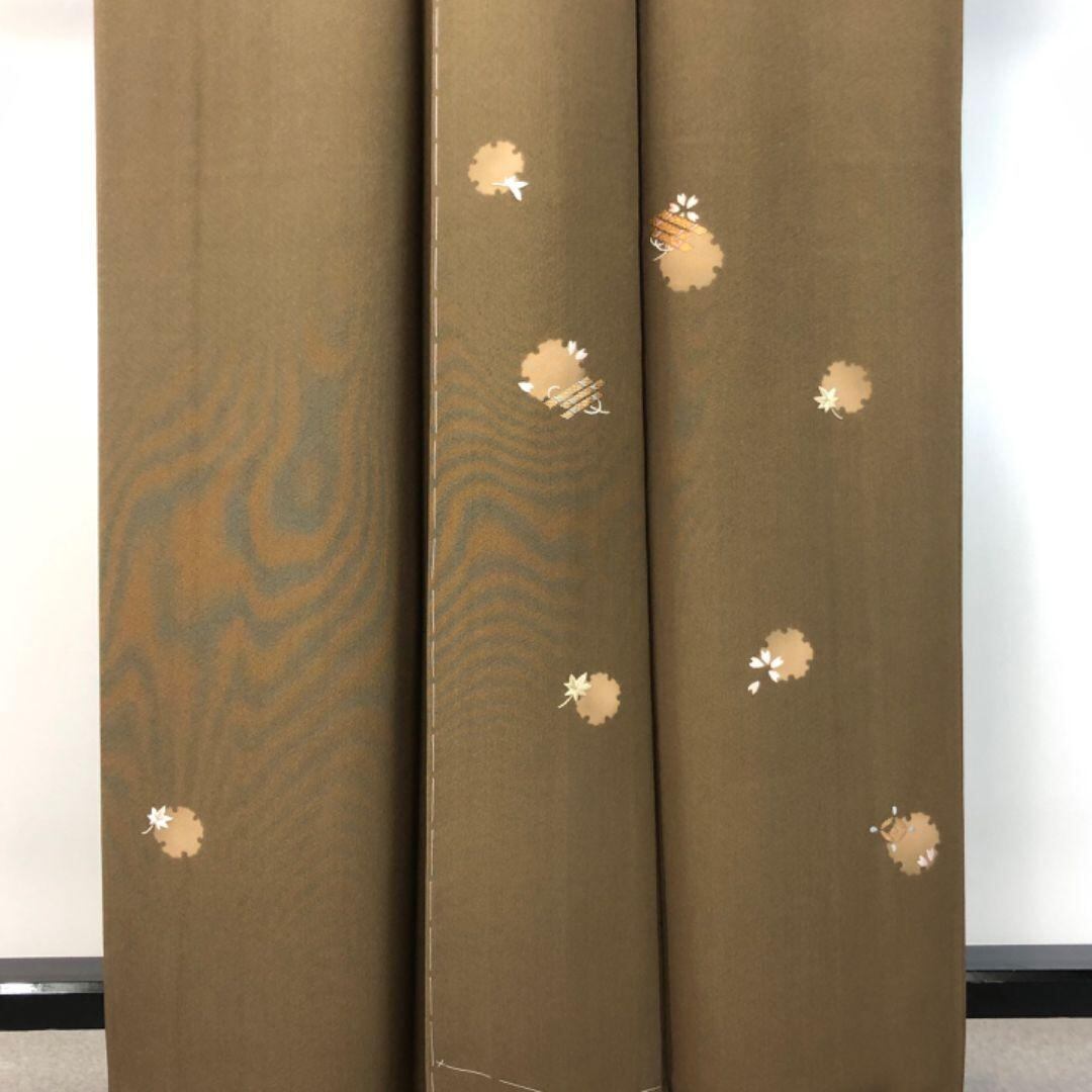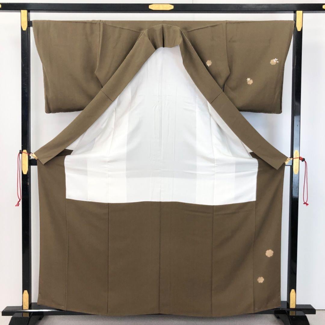 路考茶色の落ち着いたお色味、一部刺繍が使われた雪輪に花模様などの柄裄がデザインされた素敵なお品でございます。