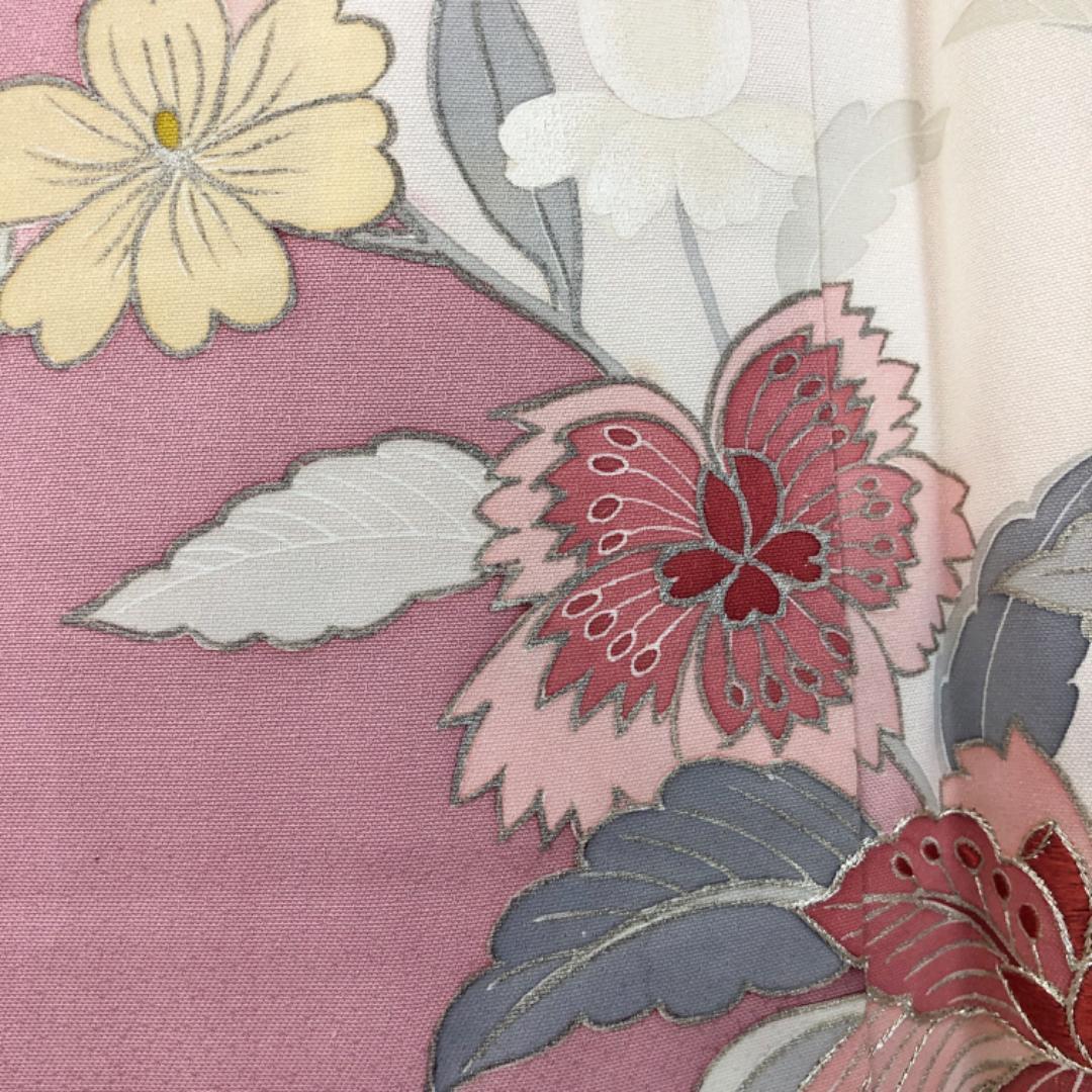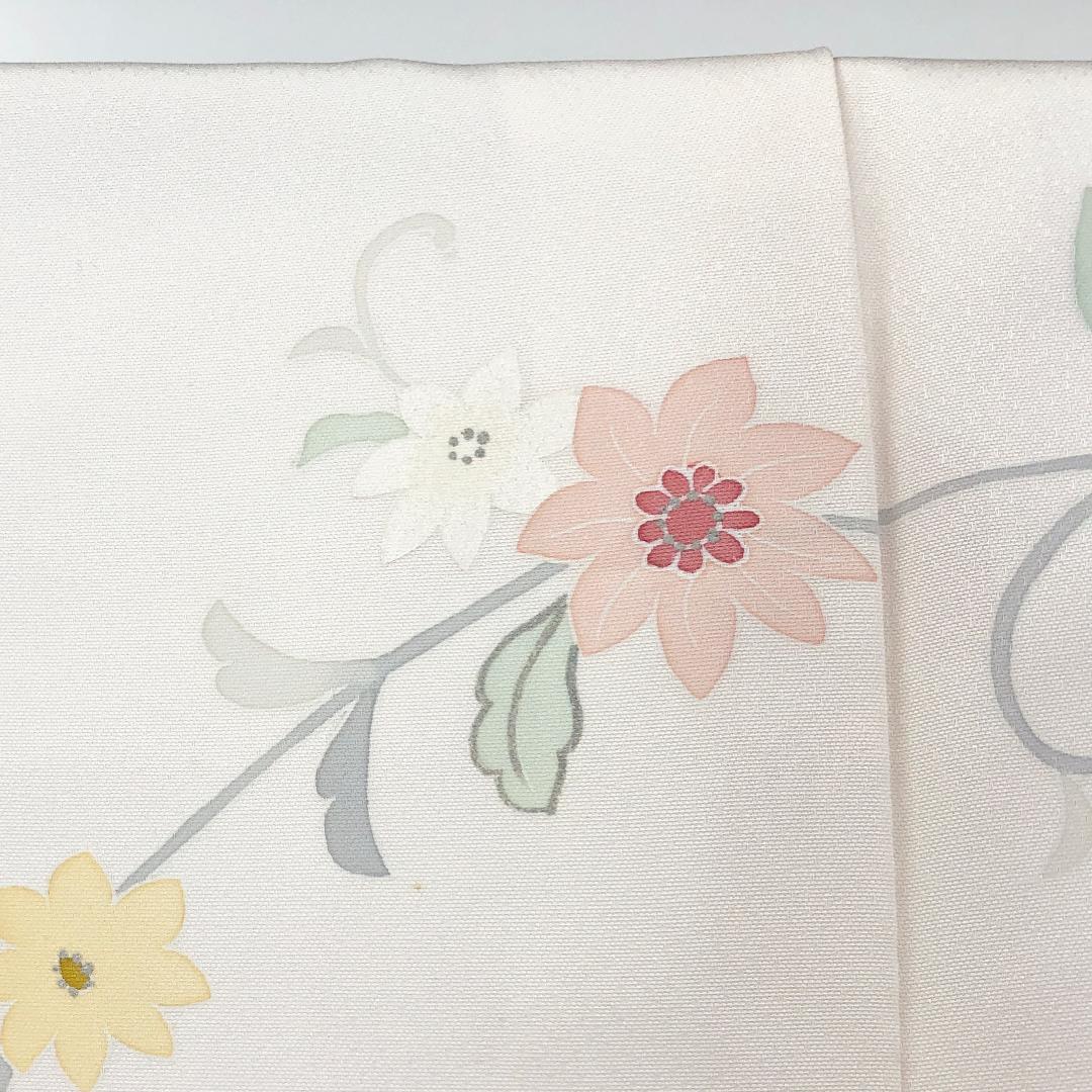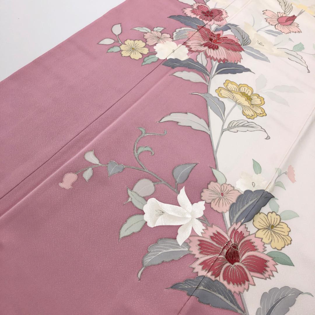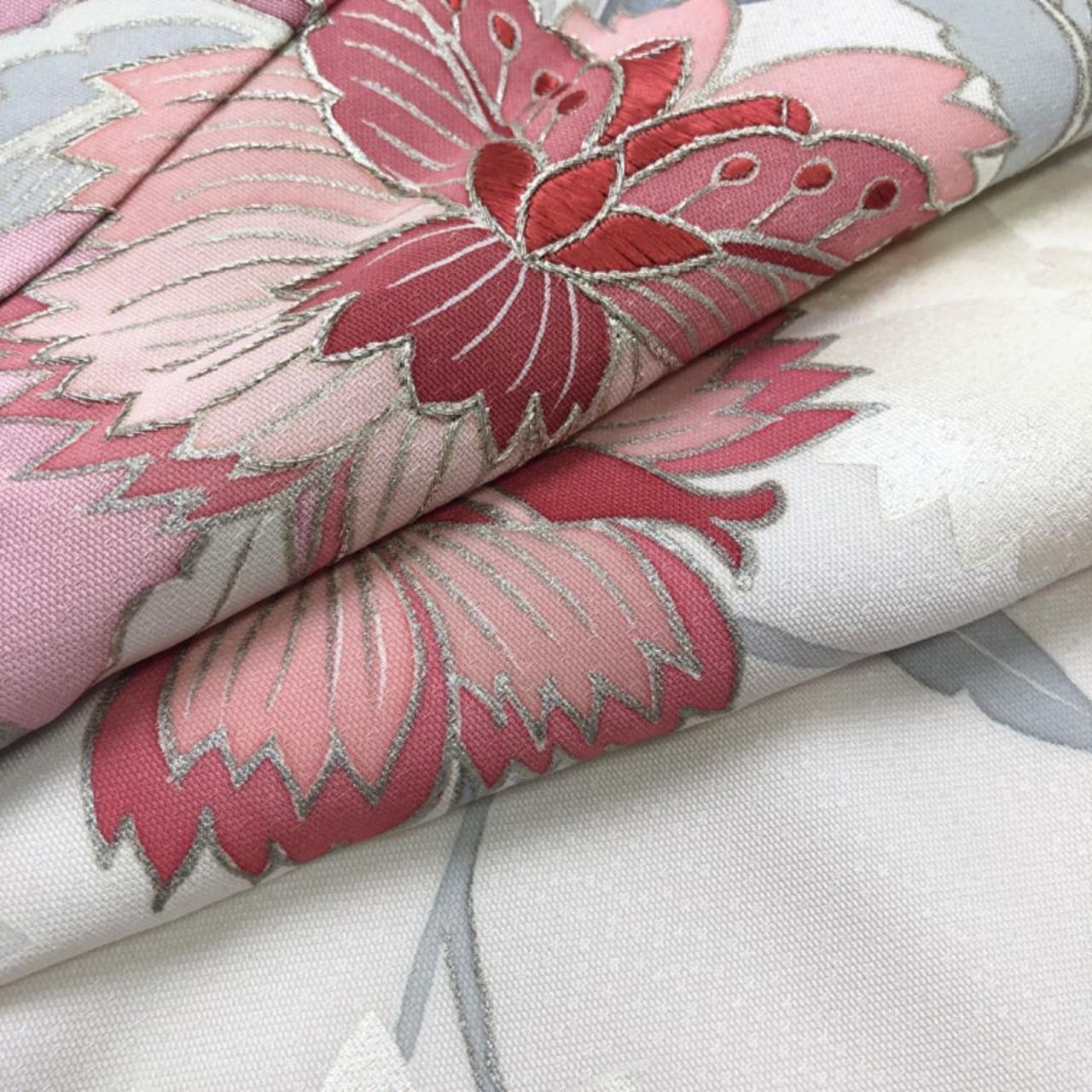 練色の上品なお色味ベースに銀駒刺繍、一部刺繍が使われた色鮮やかな花模様の柄裄がデザインされた素敵なお品でございます。