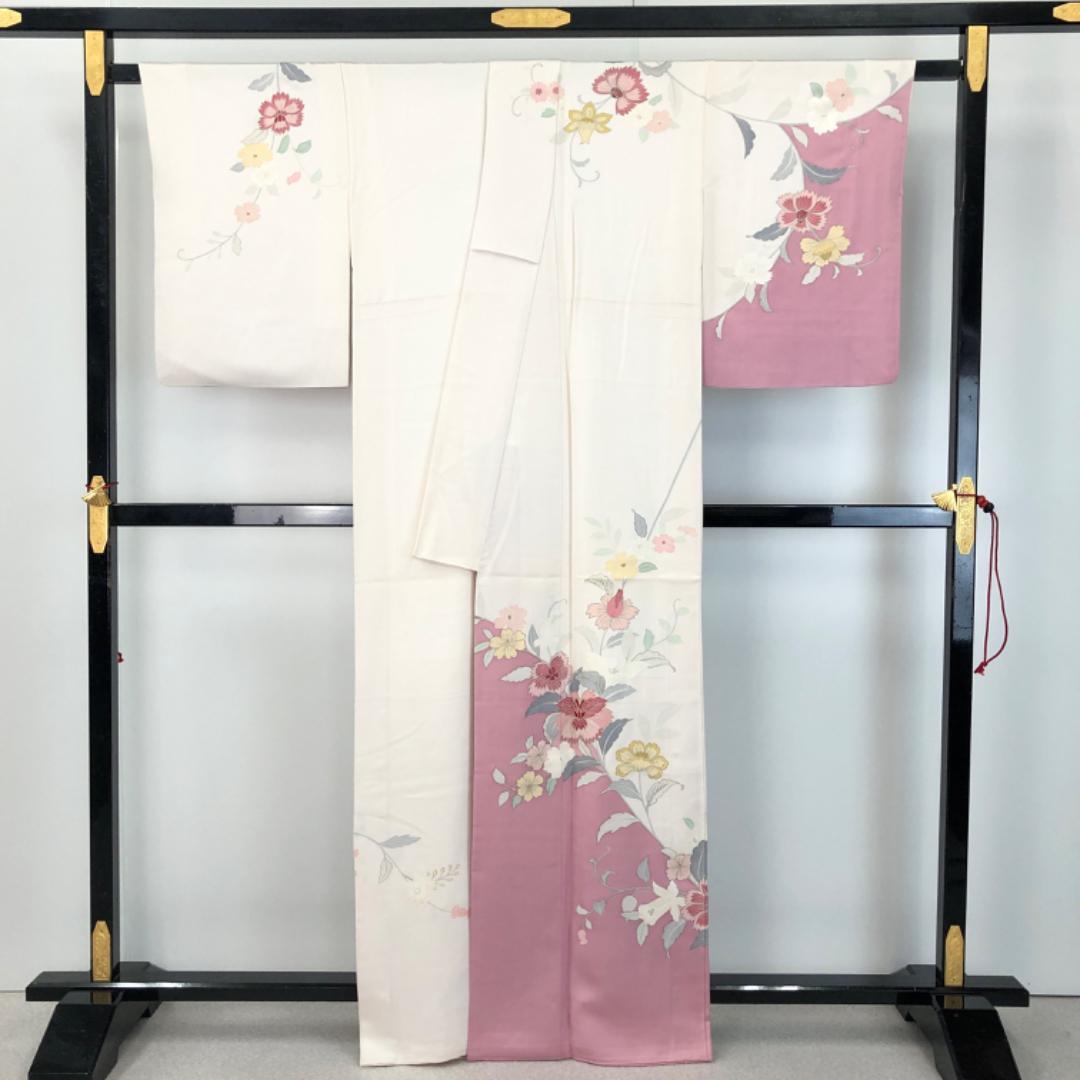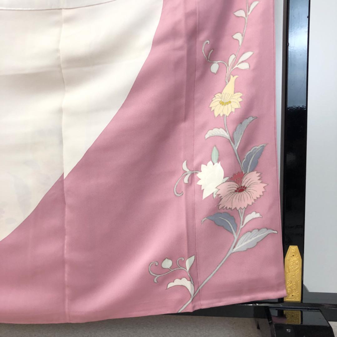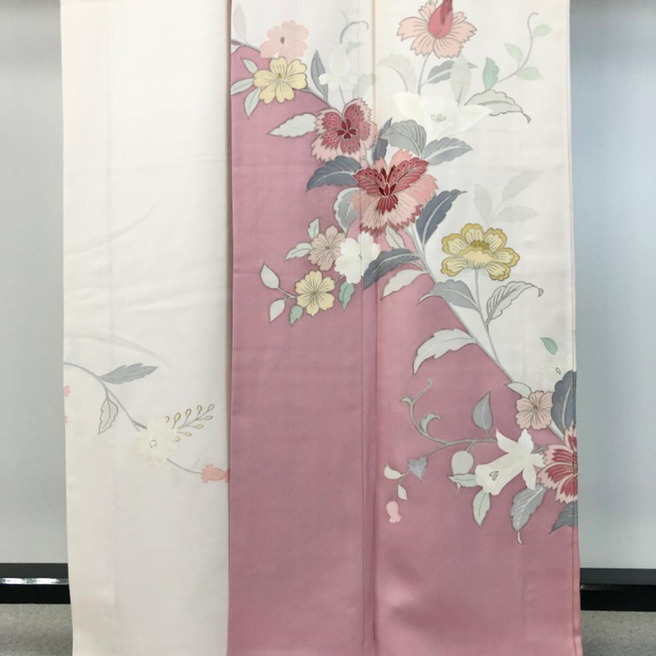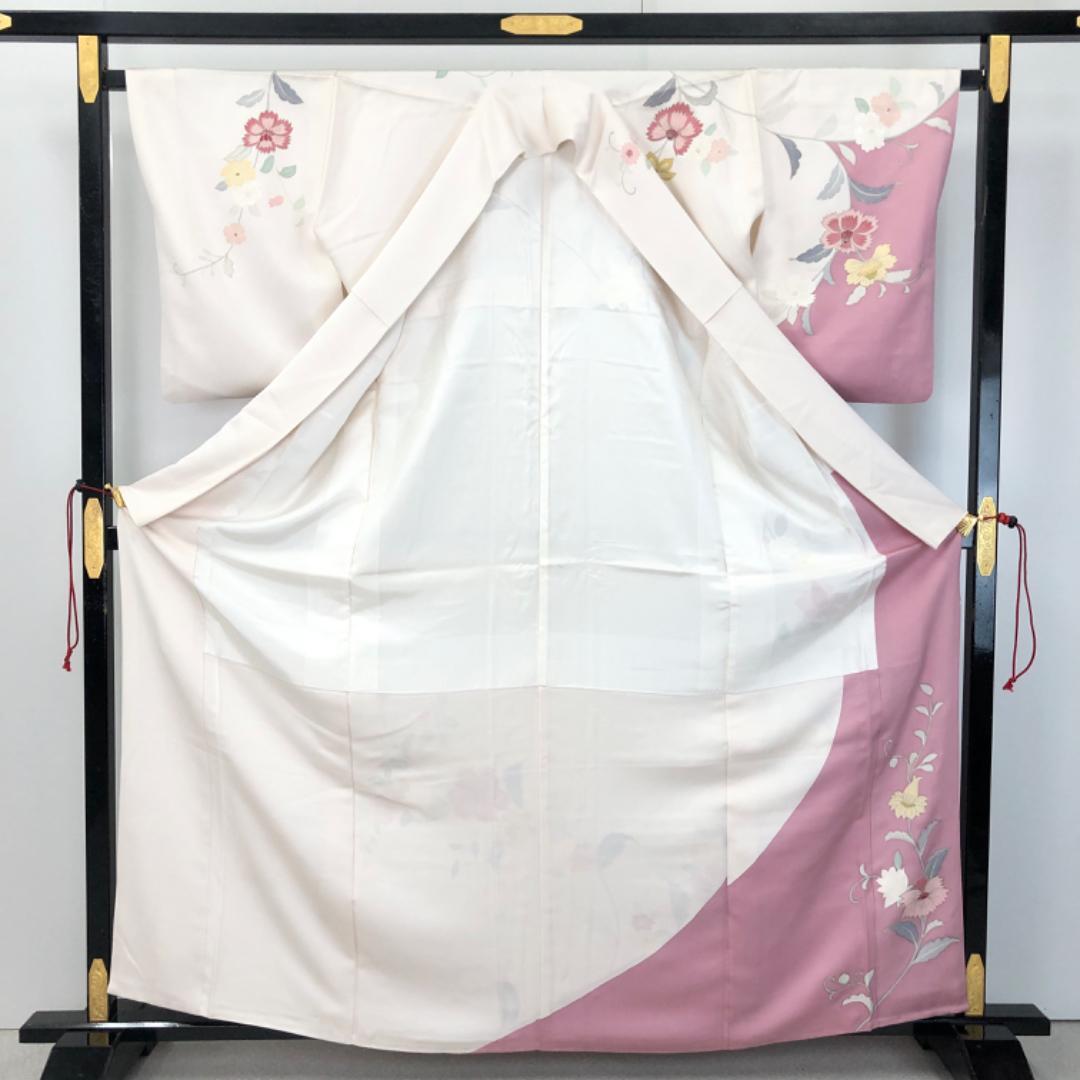練色の上品なお色味ベースに銀駒刺繍、一部刺繍が使われた色鮮やかな花模様の柄裄がデザインされた素敵なお品でございます。
