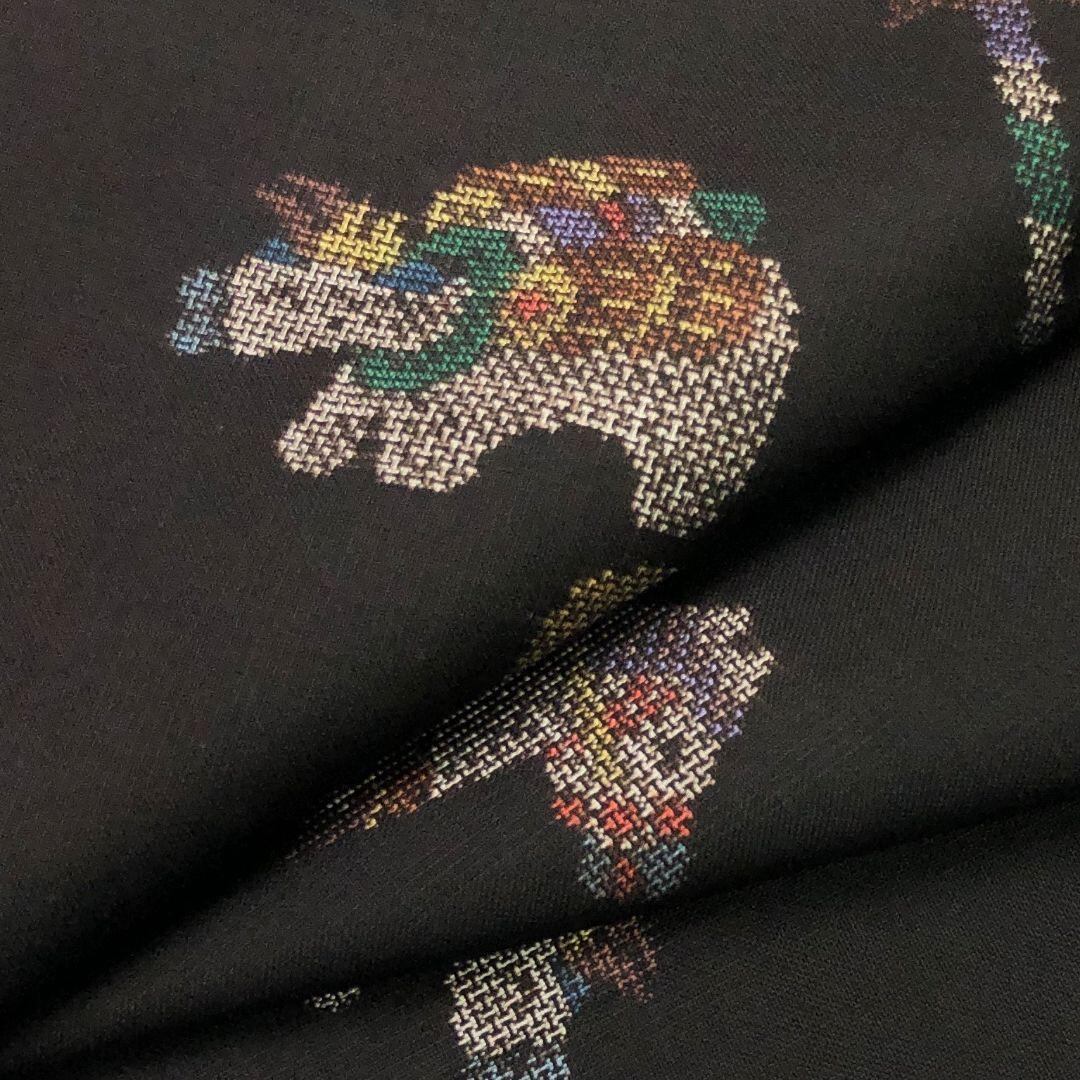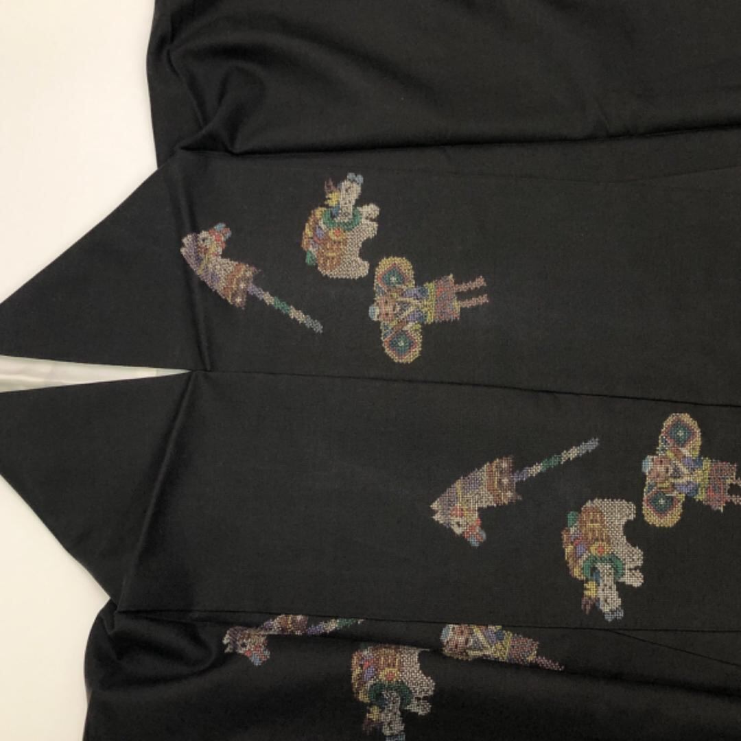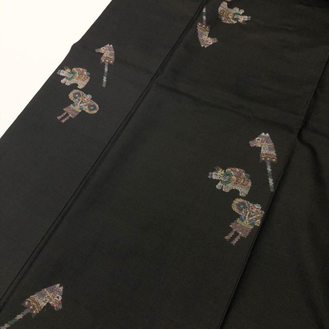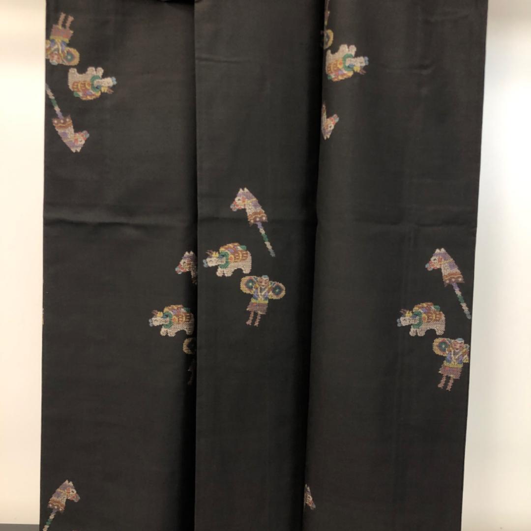 雰囲気の良い泥染の黒色ベースのお色味、和玩具の柄裄がデザインされた雰囲気の良い素敵なお品でございます。