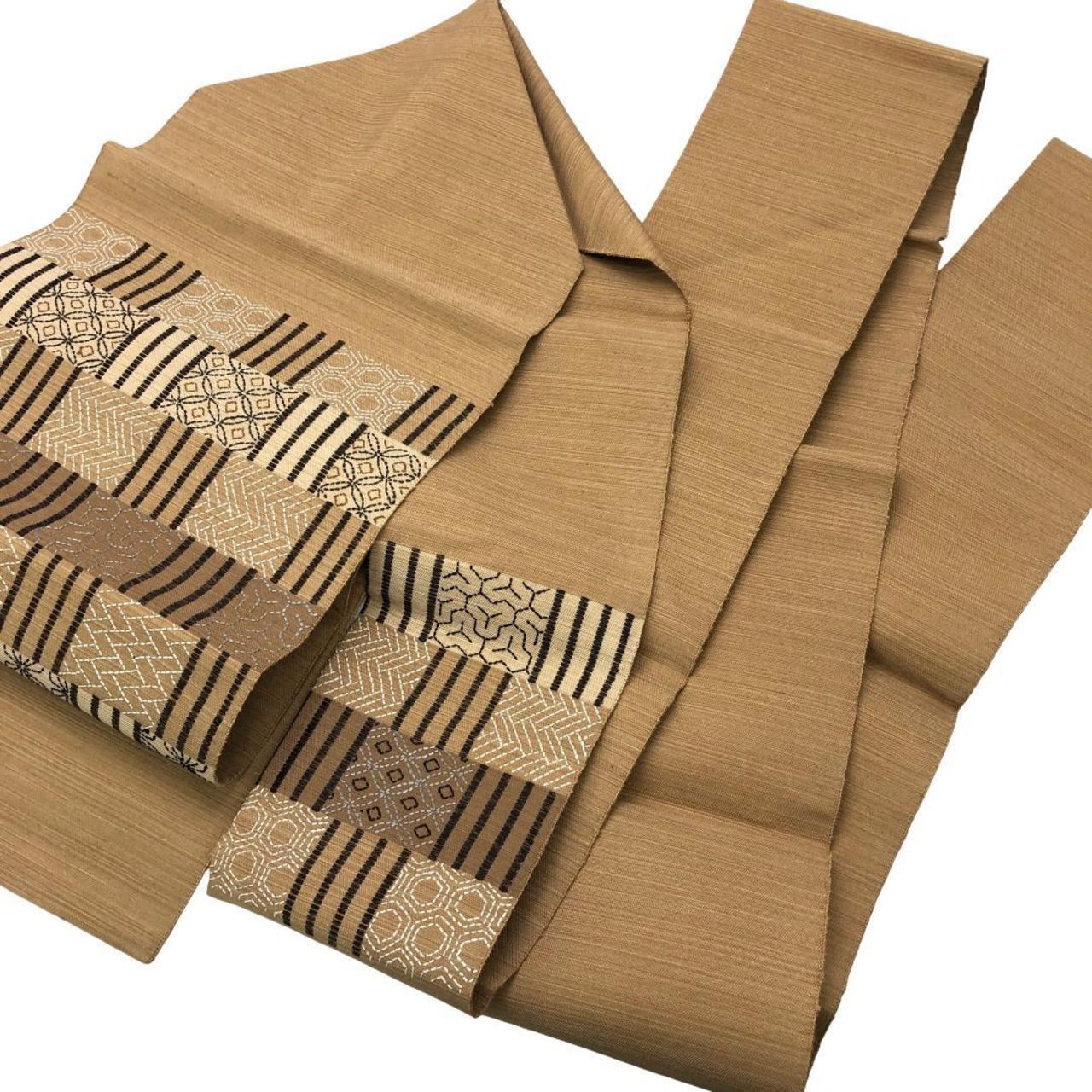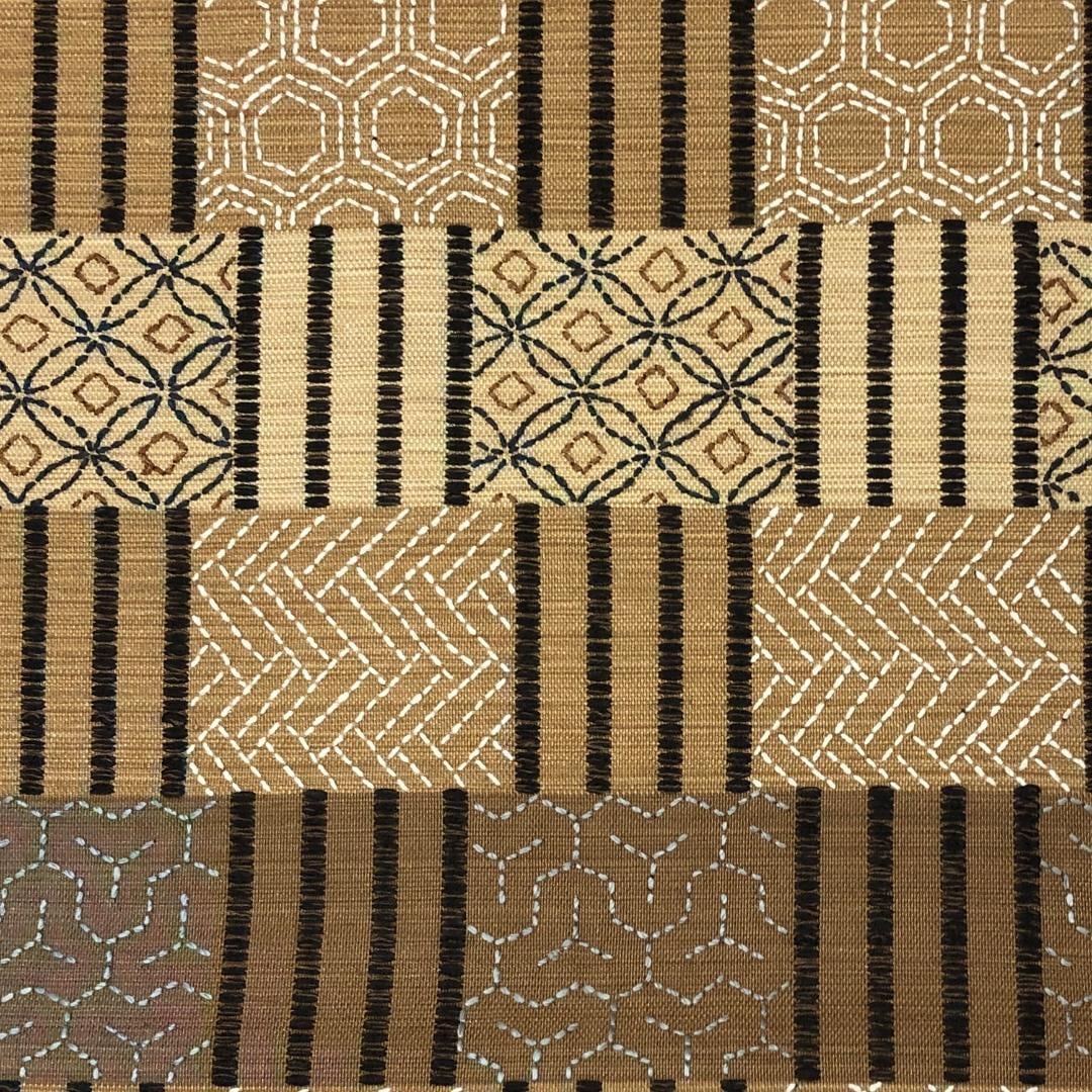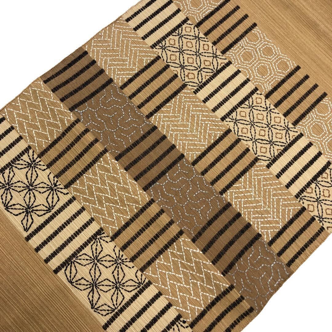 麦藁色の自然な風合いのお色味に刺子の七宝、亀甲などの柄裄がデザインされた素敵なお品でございます。