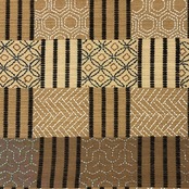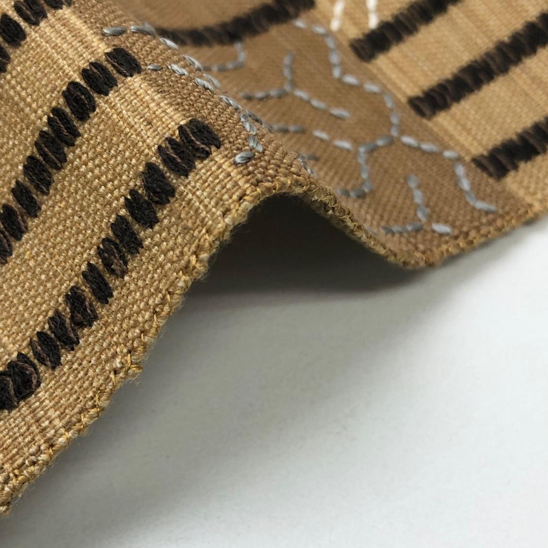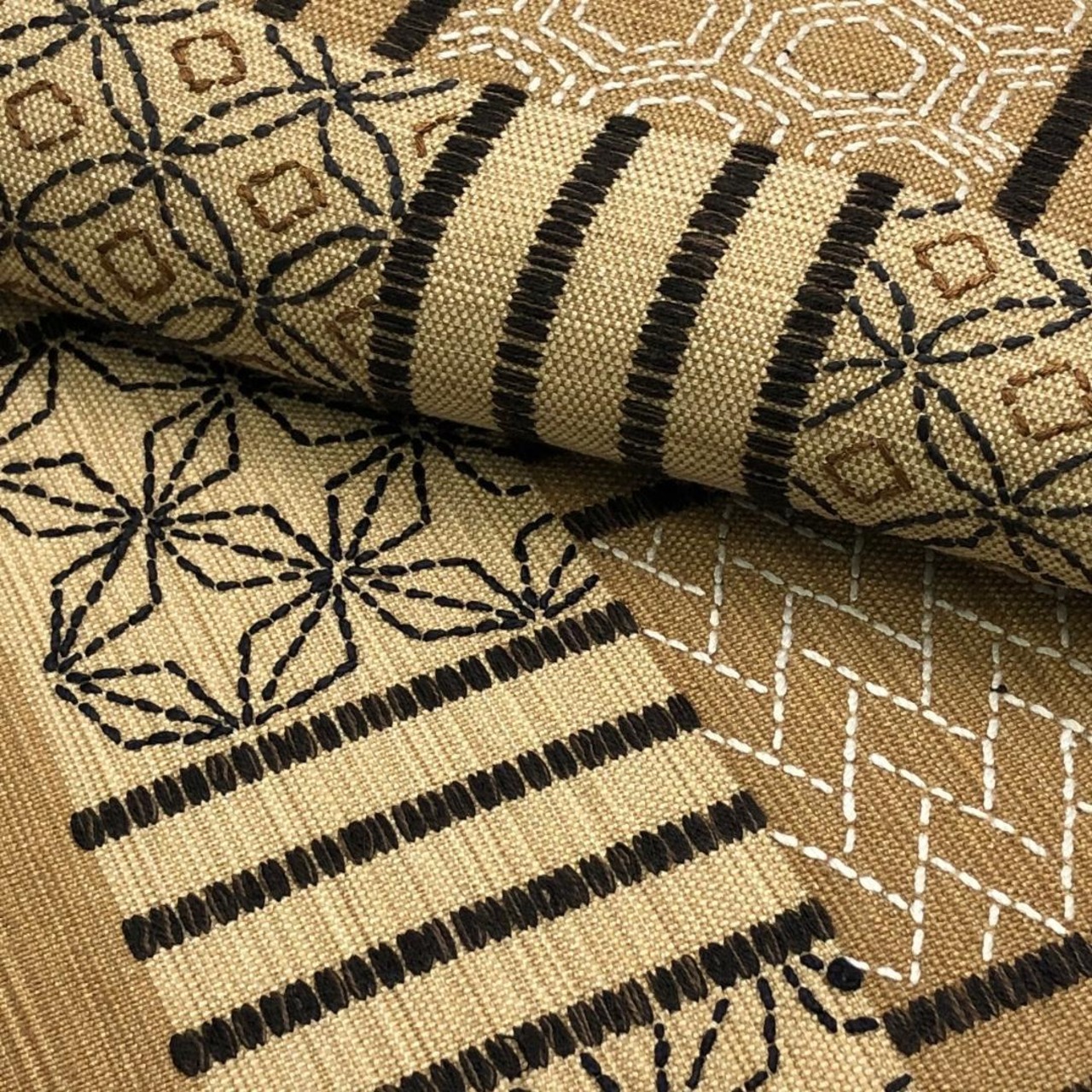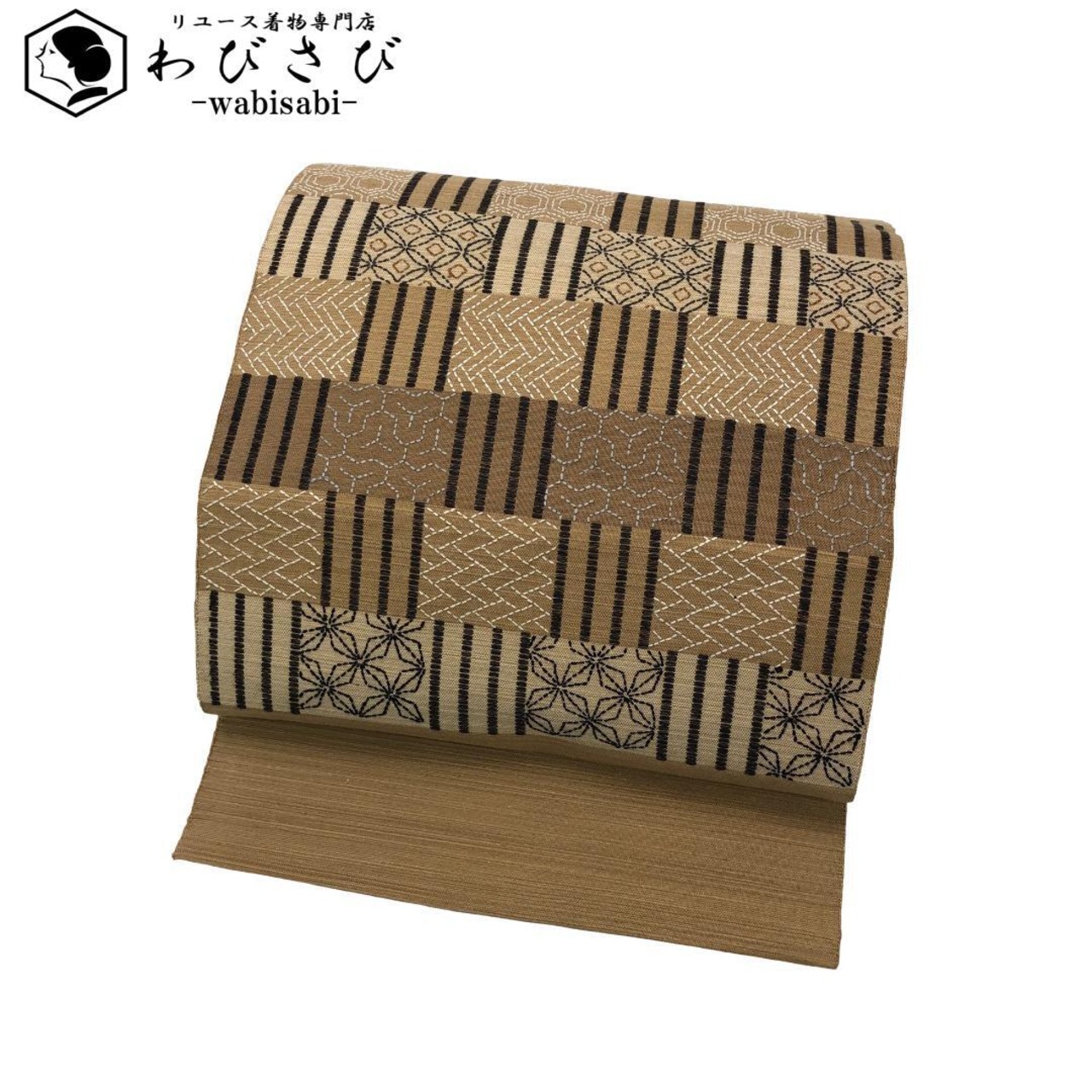 麦藁色の自然な風合いのお色味に刺子の七宝、亀甲などの柄裄がデザインされた素敵なお品でございます。