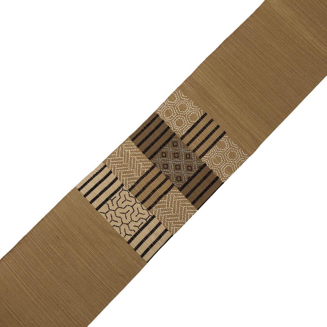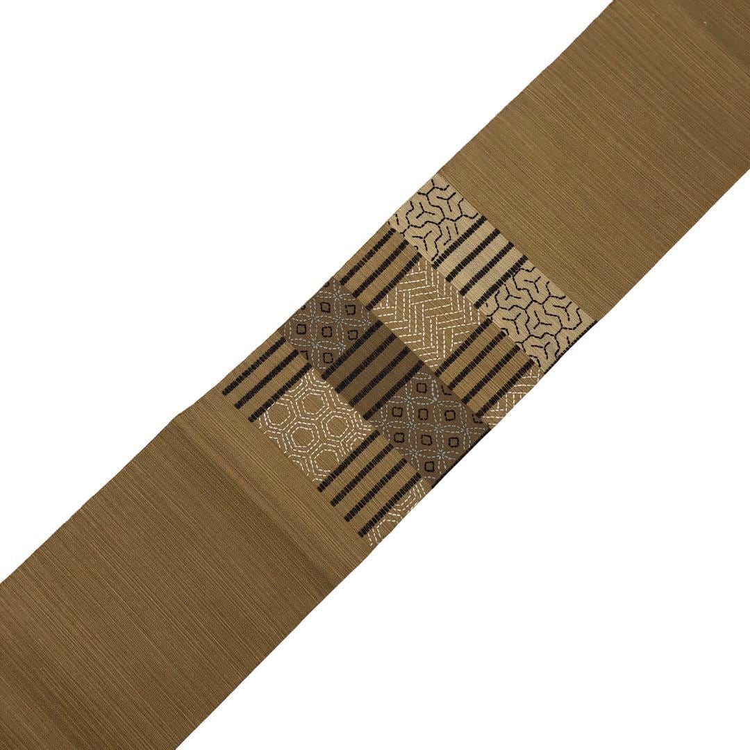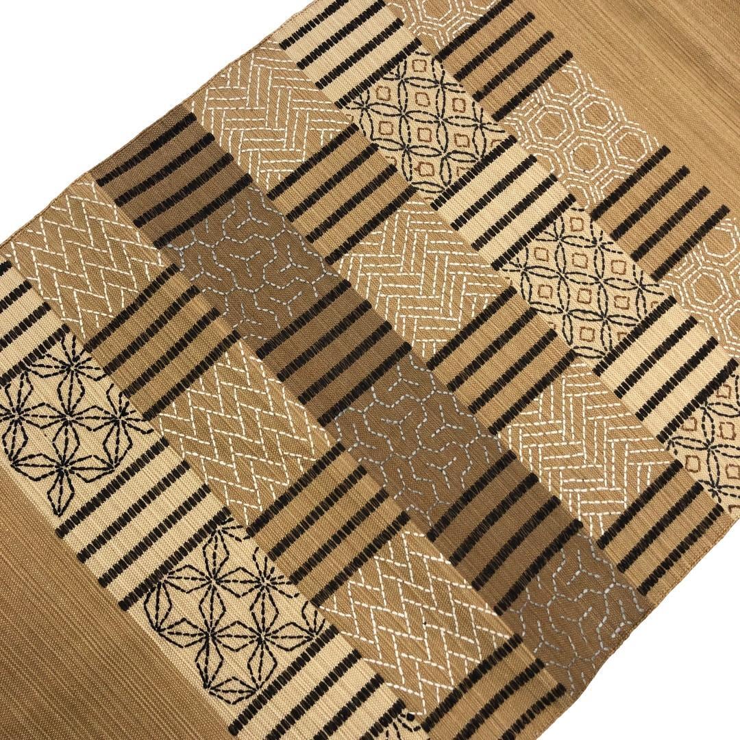 名古屋帯 紬 刺子柄 七宝 亀甲 麦藁色 長尺 O-5086 着物 きもの kimono 和服 和装 中古 リサイクル着物 【送料無料】