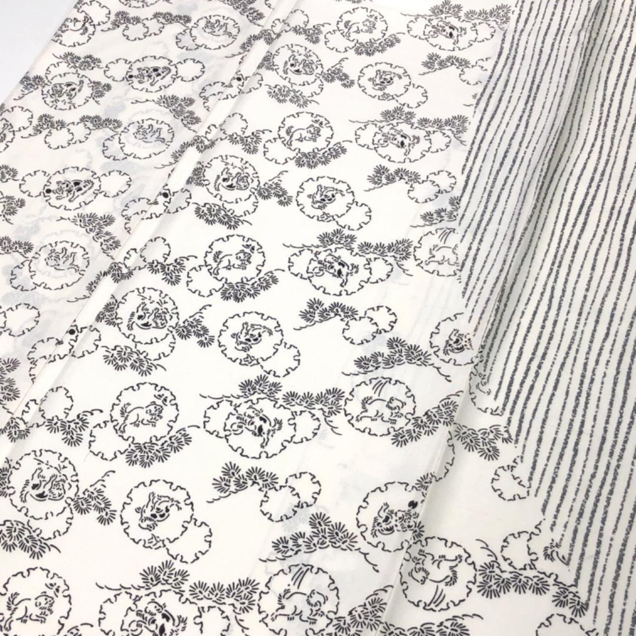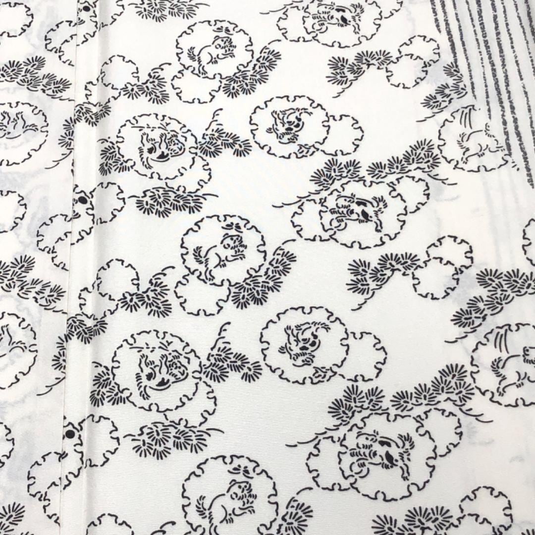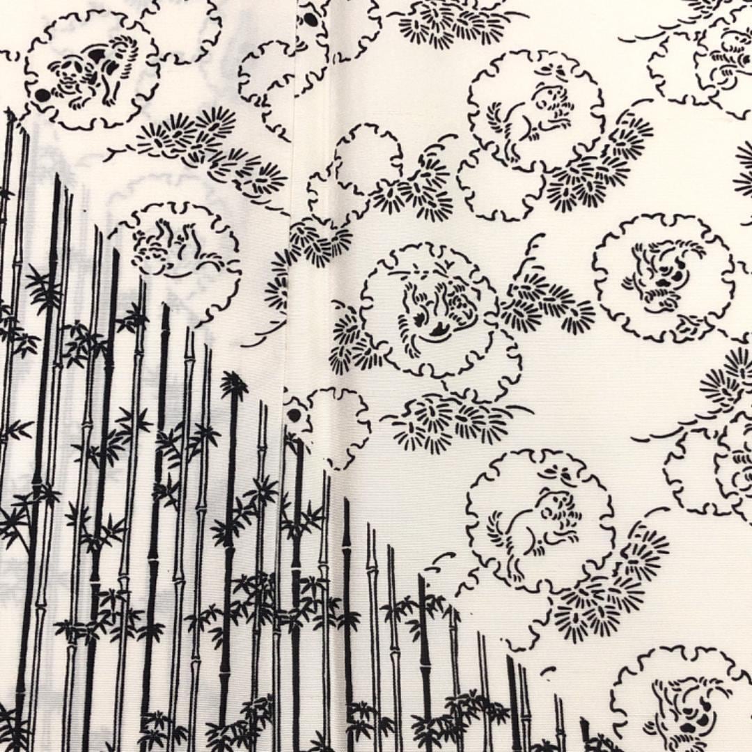 乳白色の上品なお色味、縦縞模様、雪輪に動物柄、竹模様などの柄行がデザインされた素敵なお品でございます。
