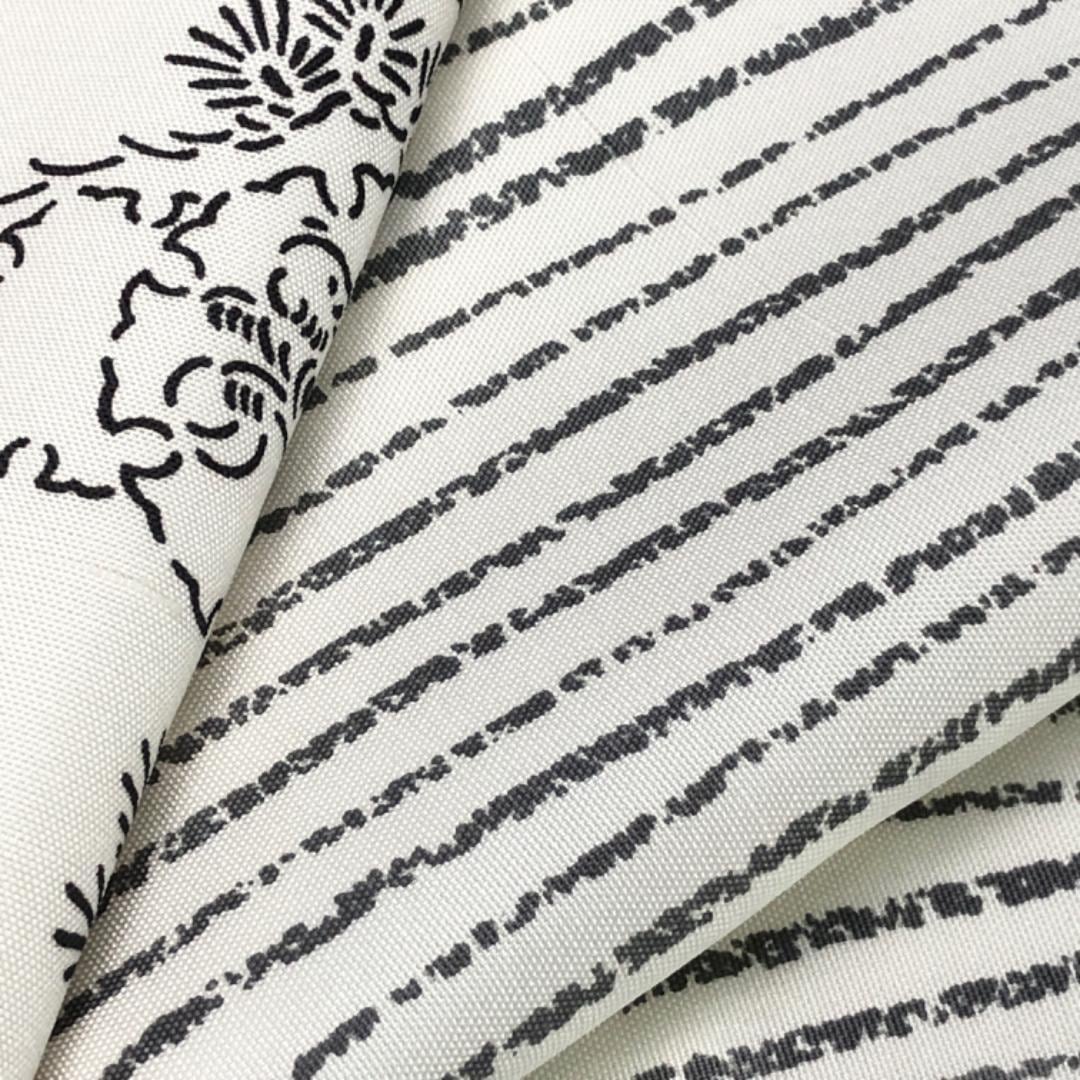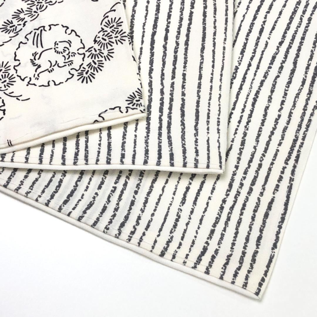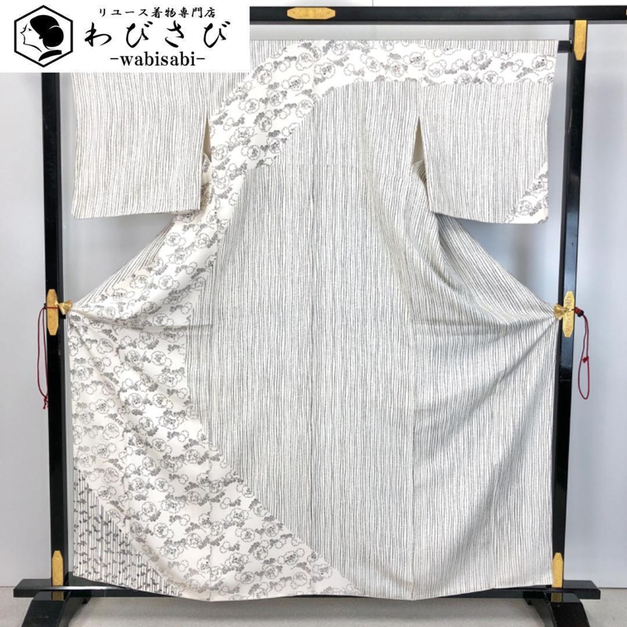 乳白色の上品なお色味、縦縞模様、雪輪に動物柄、竹模様などの柄行がデザインされた素敵なお品でございます。