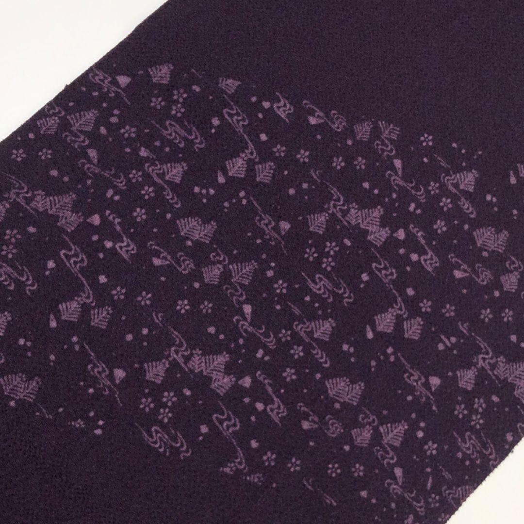 紫黒色のお色味に花草模様、流水がデザインされた縮緬の素敵なお品でございます。