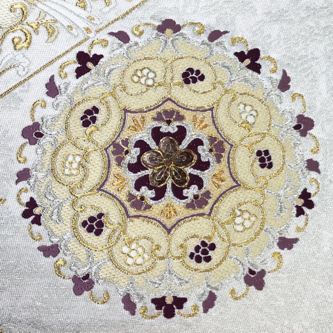 銀色ベースのお色味に美しい華柄模様、向かい鳥の柄行がデザインされた素敵なお品でございます。