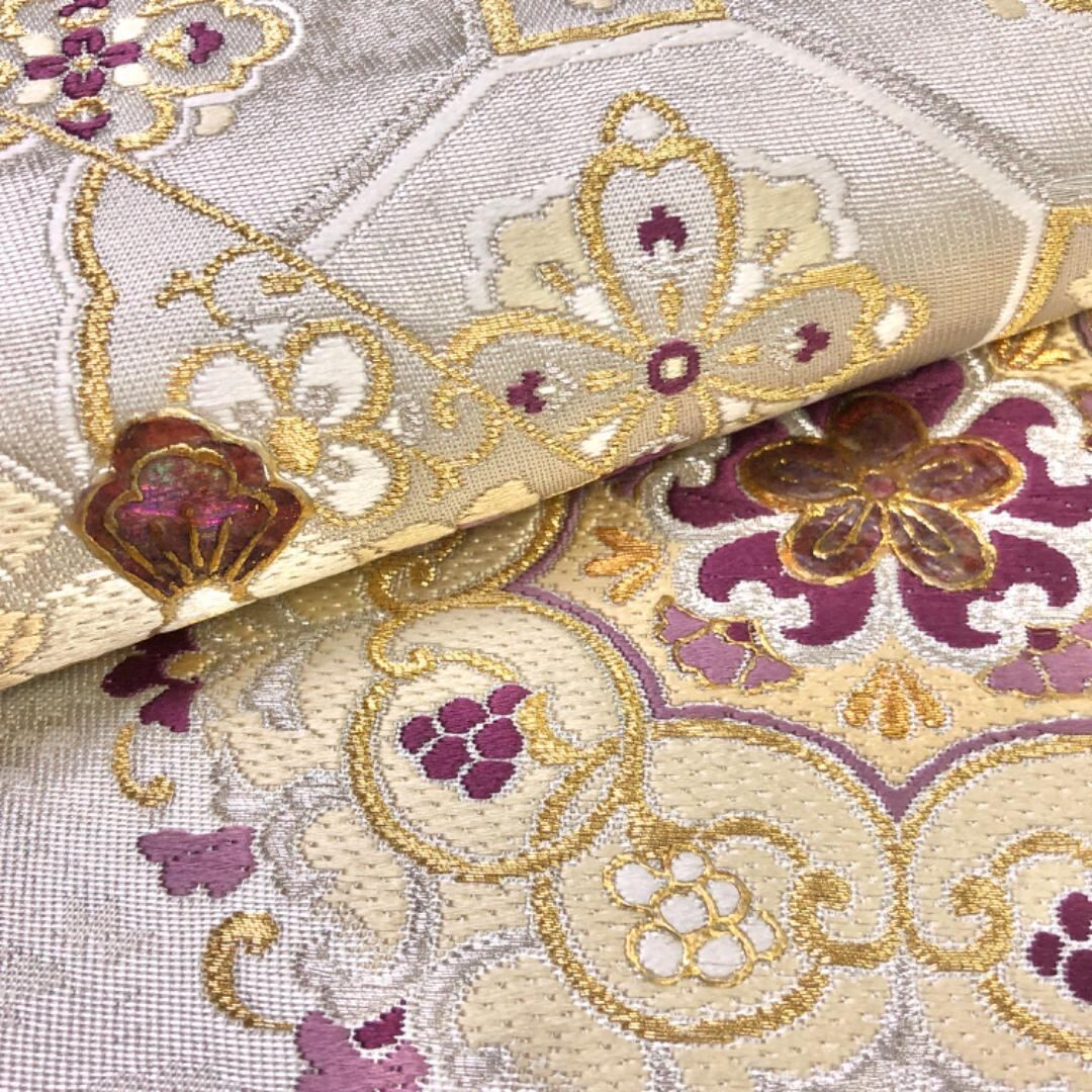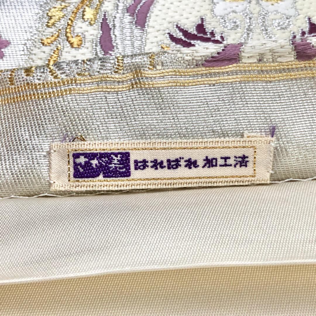 袋帯 貝紫伝説 美しい華柄模様 金銀糸 ガード加工 銀色 O-5100 着物 きもの kimono 和服 和装 中古 リサイクル着物 【送料無料】
