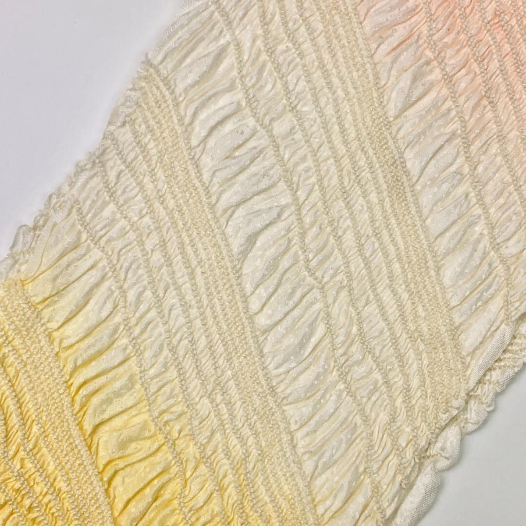 薄東雲色と淡黄色の2色のグラデーションのお色味に絞りの斜線模様がデザインされた素敵なお品でございます。