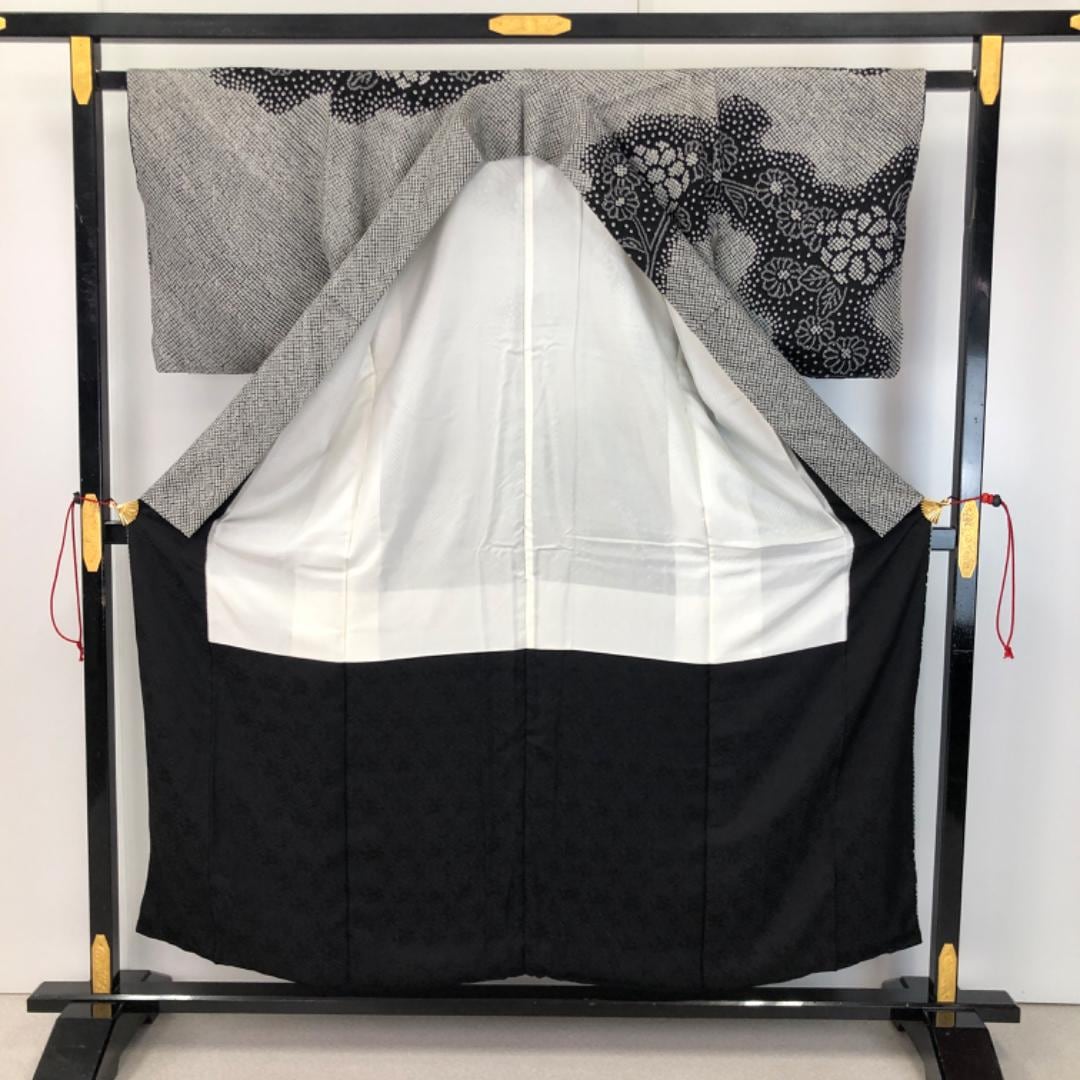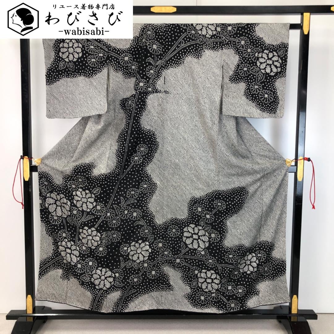 訪問着 総絞り 花柄模様 黒色 モノトーン K-4777 着物 きもの kimono 和服 和装 中古 リサイクル着物 【送料無料】