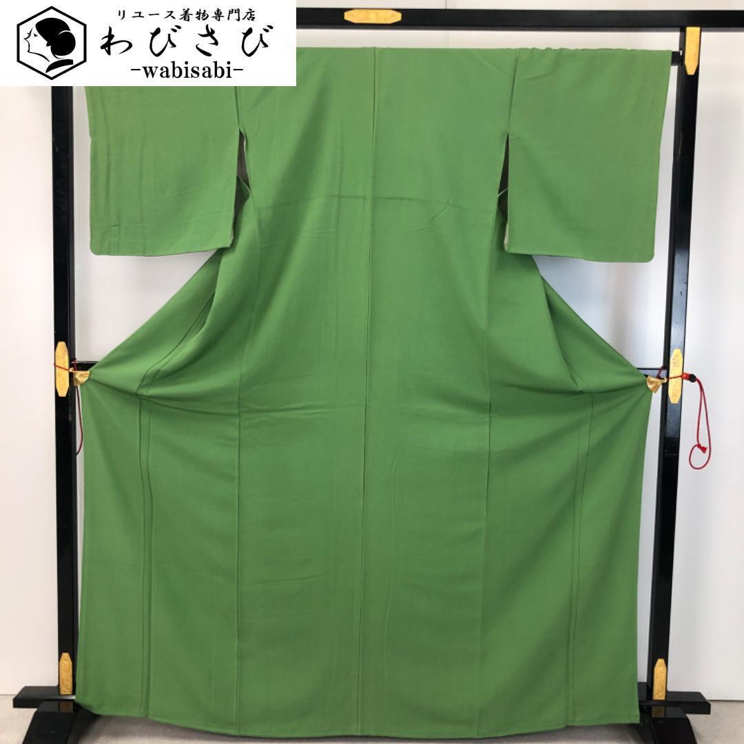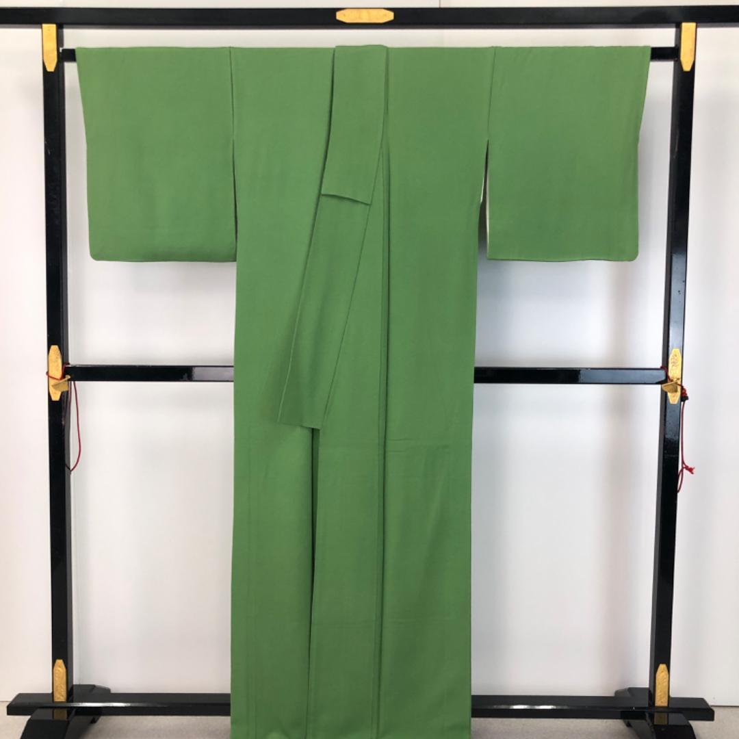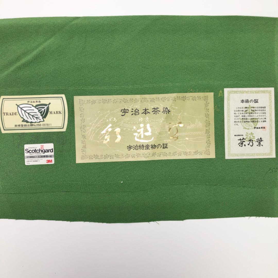 宇治本茶染、彩遊染、松葉色の落ち着きあるお色味に高砂縮緬の色味の良い素敵なお品でございます。