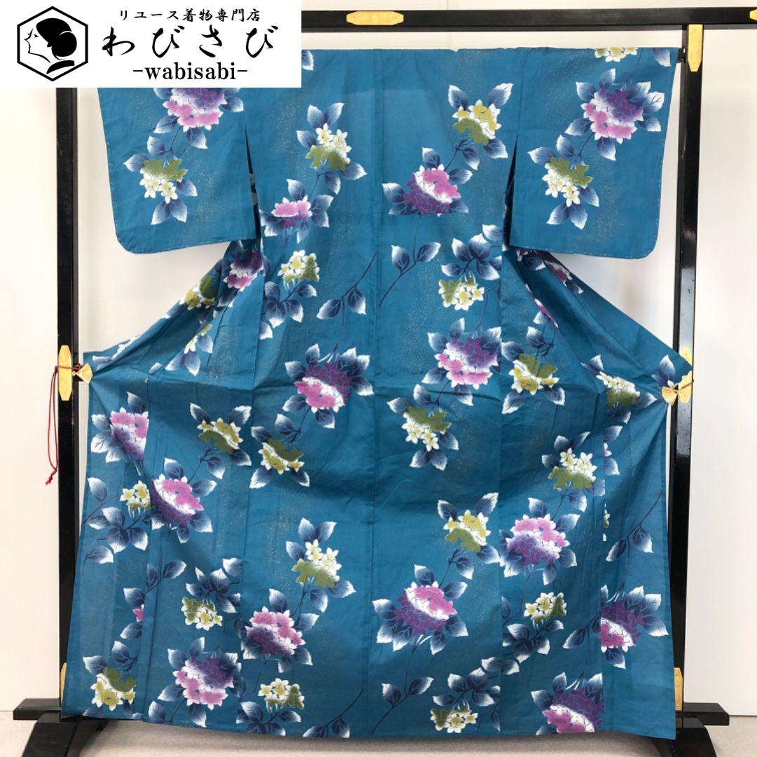 夏着物 浴衣 紫陽花 金彩 青碧色 しつけ糸 K-4834 着物 きもの kimono 和服 和装 中古 リサイクル着物 【送料無料】