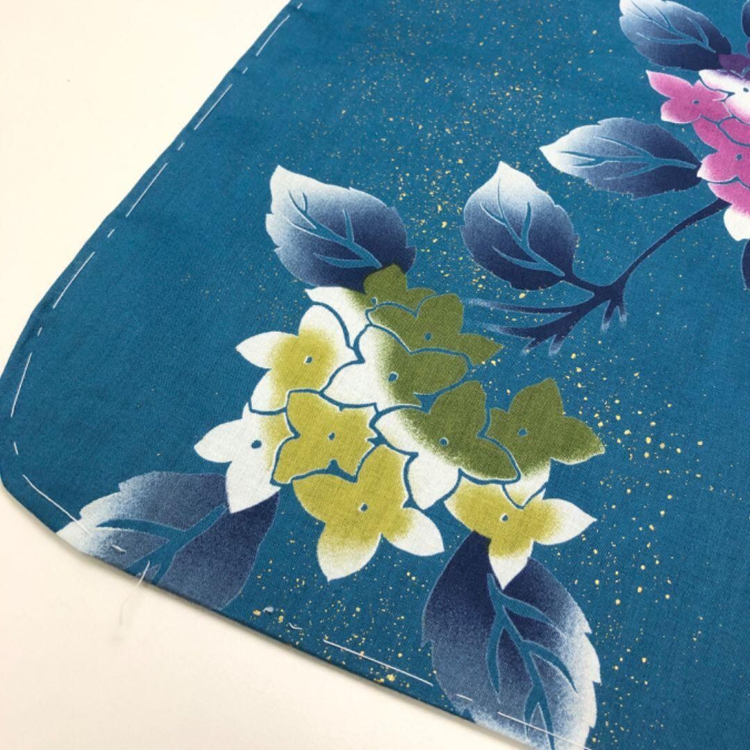 青碧色のお色味に紫陽花の花模様がデザインされた素敵なお品でございます。