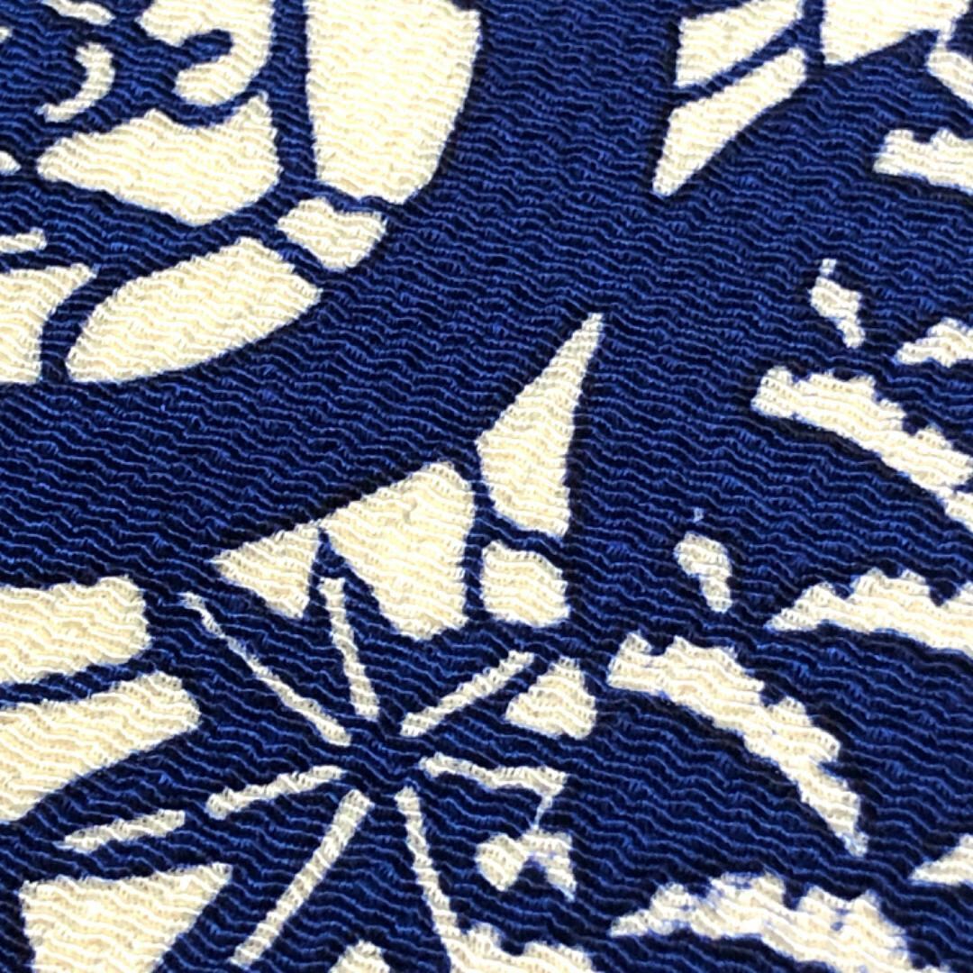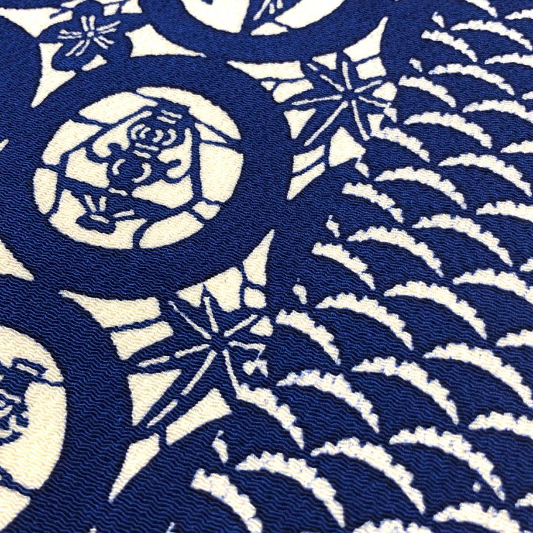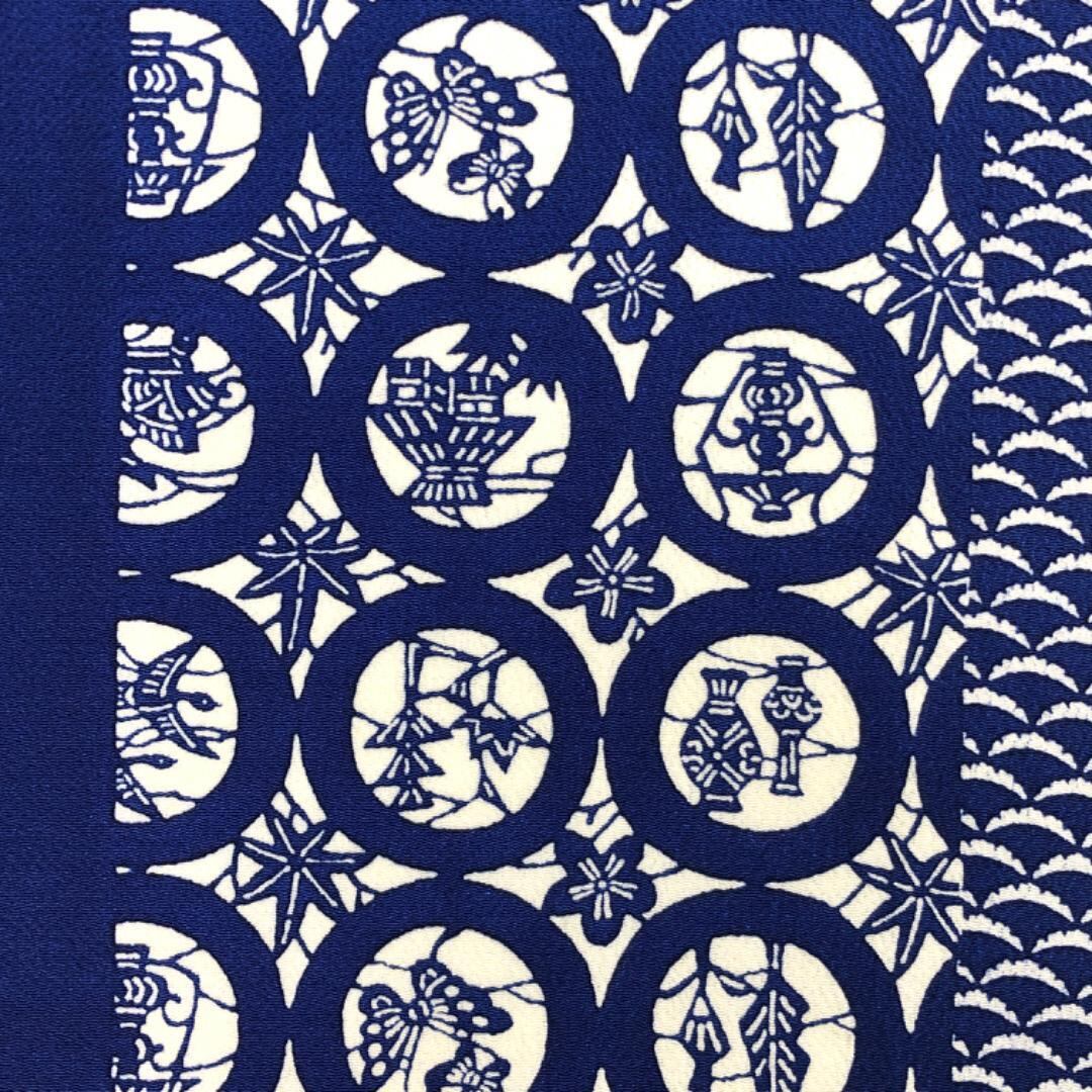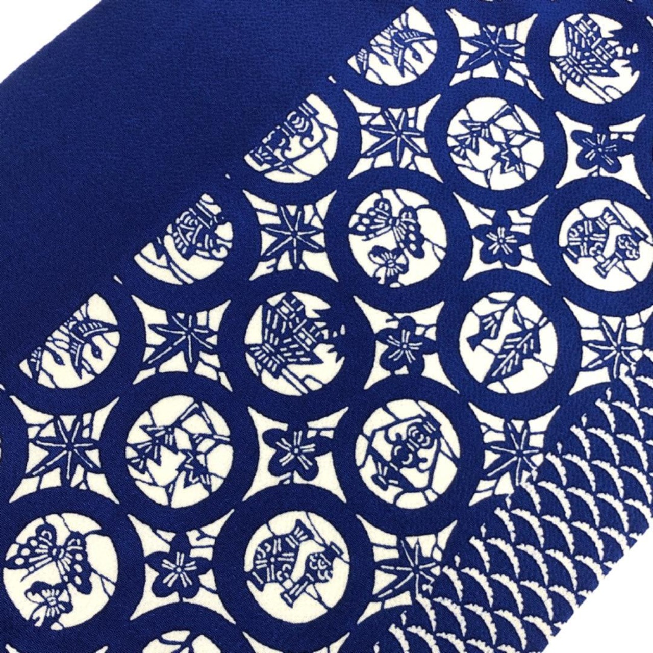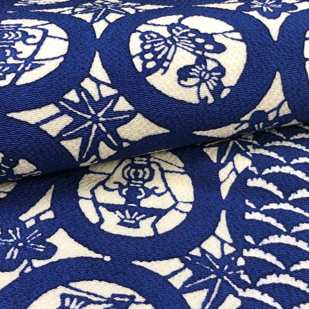 瑠璃色の色味の良い青味のお色味の型染、丸に鳥、蝶々、花草模様、雪芝などの柄行がデザインされた素敵なお品でございます。