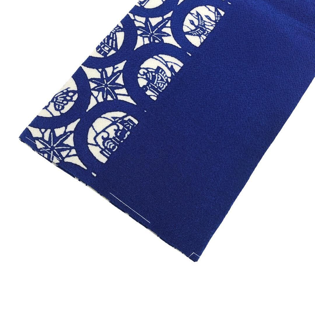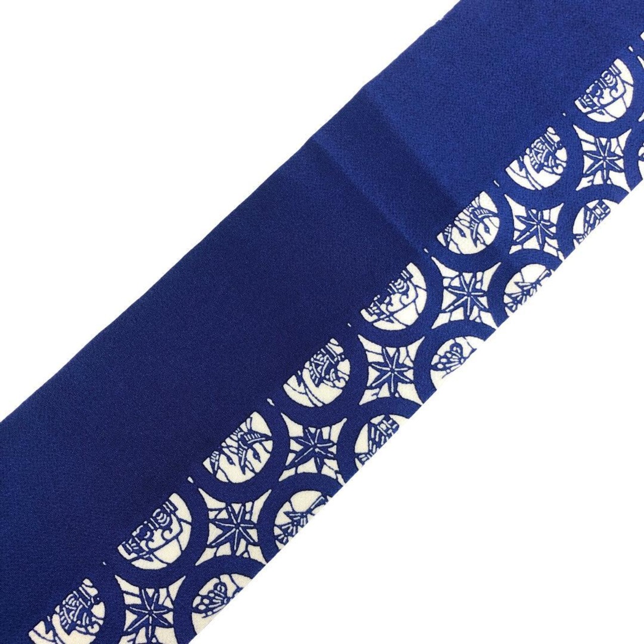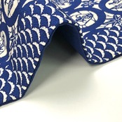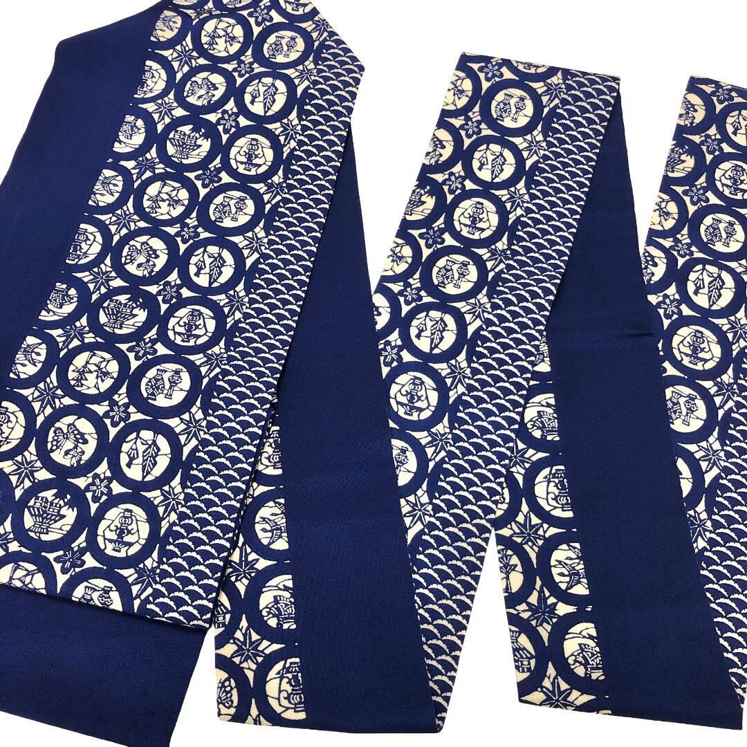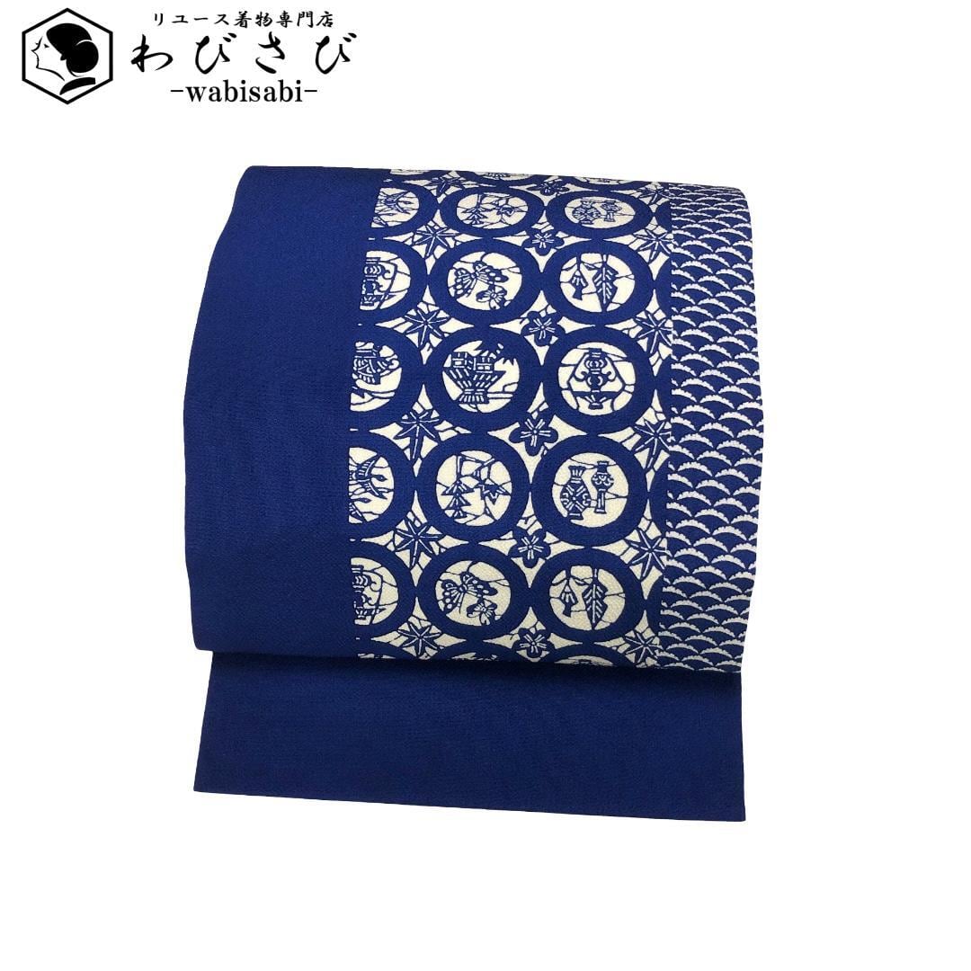 瑠璃色の色味の良い青味のお色味の型染、丸に鳥、蝶々、花草模様、雪芝などの柄行がデザインされた素敵なお品でございます。