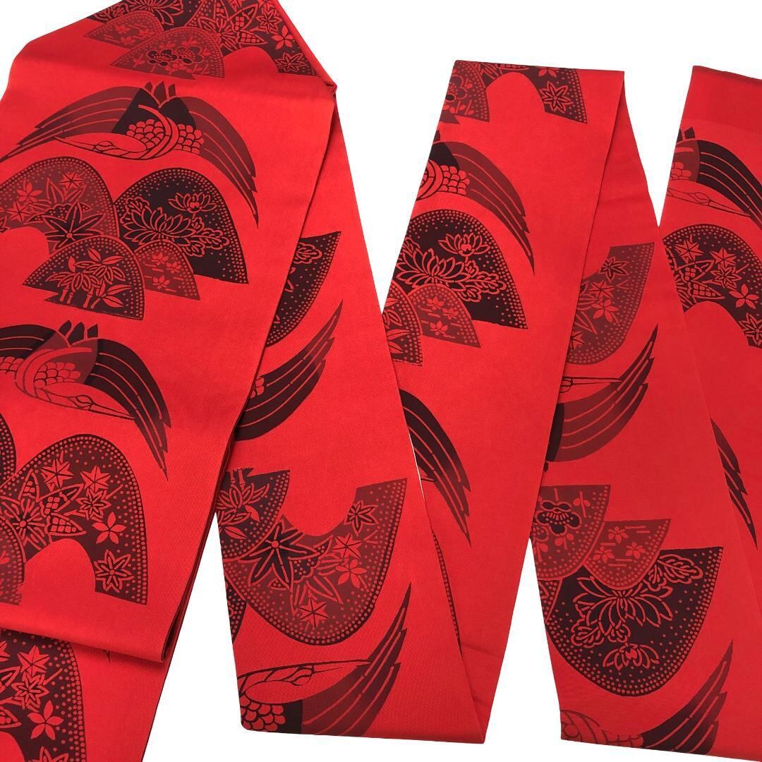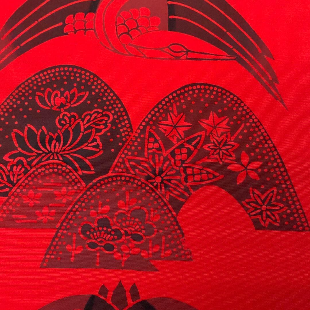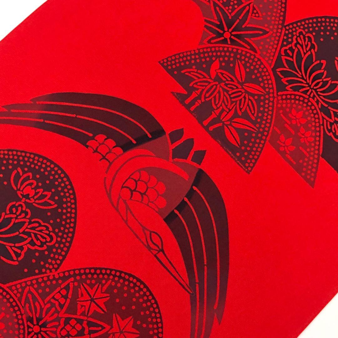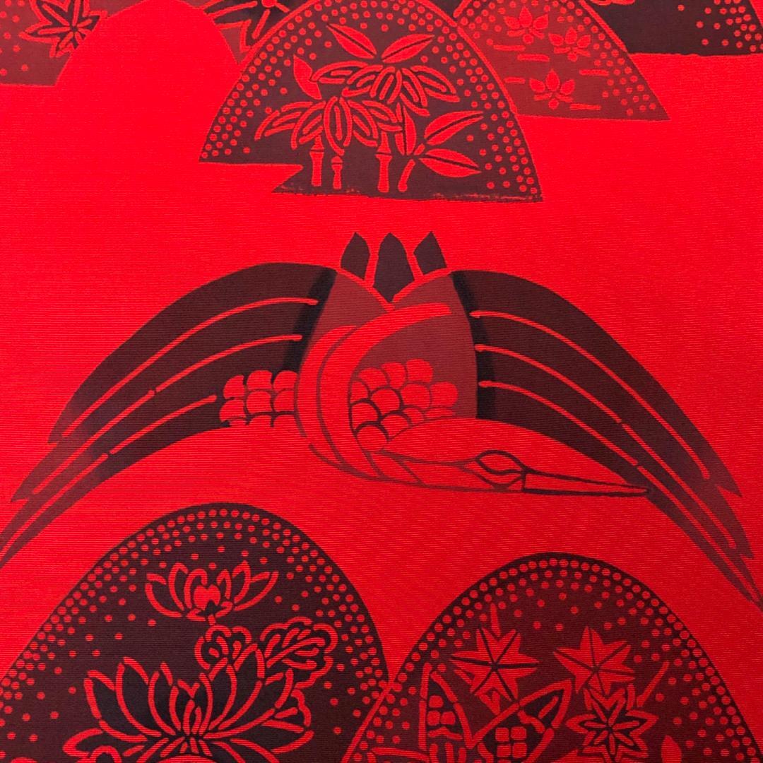 辰砂色の鮮やかな赤味のお色味、鶴、花草模様などの型染の雰囲気の良いデザインが素敵なお品でございます。