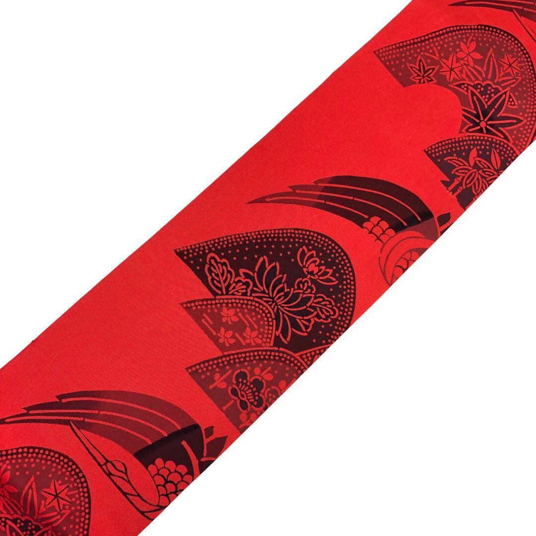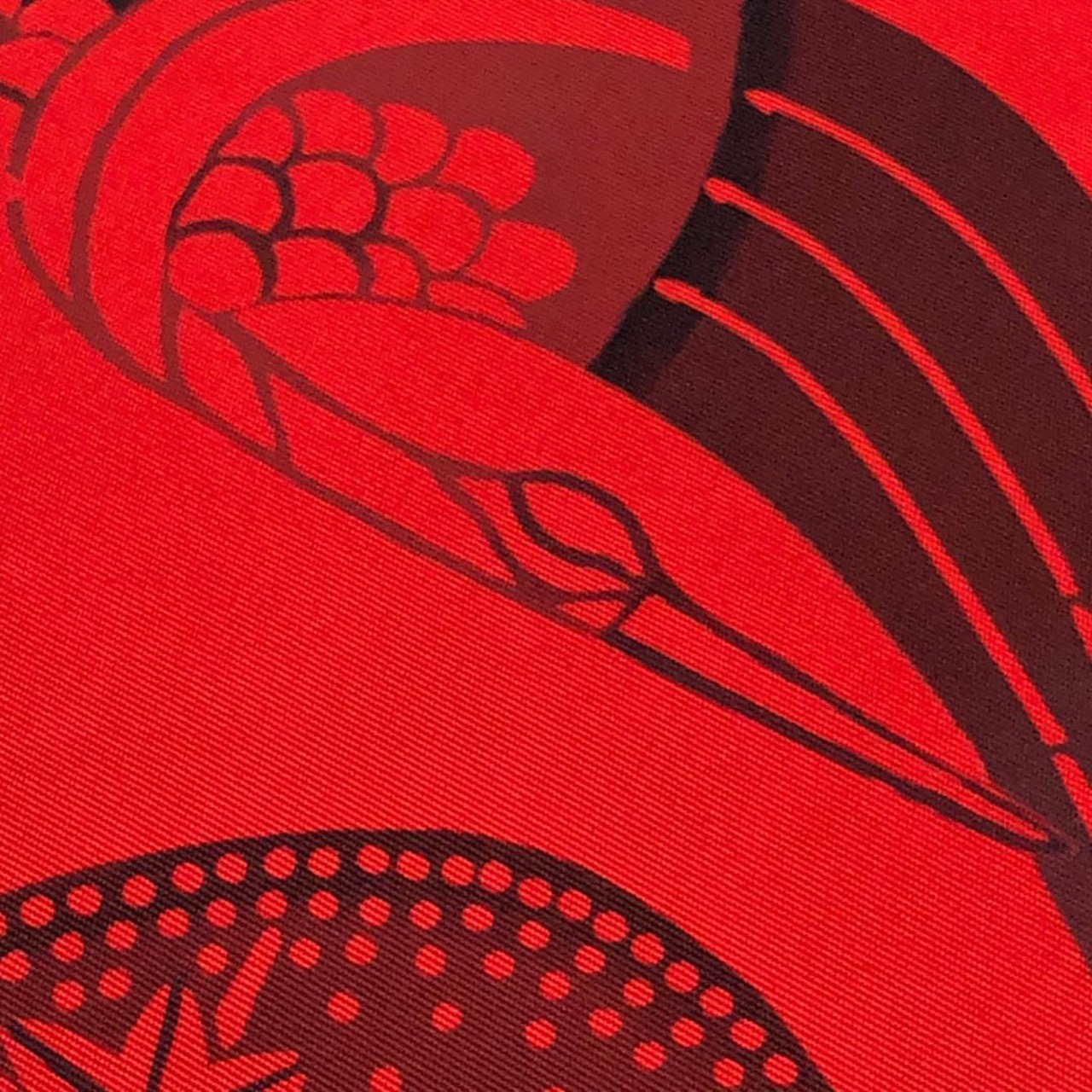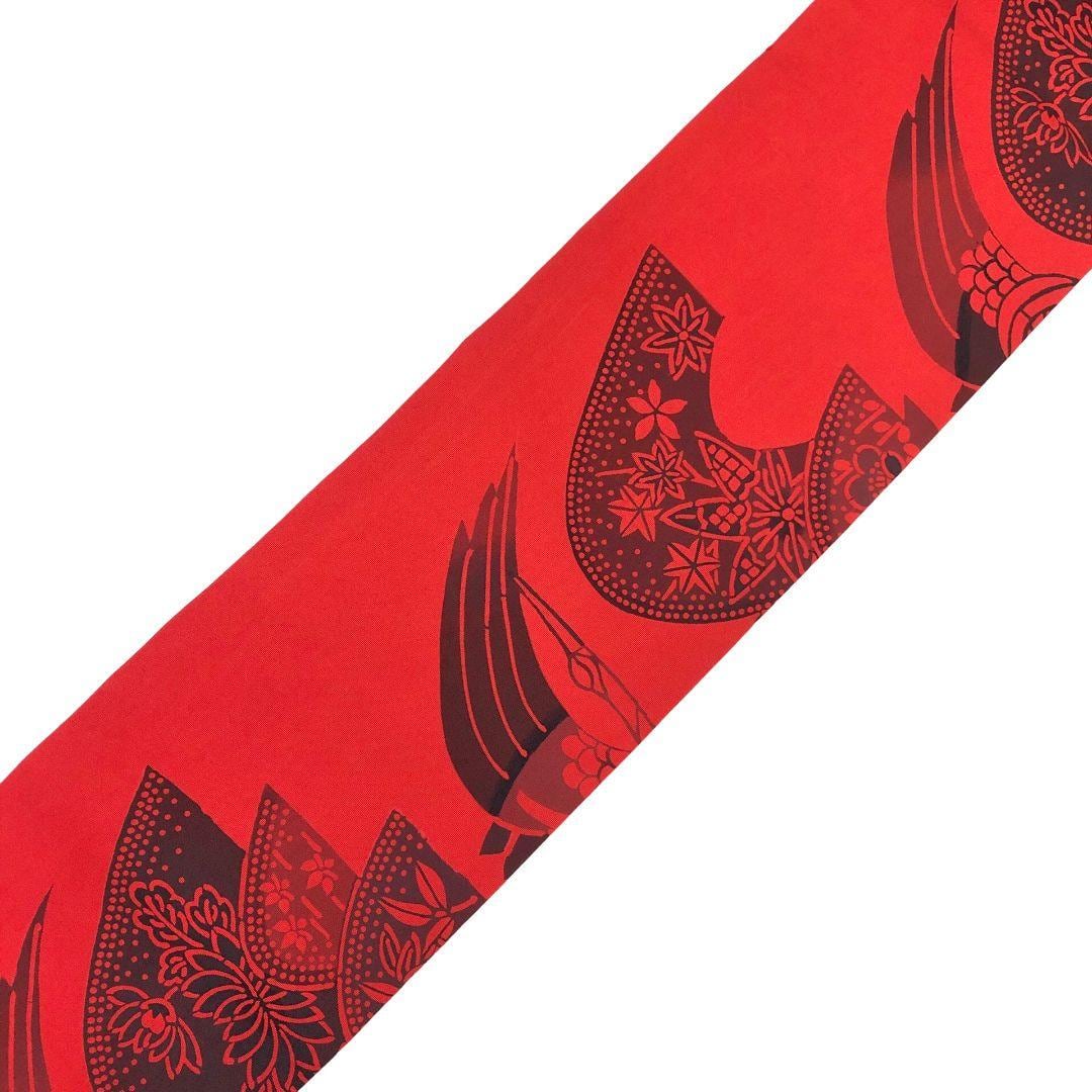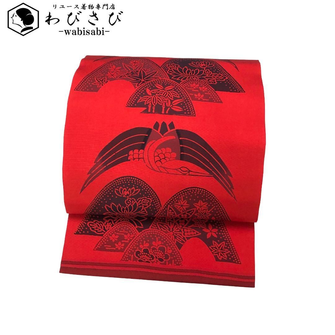 辰砂色の鮮やかな赤味のお色味、鶴、花草模様などの型染の雰囲気の良いデザインが素敵なお品でございます。