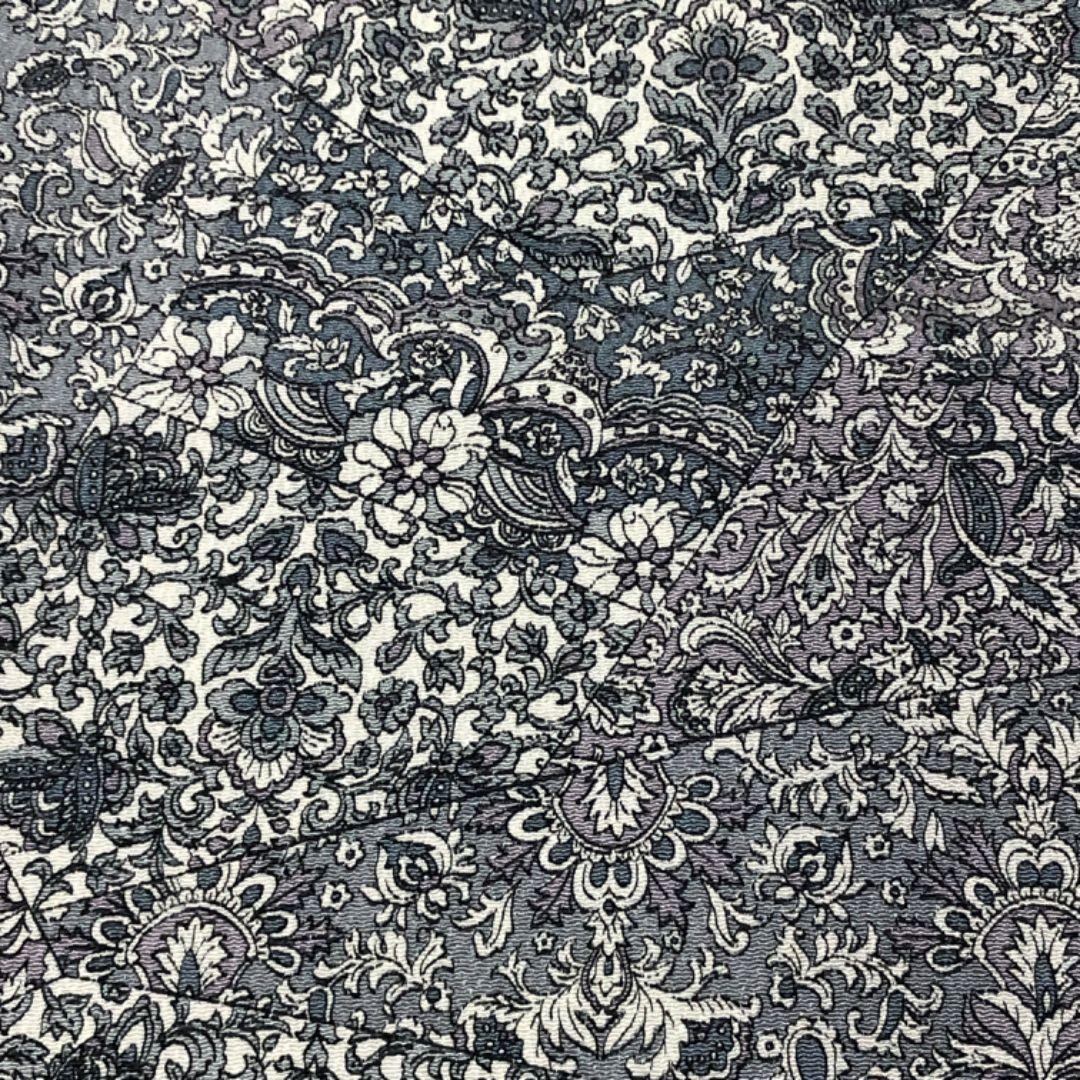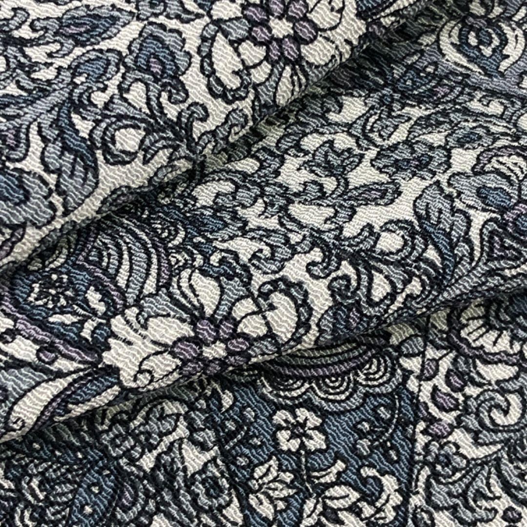 青鈍色ベースの上品なお色味の縮緬地に花更紗、美しい花唐草模様の柄裄がデザインされた素敵なお品でございます。
