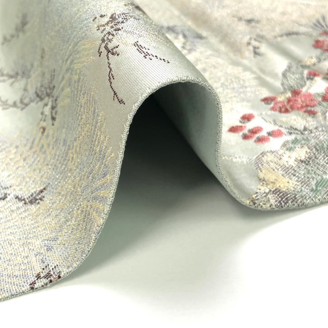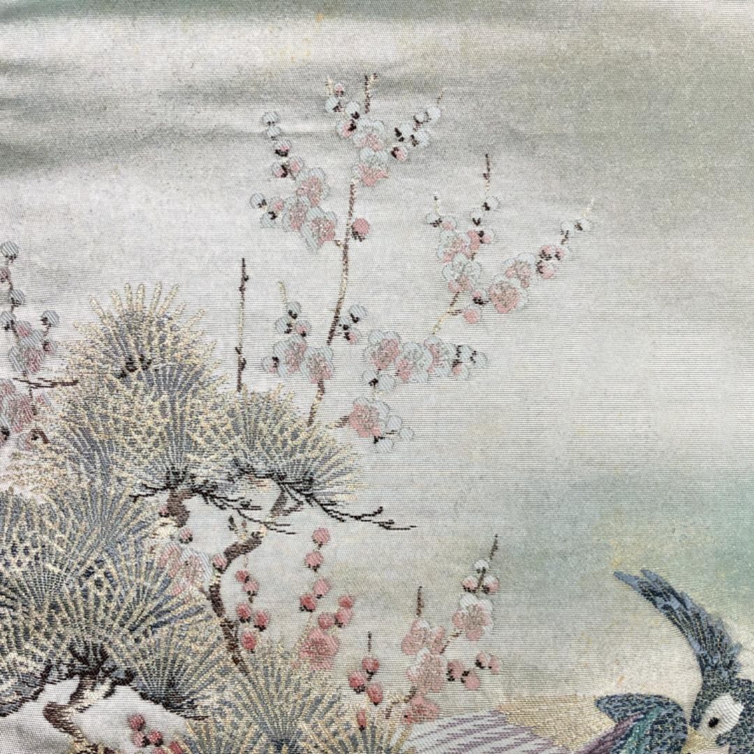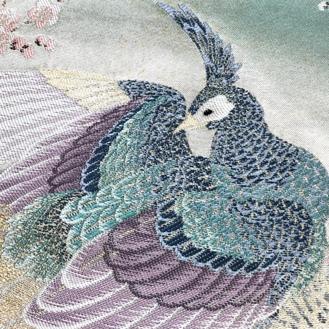 卯の花色の上品なお色味に美しい孔雀、松、梅、桜などの柄行がデザインされた素敵なお品でございます。