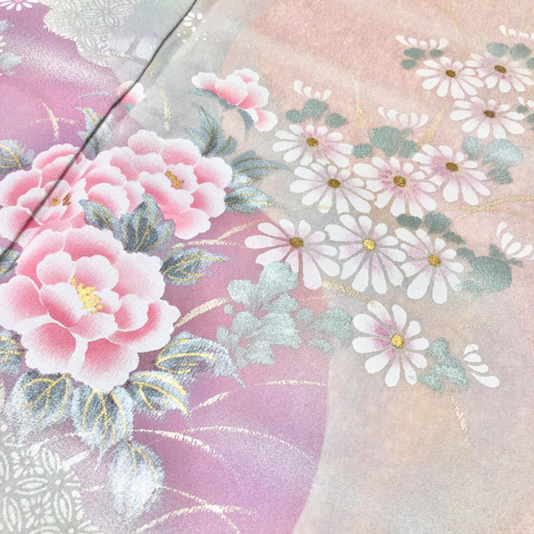 白梅色の優しいお色味に流水に美しい花模様の柄裄がデザインされた素敵なお品でございます。