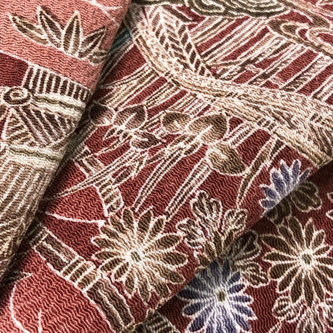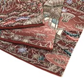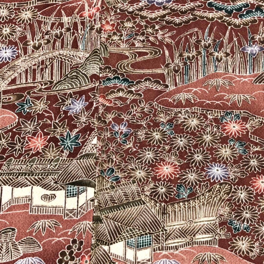 暗紅色ベースのお色味の縮緬地に風景、花草模様がデザインされた雰囲気の良い素敵な柄裄のお品でございます。