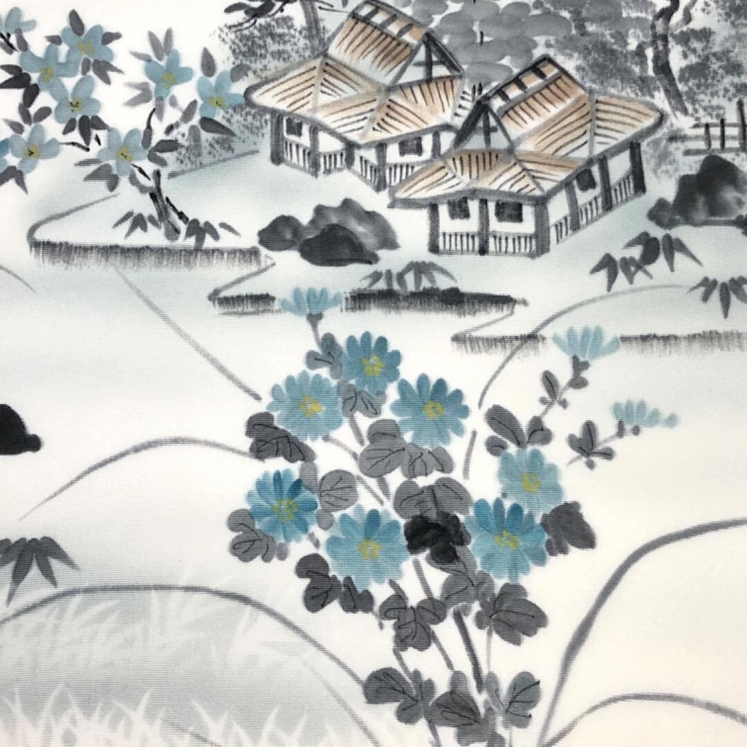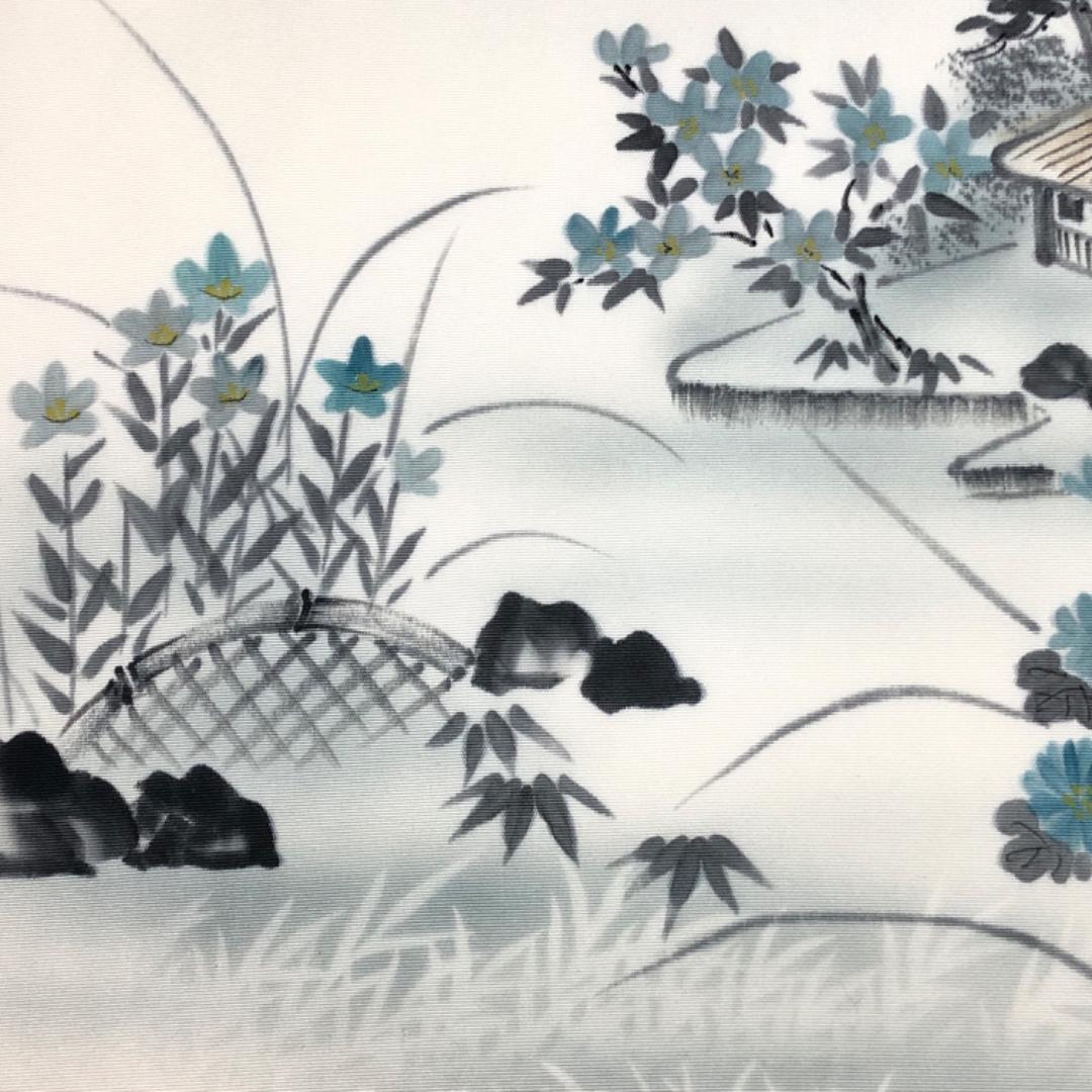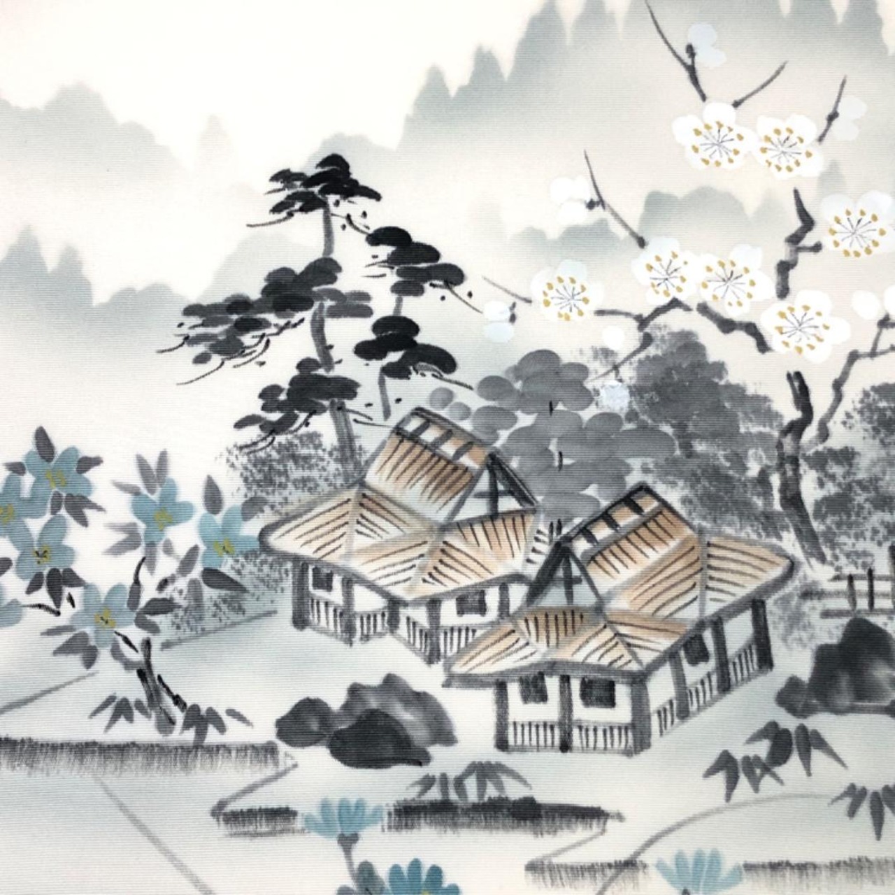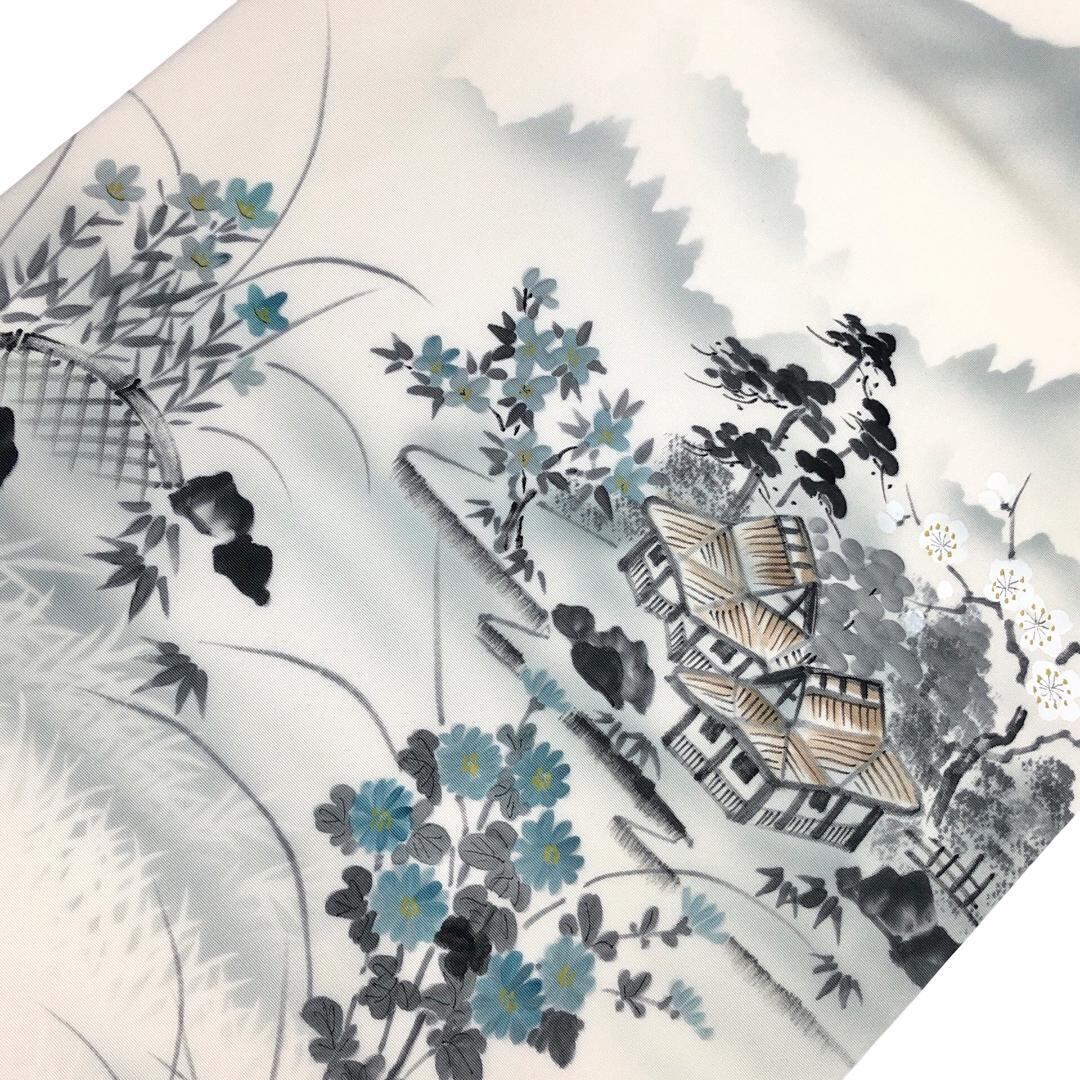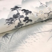 乳白色のお色味の塩瀬に手描きの風景模様、松竹梅がデザインされた素敵な柄裄のお品でございます。