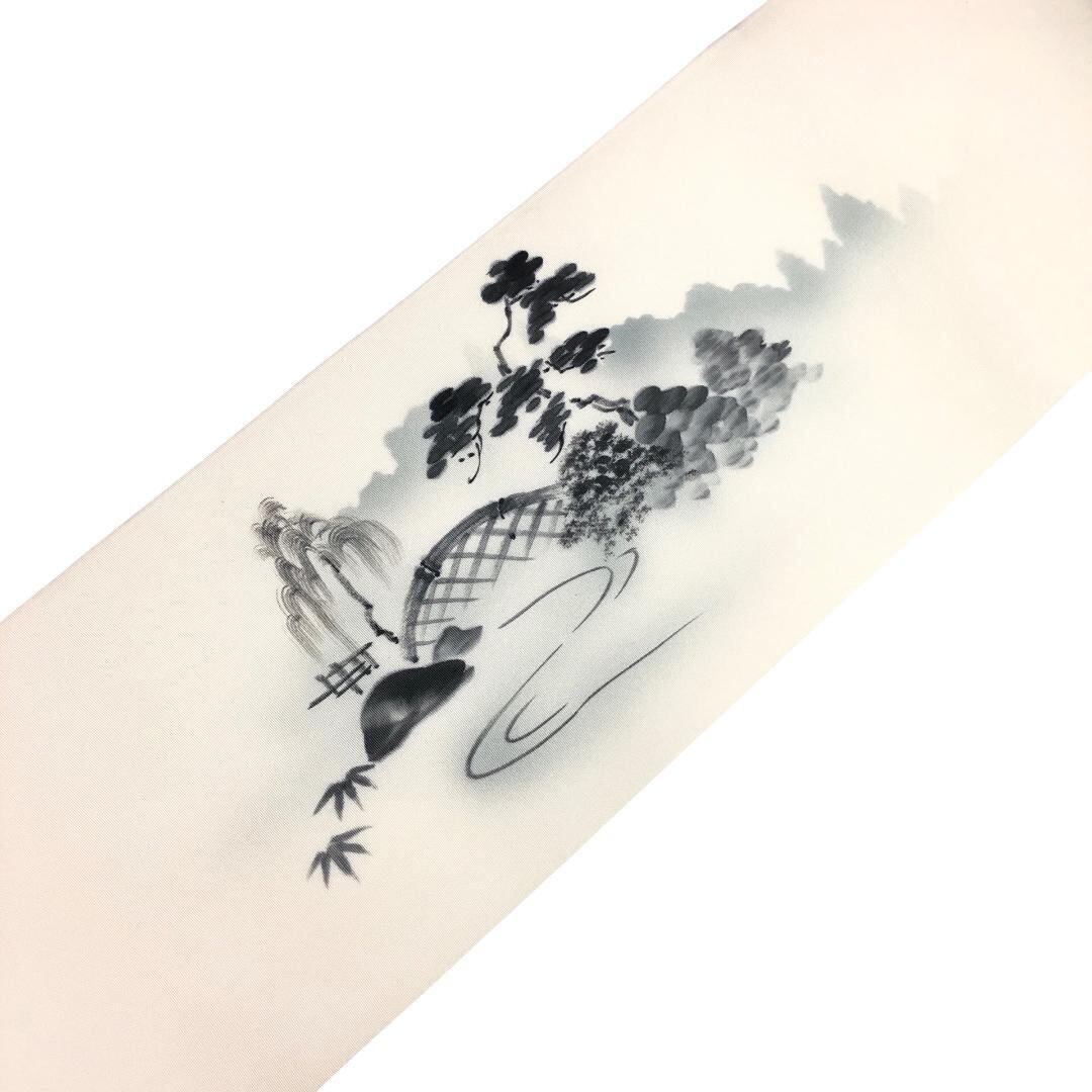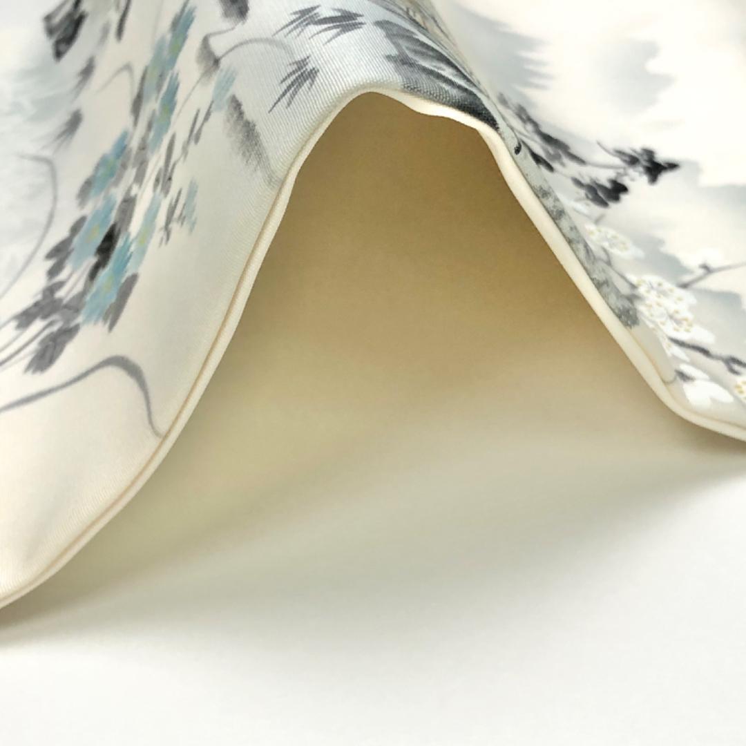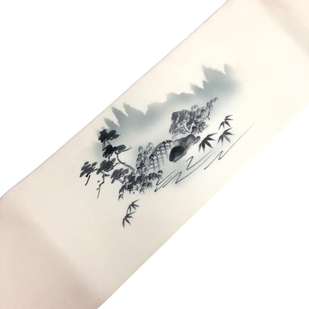 乳白色のお色味の塩瀬に手描きの風景模様、松竹梅がデザインされた素敵な柄裄のお品でございます。