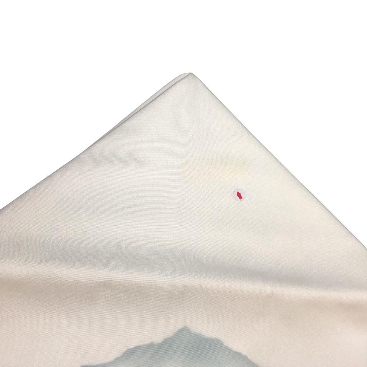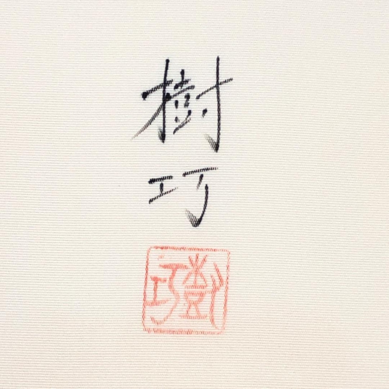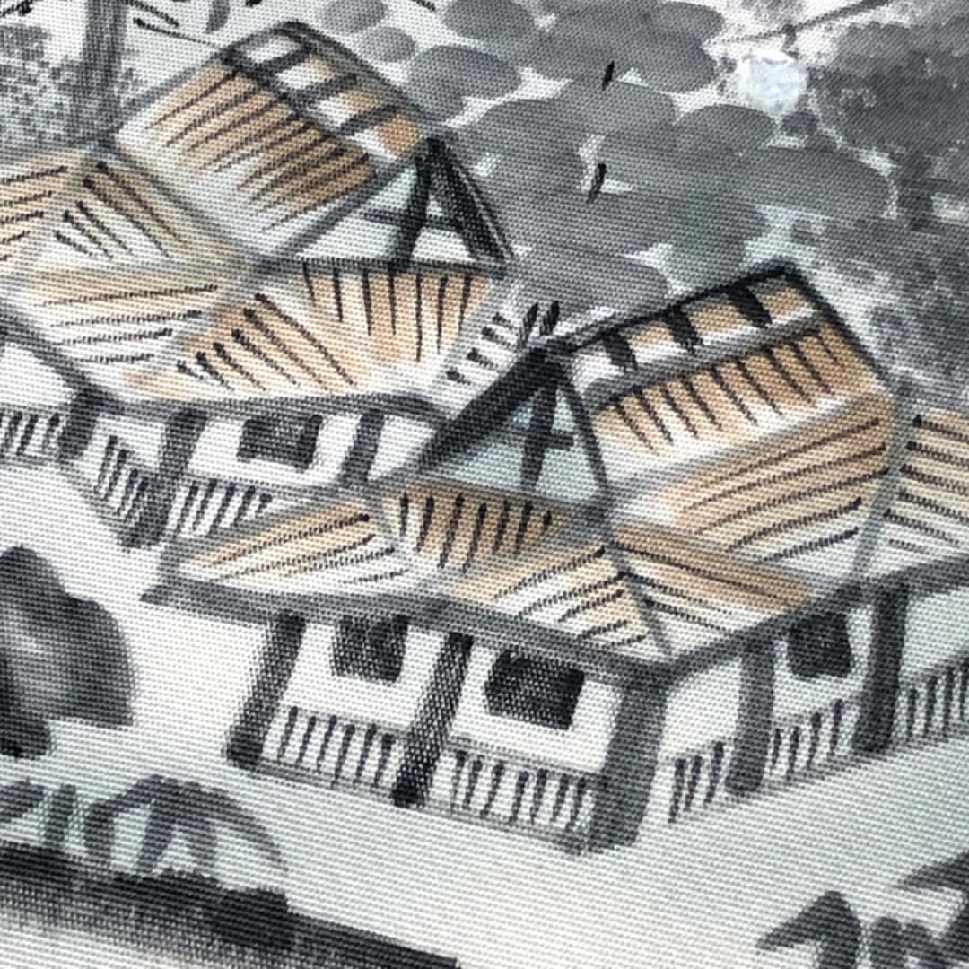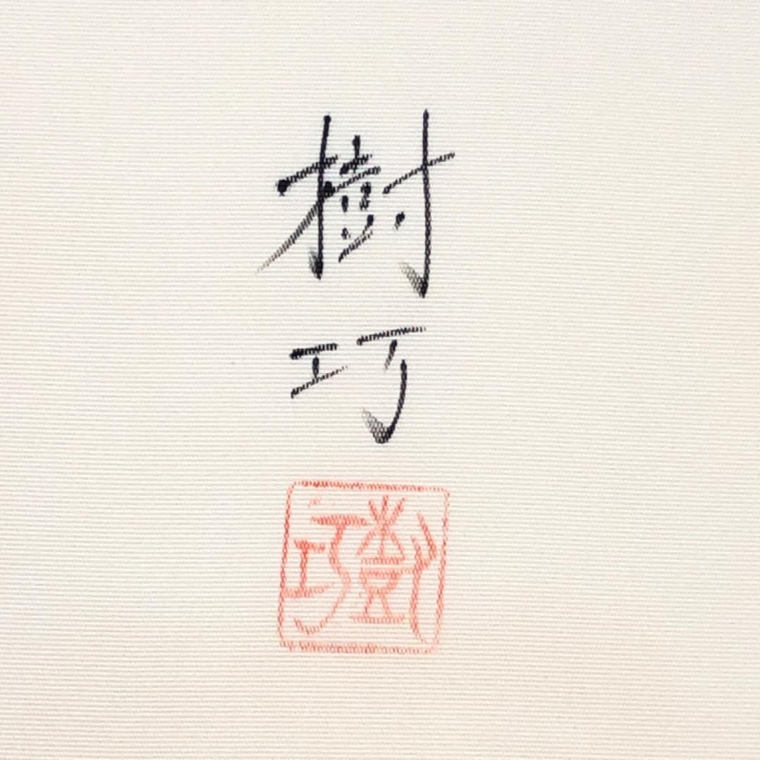 乳白色のお色味の塩瀬に手描きの風景模様、松竹梅がデザインされた素敵な柄裄のお品でございます。