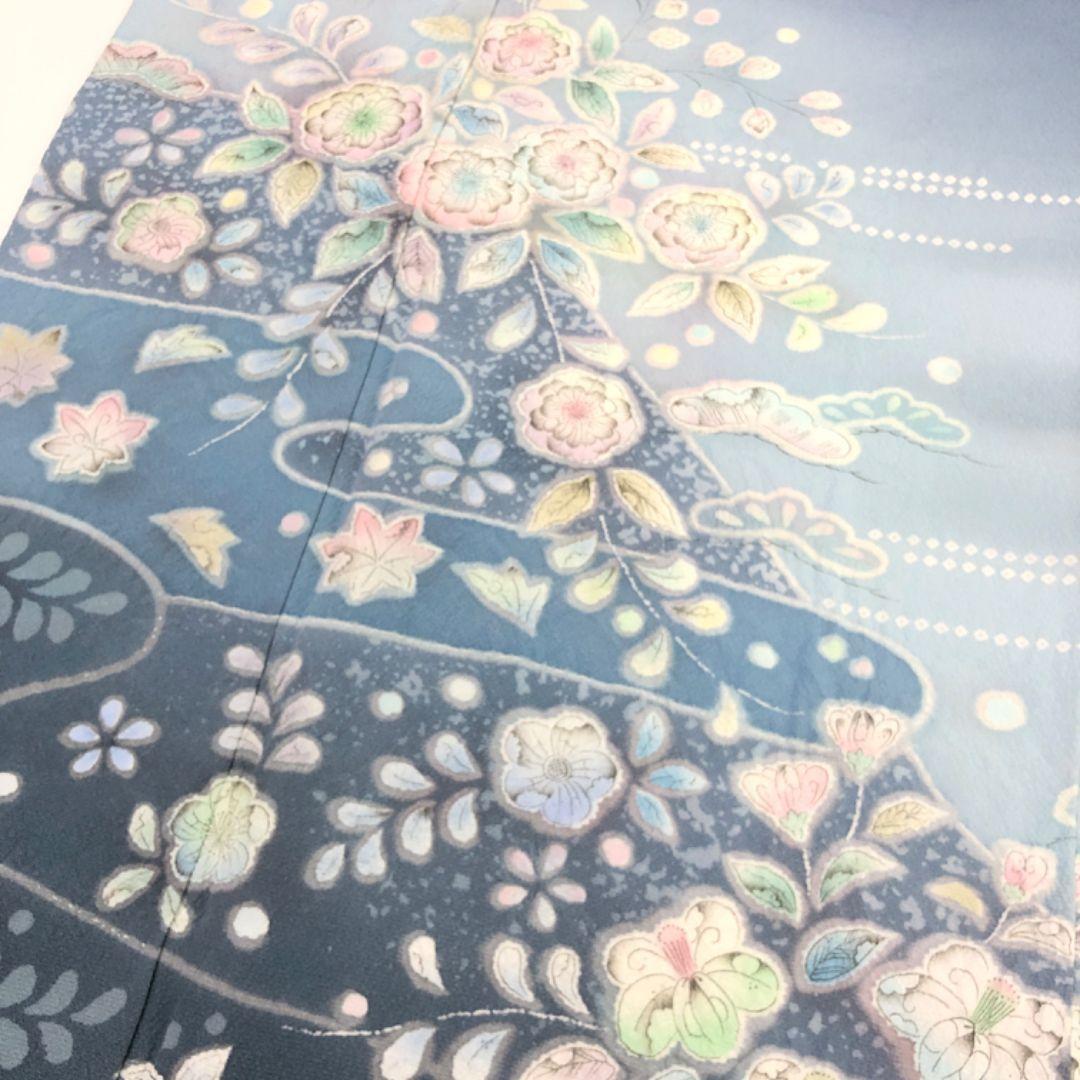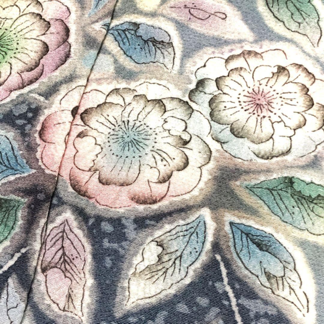 青袋鼠色の品のあるお色味に暈し、 霧模様に美しい辻が花絞りがデザインされた素敵な柄裄のお品でございます。