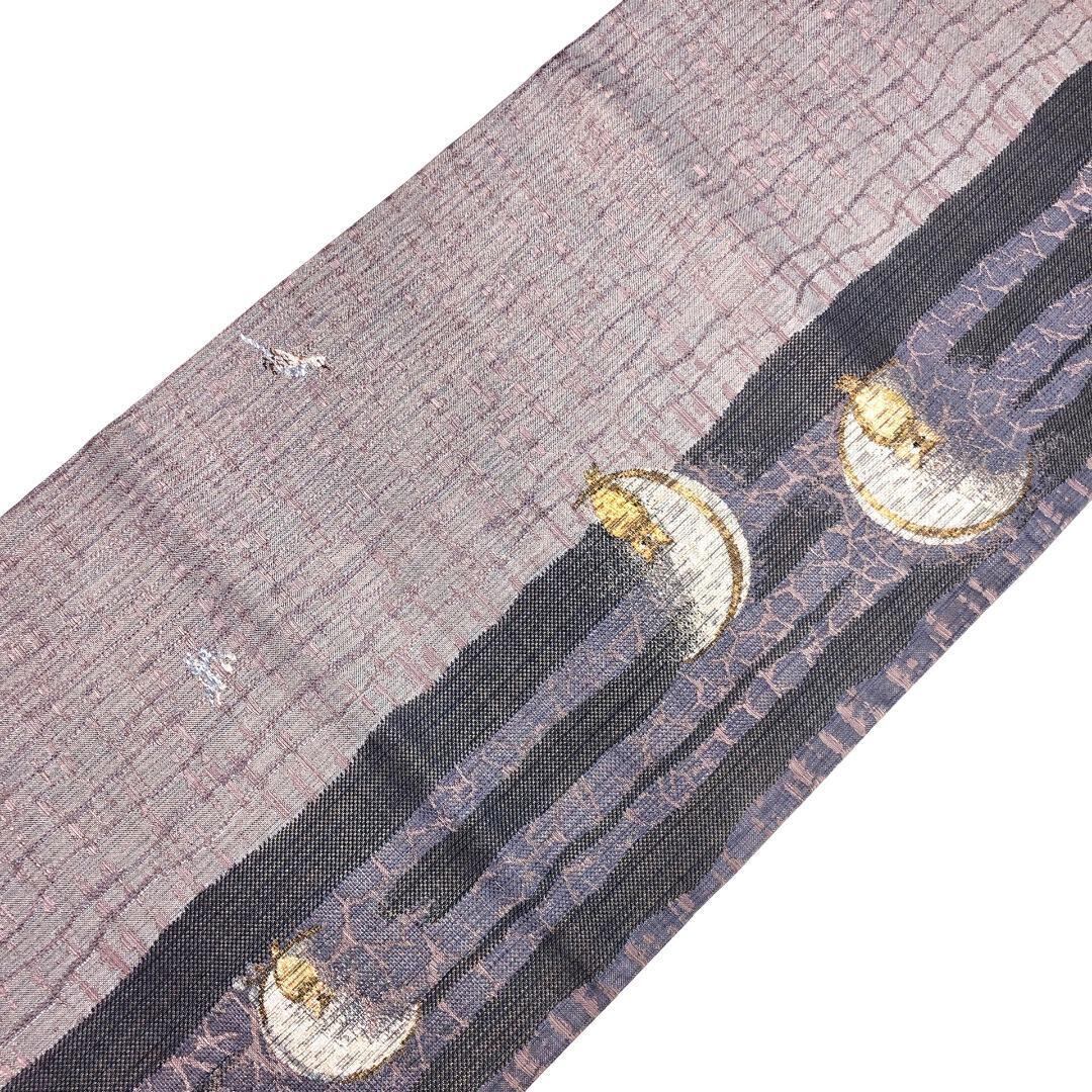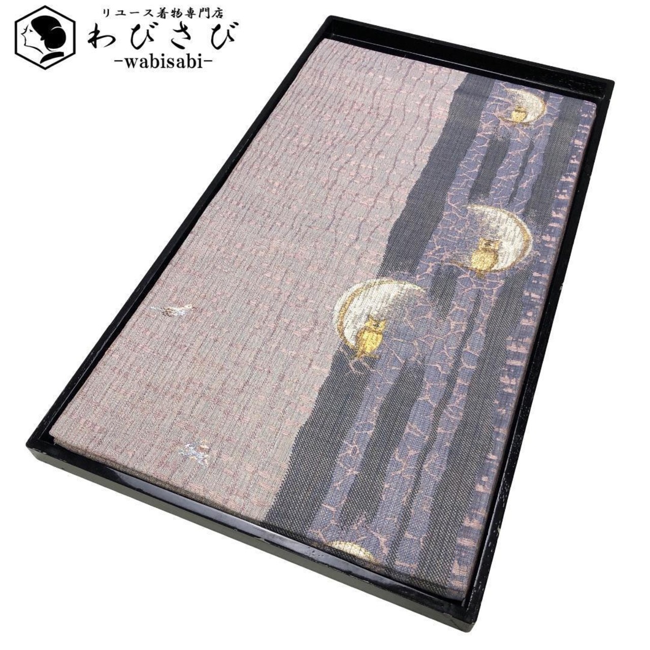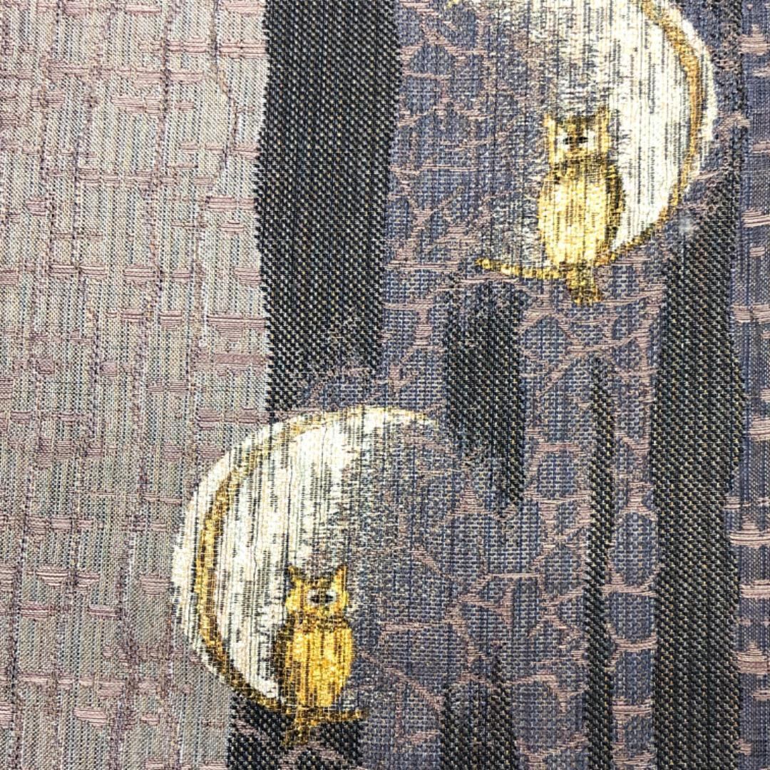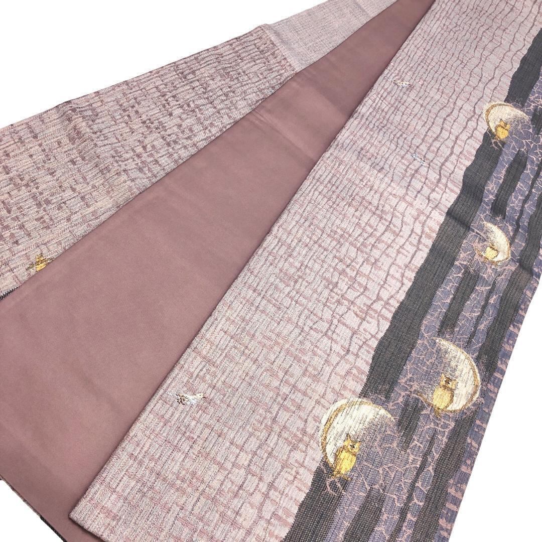 薄梅鼠色ベースのお色味にラテン金、ヨリ箔、月にミミズク、うさぎがデザインされた素敵な柄裄のお品でございます。