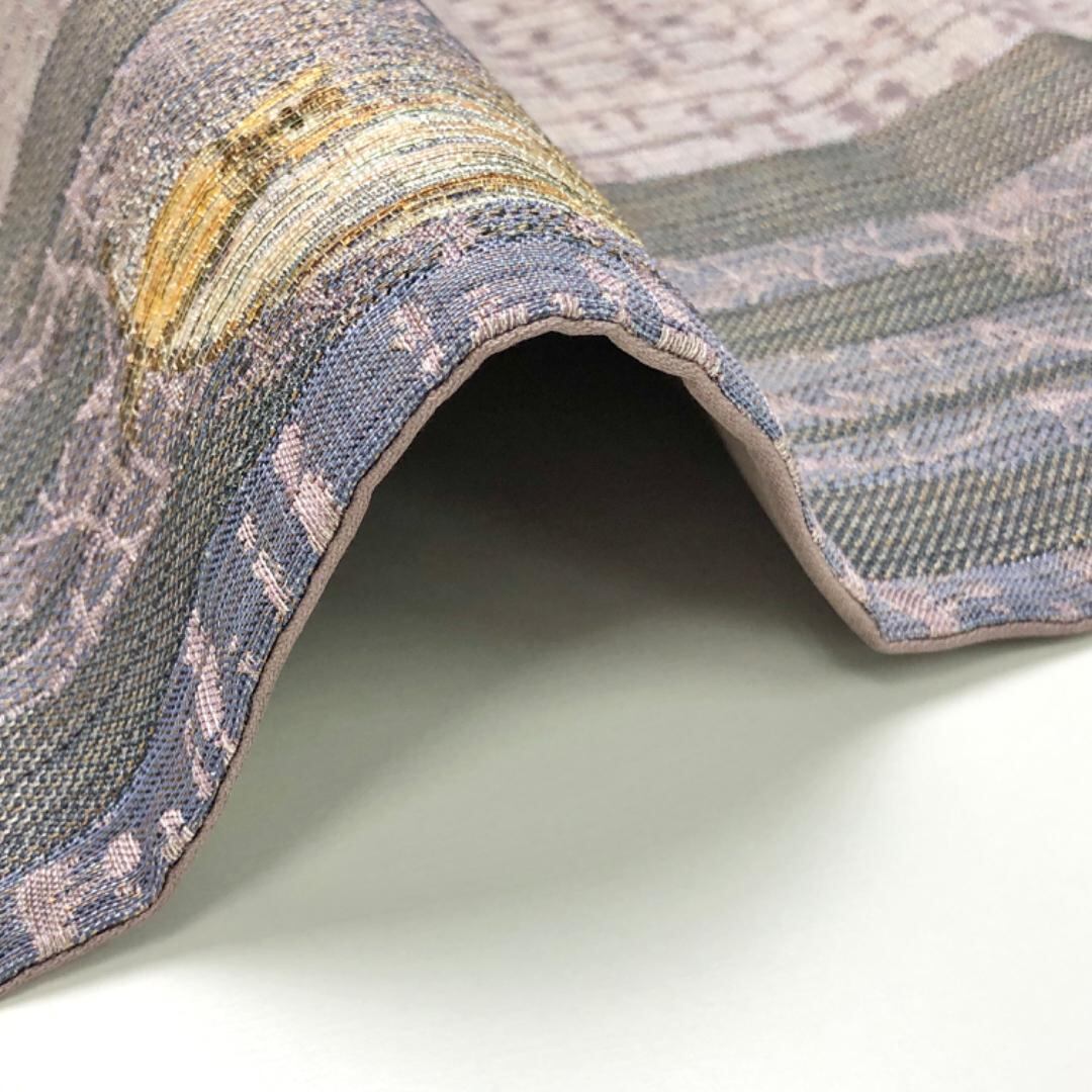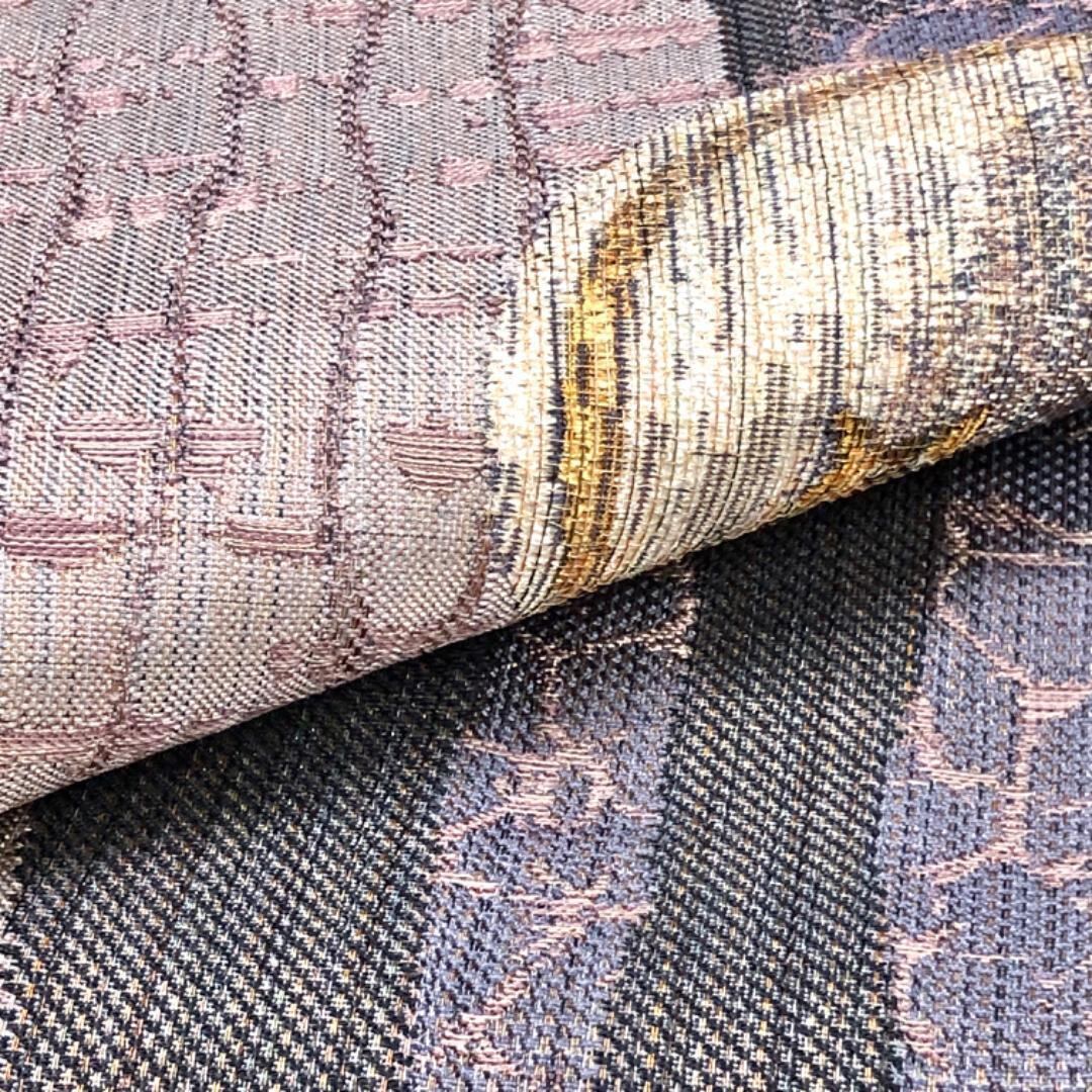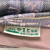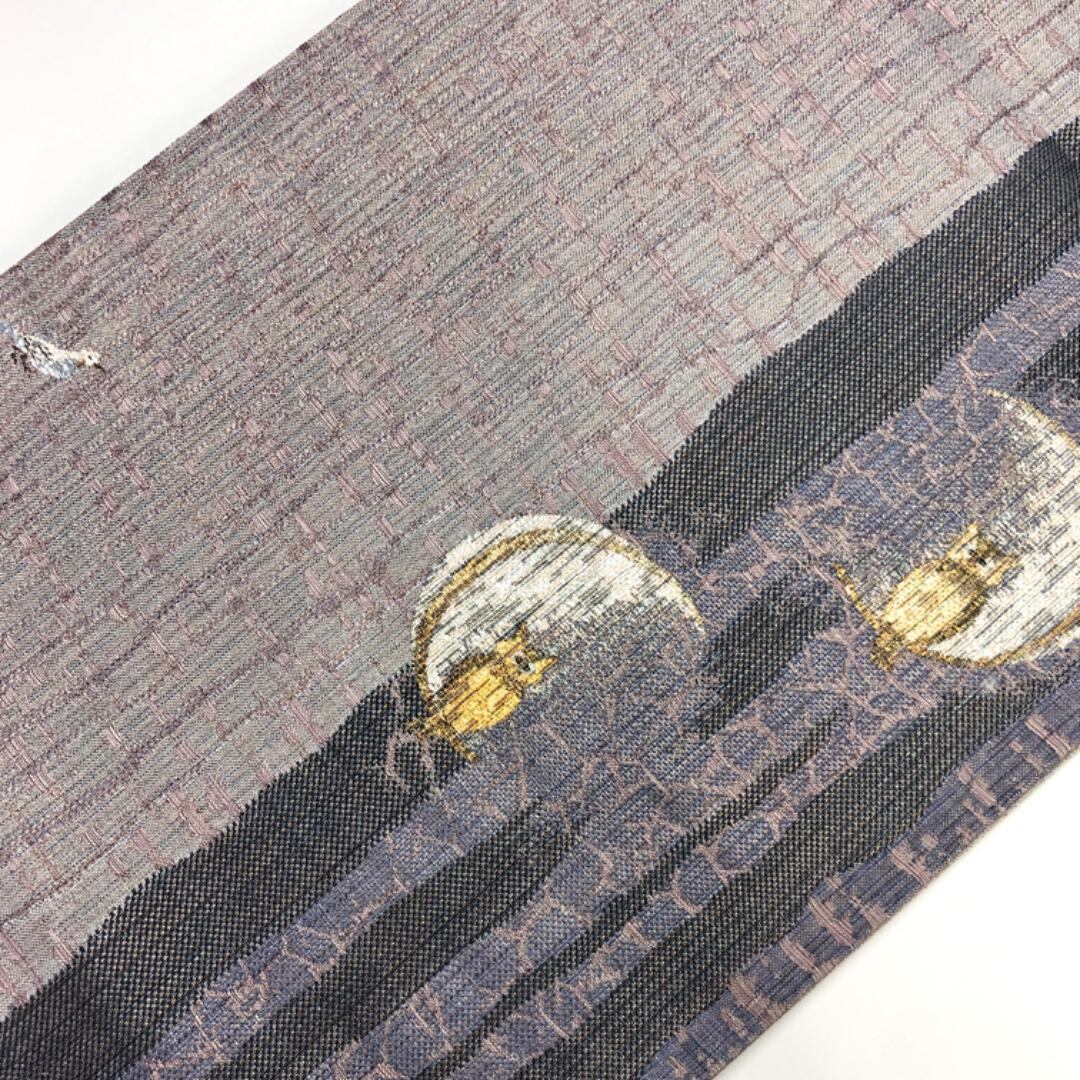 薄梅鼠色ベースのお色味にラテン金、ヨリ箔、月にミミズク、うさぎがデザインされた素敵な柄裄のお品でございます。