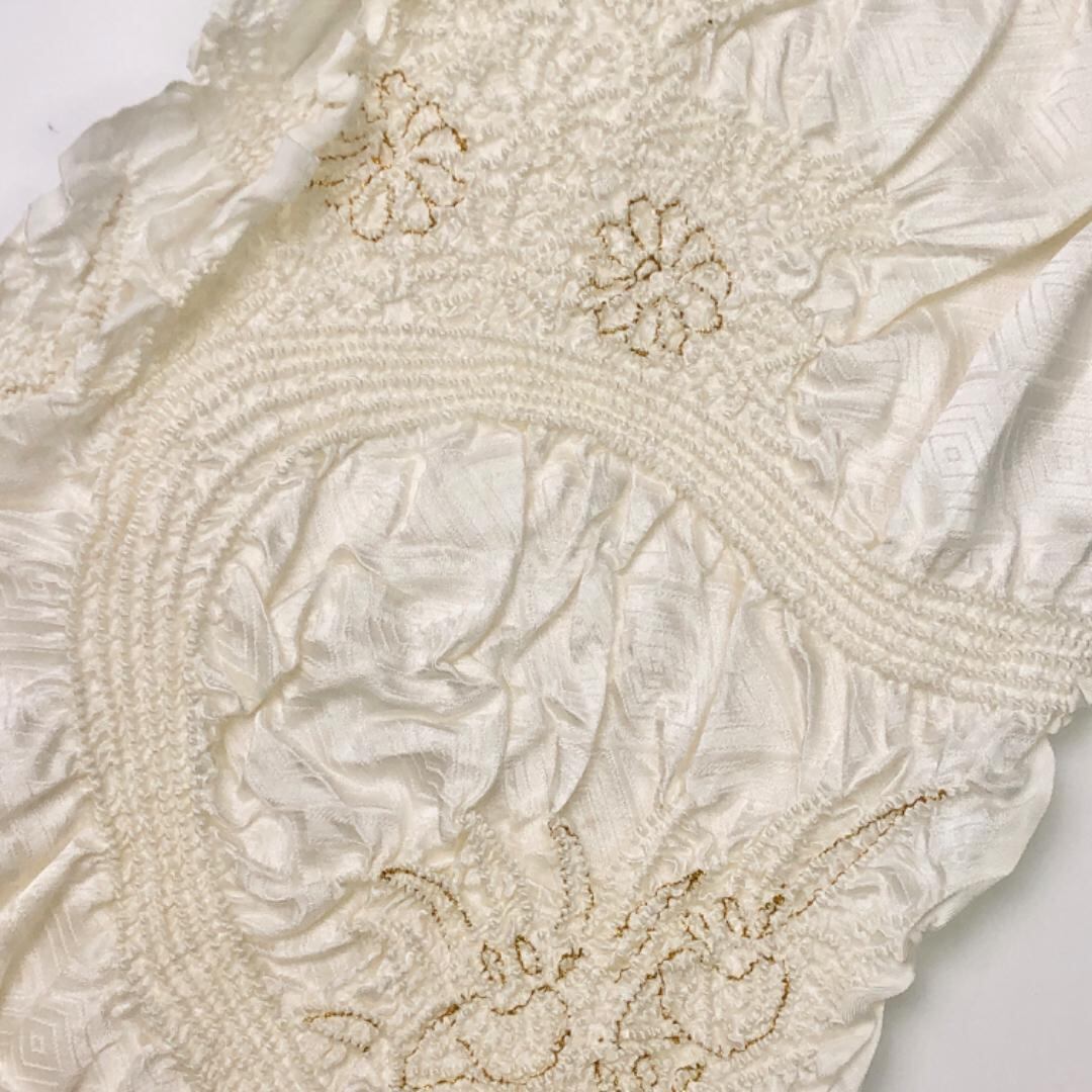 乳白色のお色味に曲線に花模様の柄裄がデザインされた素敵なお品でございます。