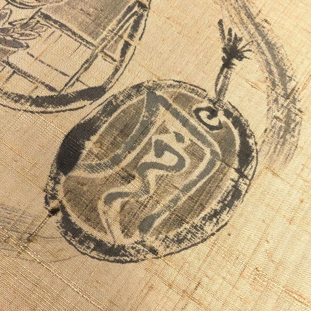 夏帯 名古屋帯 作家物 紬 墨書き 枯野色 O-5091 着物 きもの kimono 和服 和装 中古 リサイクル着物 【送料無料】