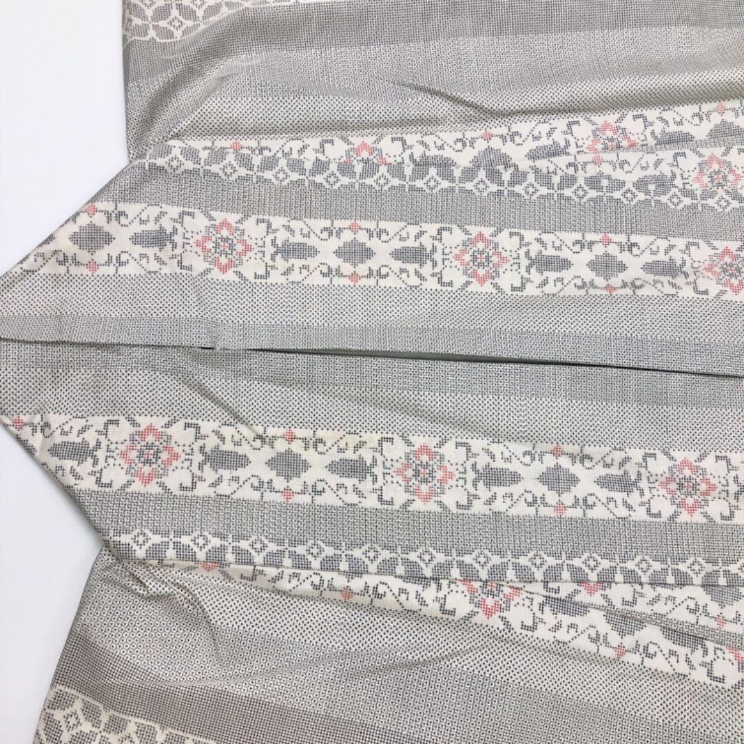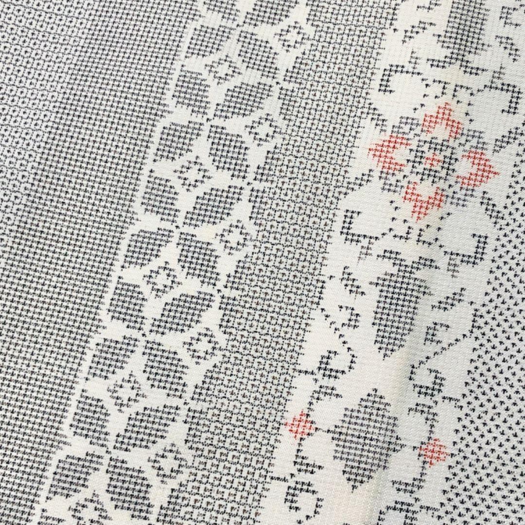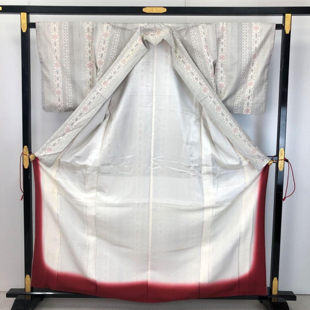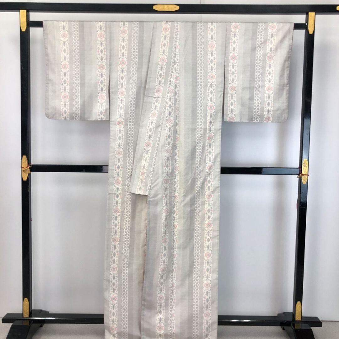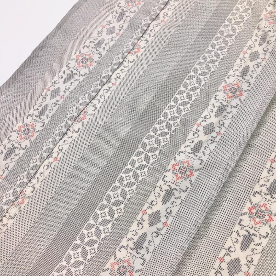 乳白色の上品なお色味に縦縞華柄模様の柄裄がデザインされた素敵なお品でございます。
