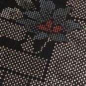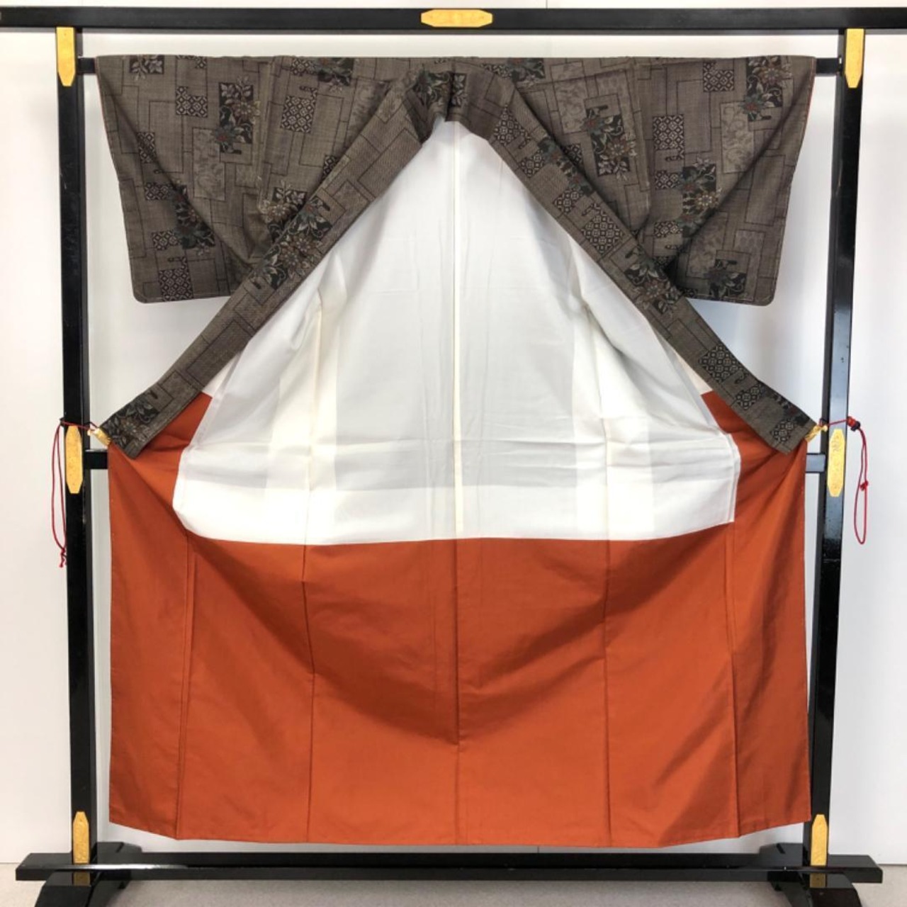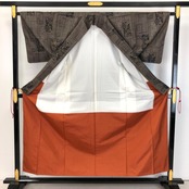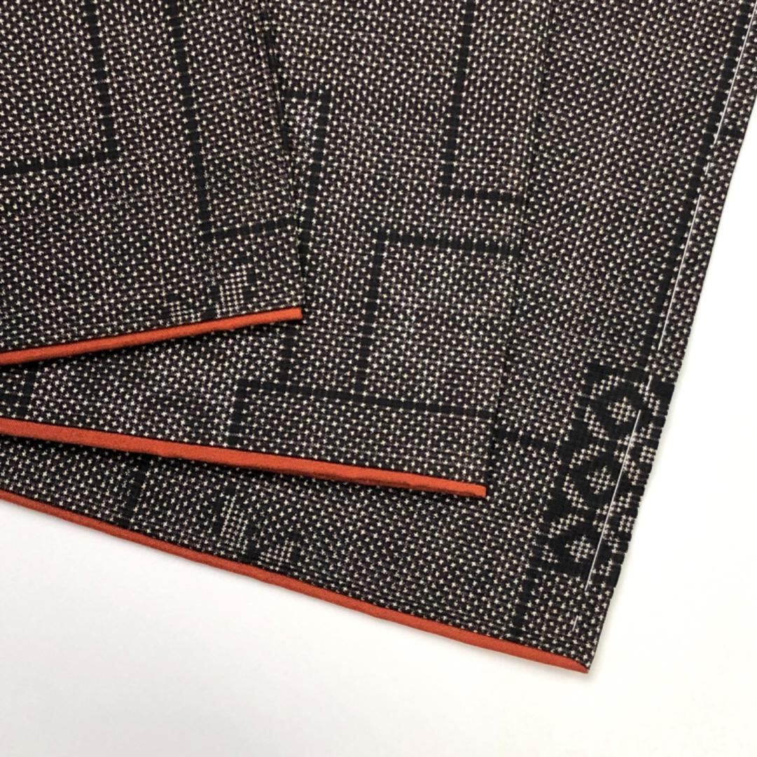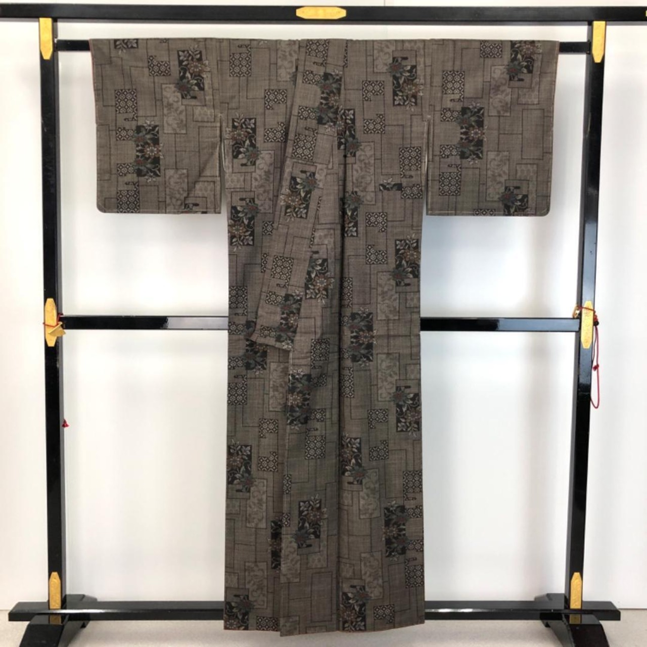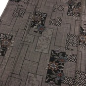 古代染色純泥染の雰囲気の良いお色味、四角に花柄模様がデザインされた素敵な柄裄のお品でございます。