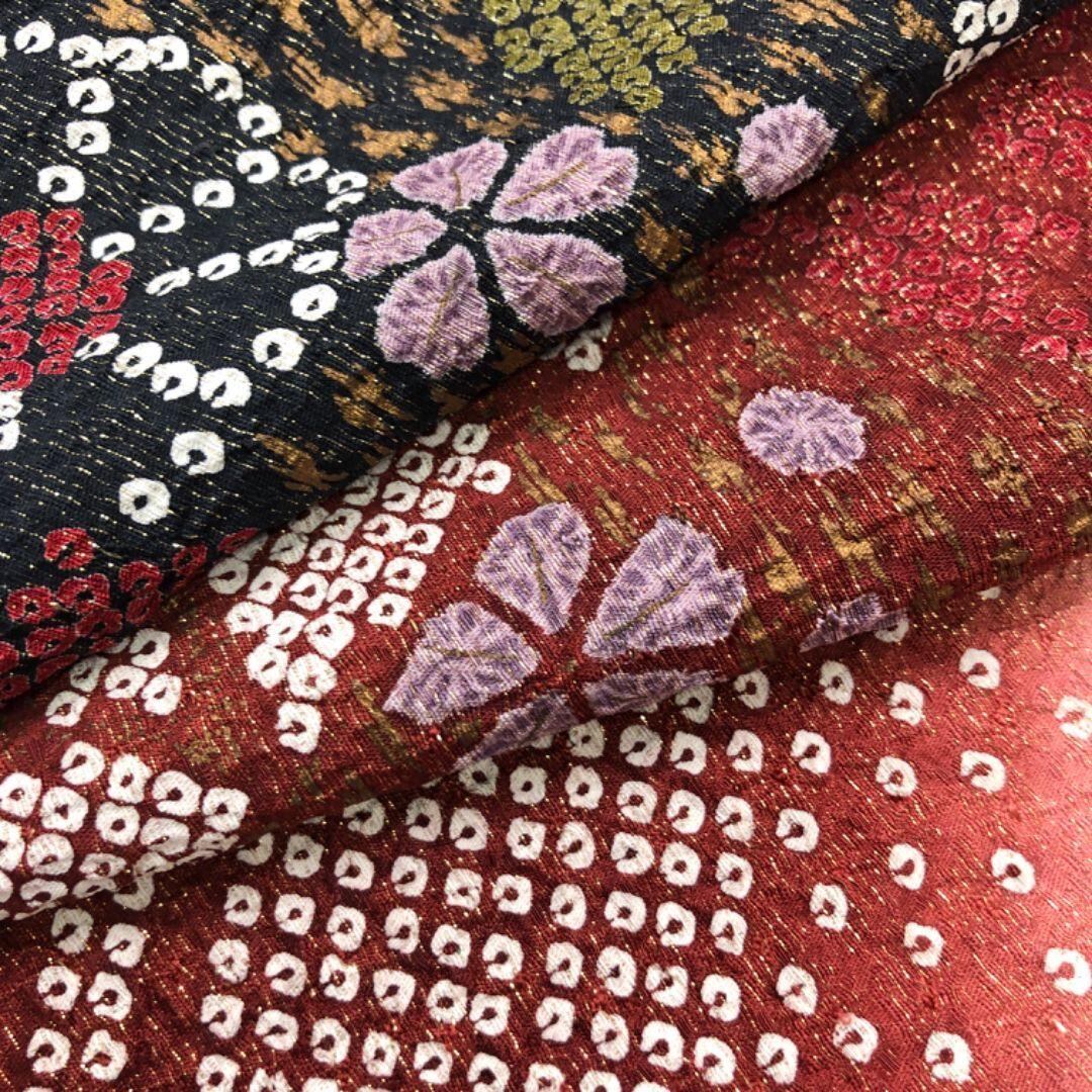 海老赤色のお色味に金通し、流れるようなデザインの鹿の子模様に美しい花柄、華やかな柄裄の素敵なお品でございます。