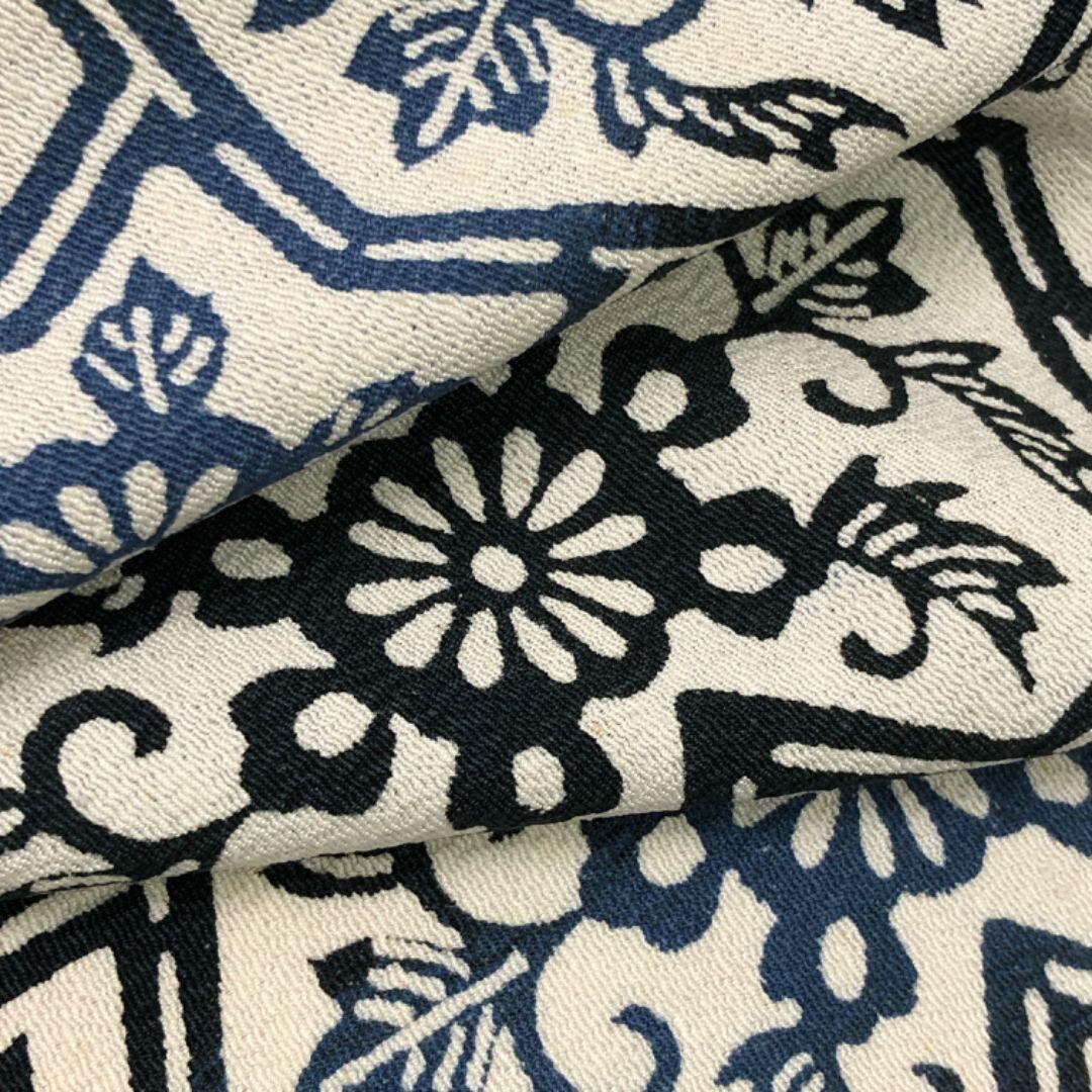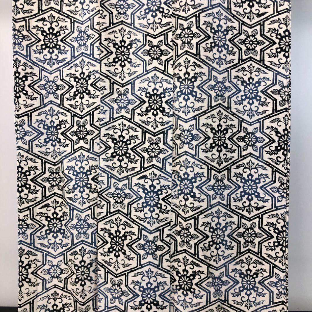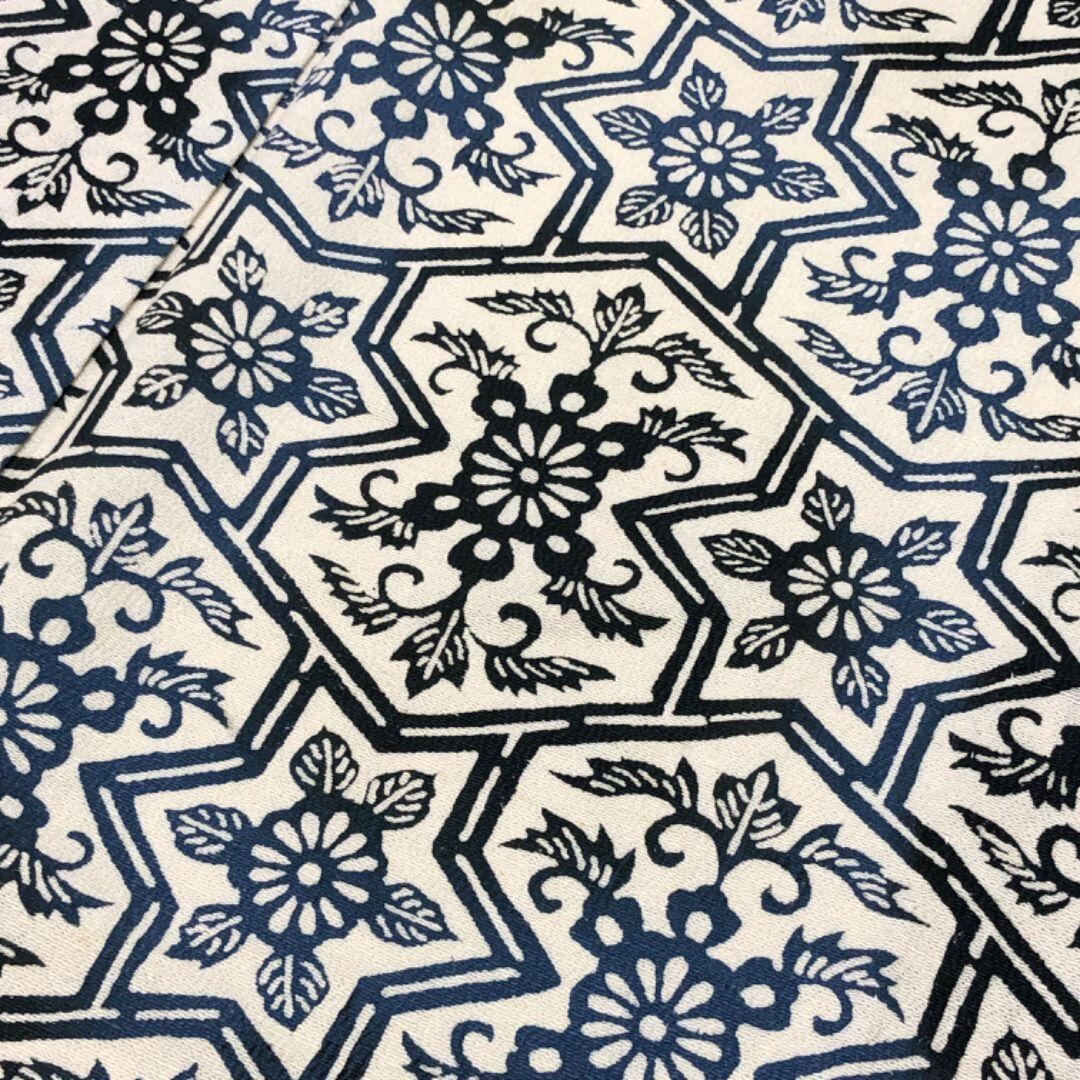 胡粉色ベースのお色味、六芒星に花唐草模様の色味の良い柄裄がデザインされた雰囲気の良い素敵なお品でございます。