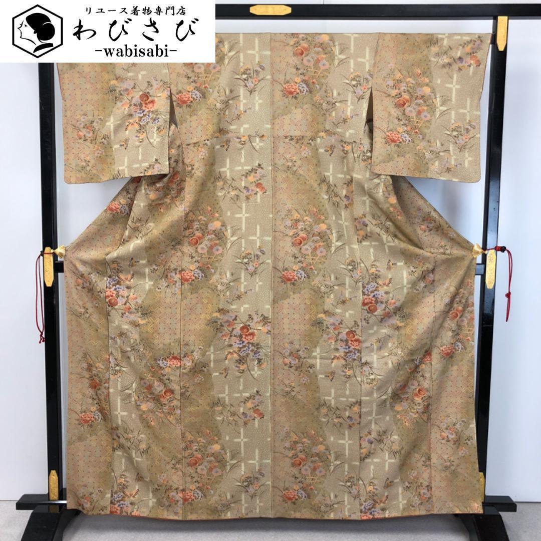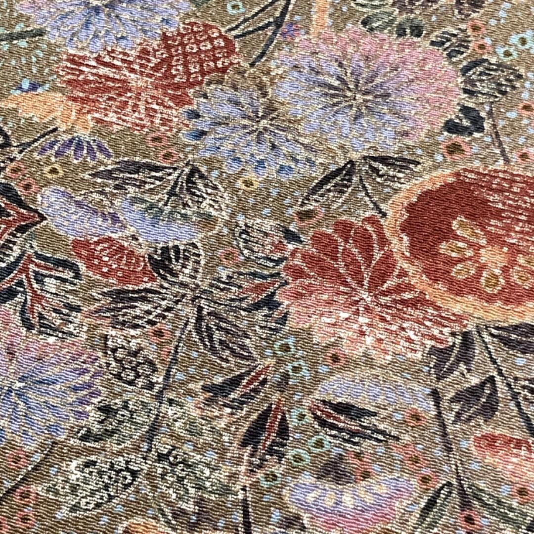 丁子茶色のベースの落ち着いたお色味に、様々な花柄模様、蝶々などの華やかな柄行がデザインされた素敵なお品でございます。