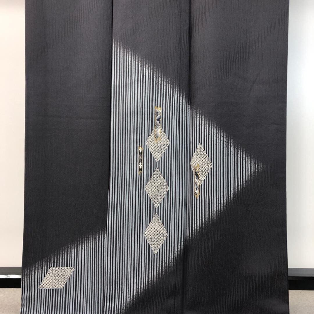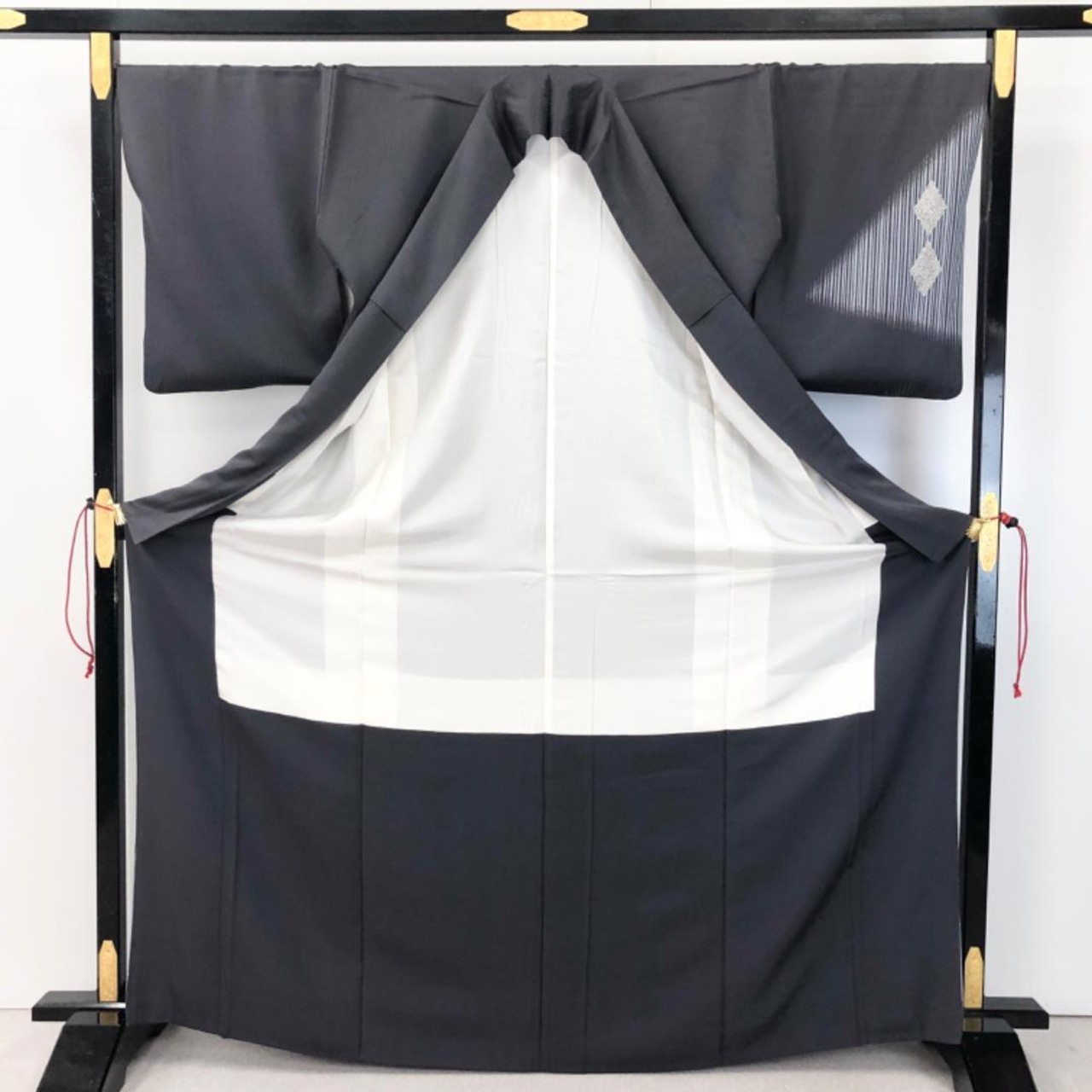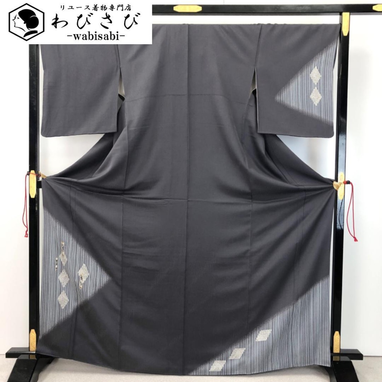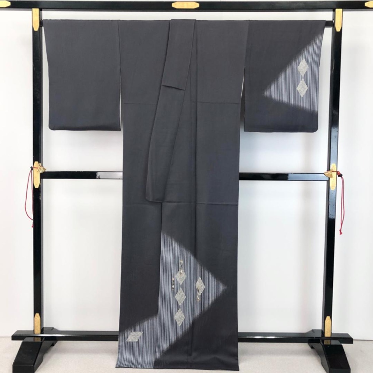 紺鼠色のお色味にモダンな菱模様、一部刺繍の花模様の柄裄がデザインされた素敵なお品でございます。