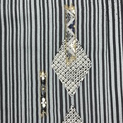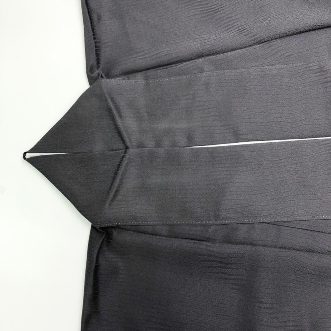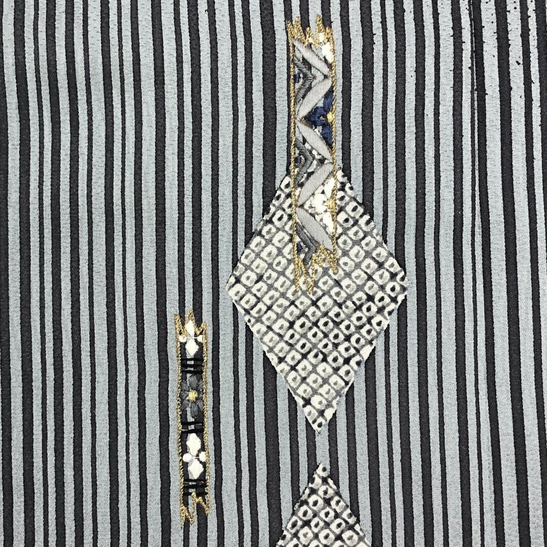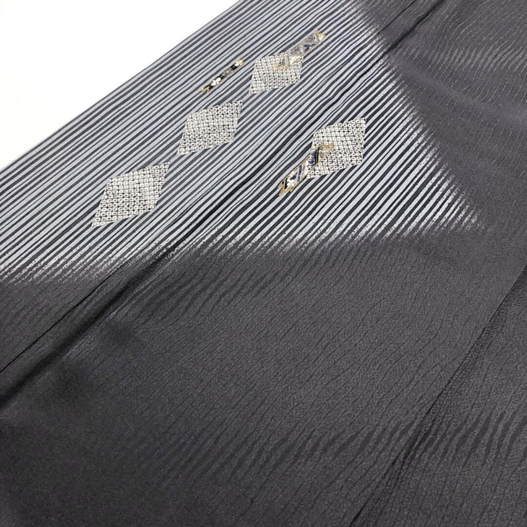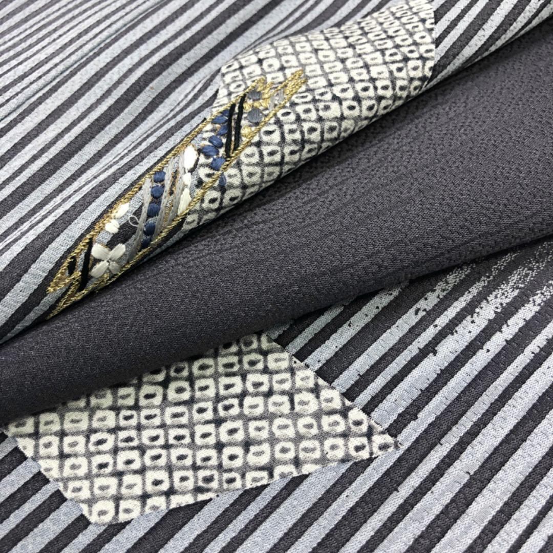 紺鼠色のお色味にモダンな菱模様、一部刺繍の花模様の柄裄がデザインされた素敵なお品でございます。