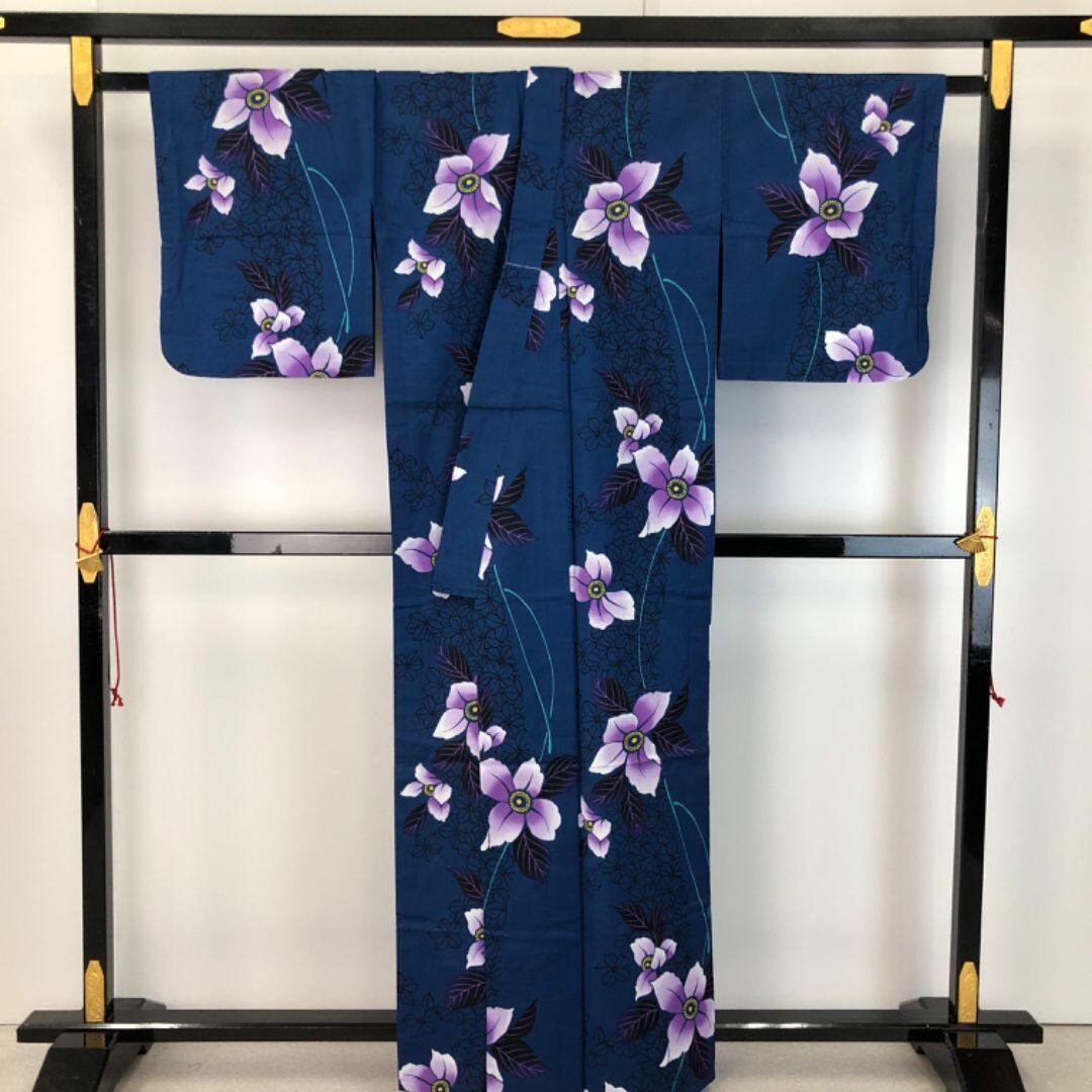 夏着物 浴衣 花柄模様 紺青色 K-4846 着物 きもの kimono 和服 和装 中古 リサイクル着物 【送料無料】