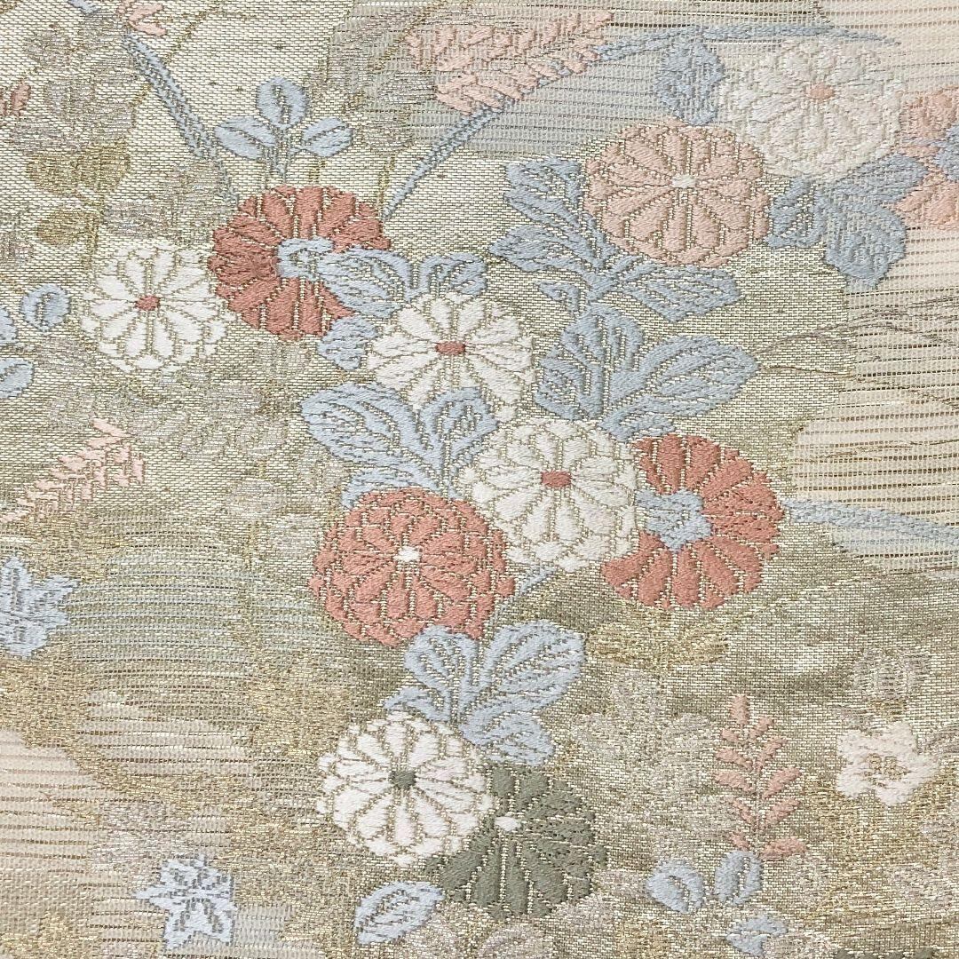 夏帯 袋帯 路 霞に花模様 乳白色 金銀糸 O-5085 着物 きもの kimono 和服 和装 中古 リサイクル着物 【送料無料】