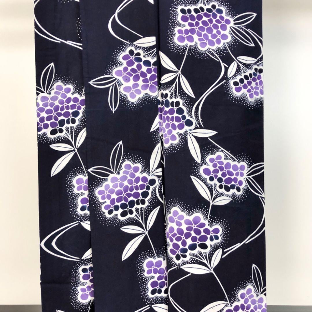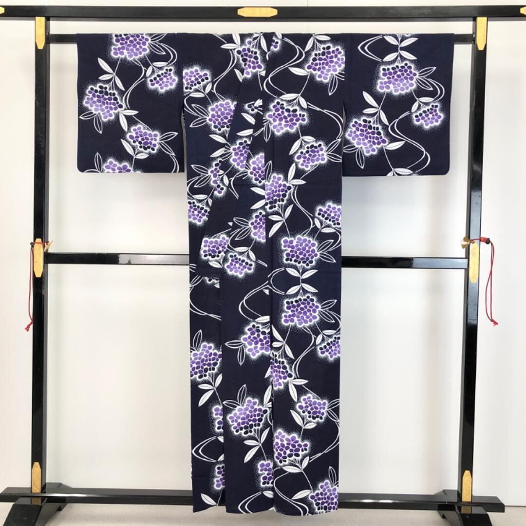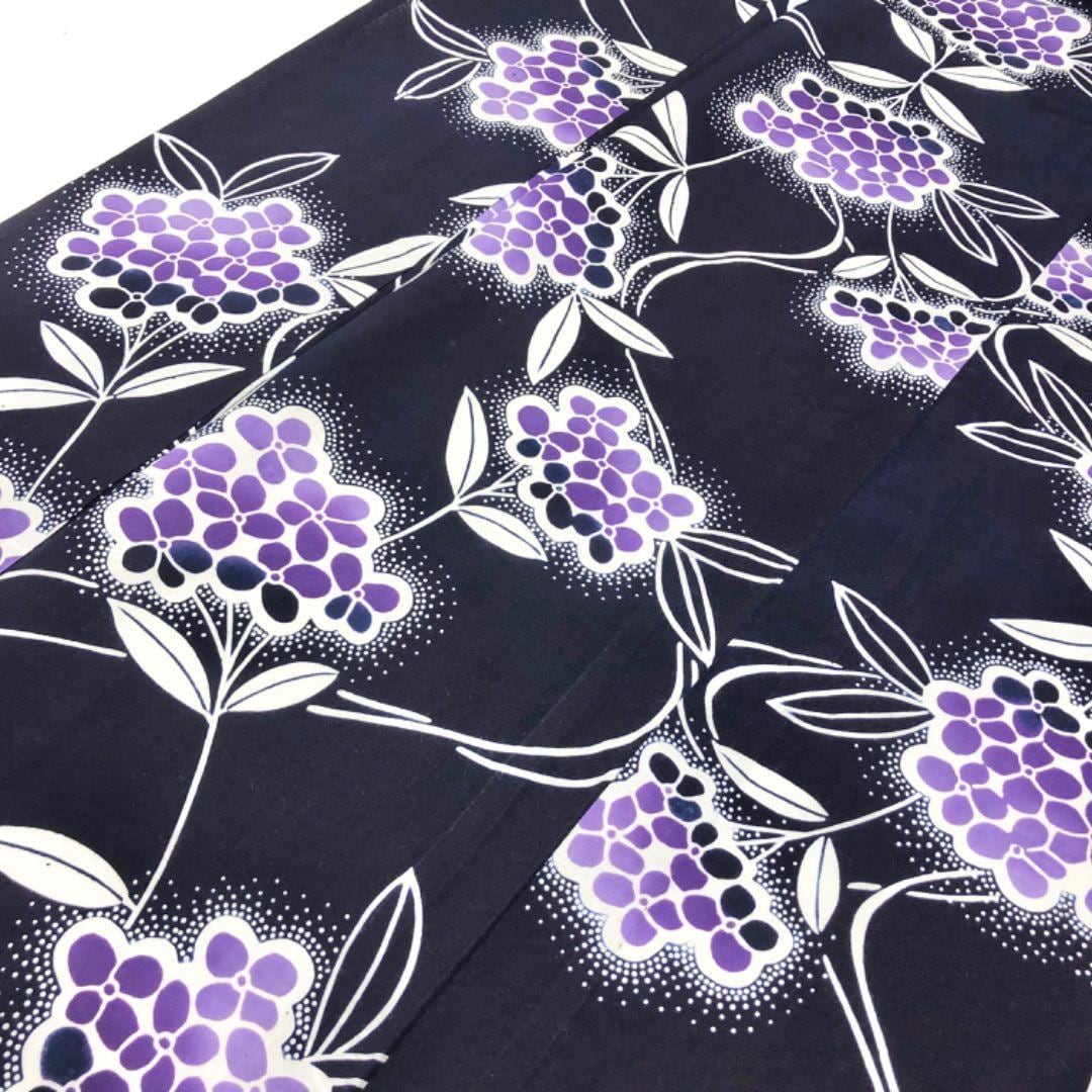緋紺色のお色味に美しい花模様の柄裄がデザインされた素敵なお品でございます。
