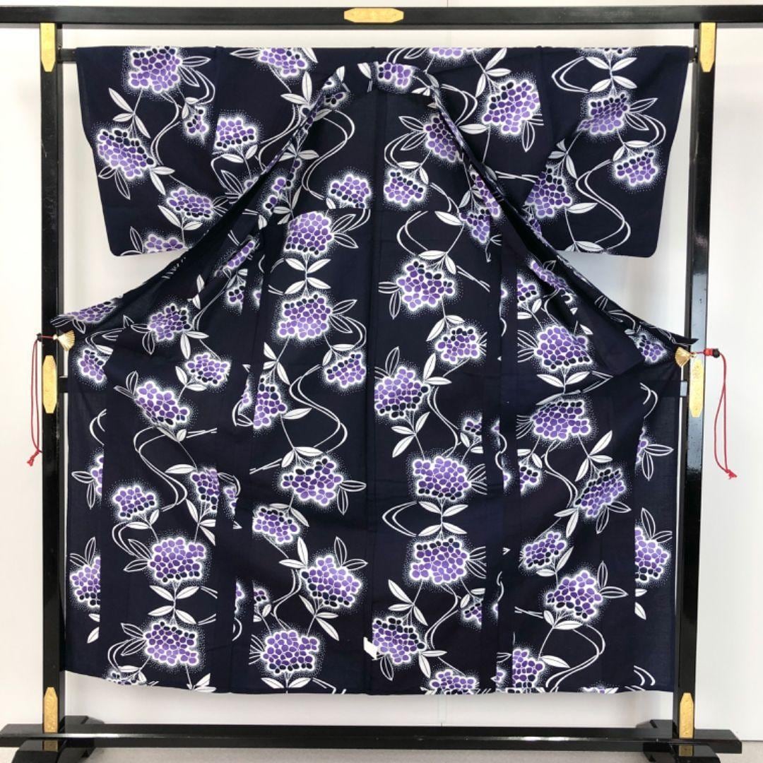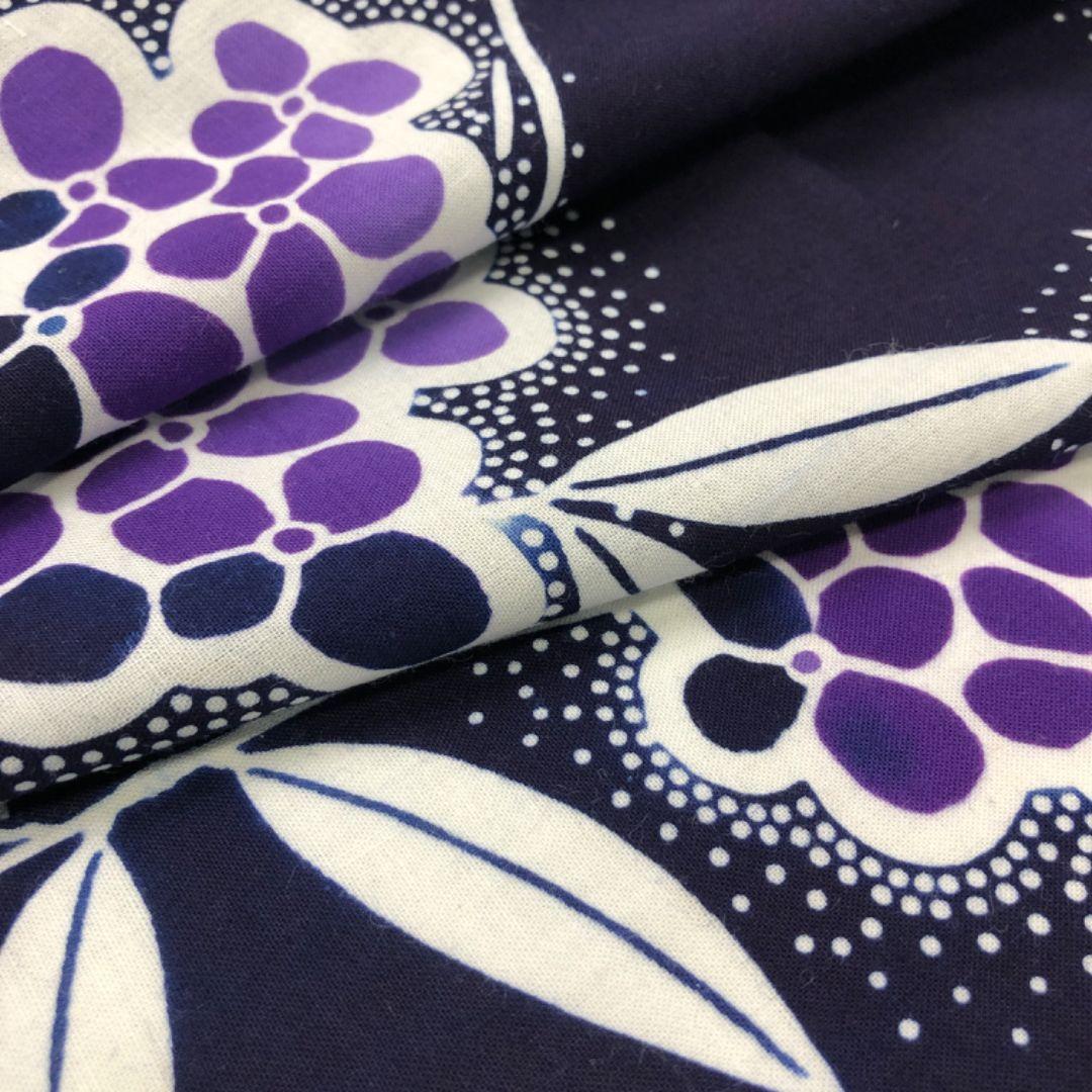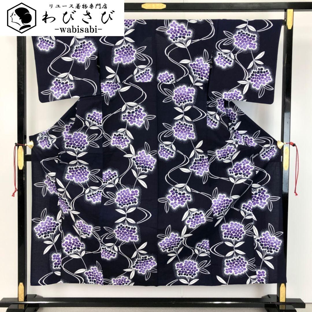 緋紺色のお色味に美しい花模様の柄裄がデザインされた素敵なお品でございます。